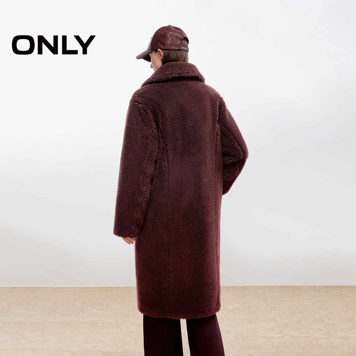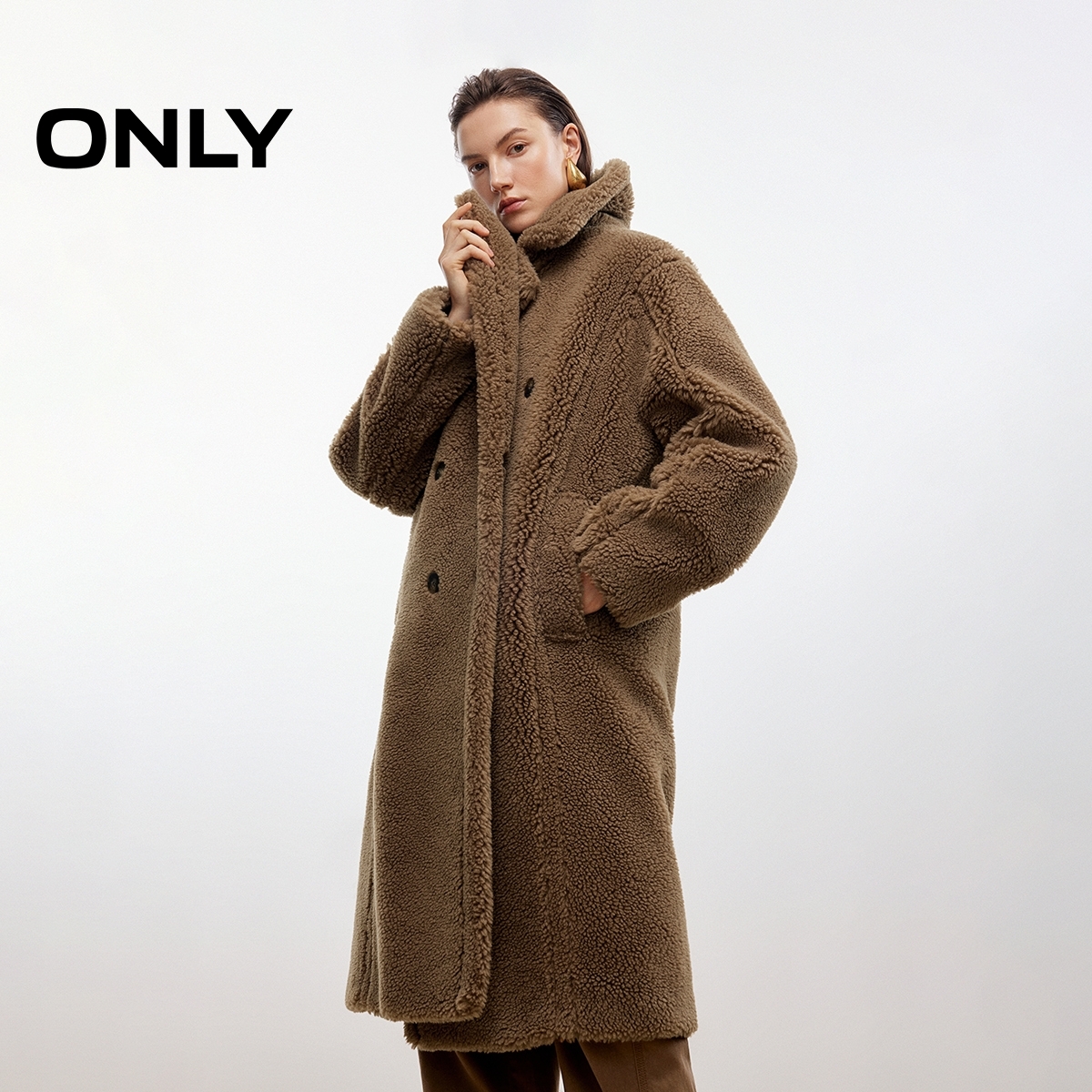 仿泰迪熊毛呢大衣女 双排扣宽松翻领纯色中长款 ONLY2025冬季 新款