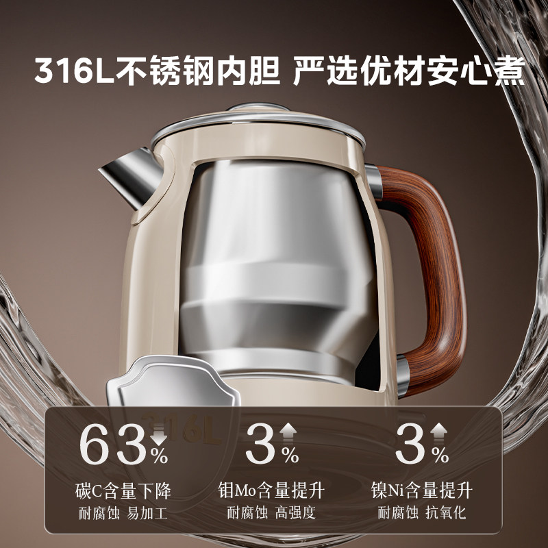 美 电热水壶316L不锈钢食品级家用2L大容量大功率烧水壶2025新款