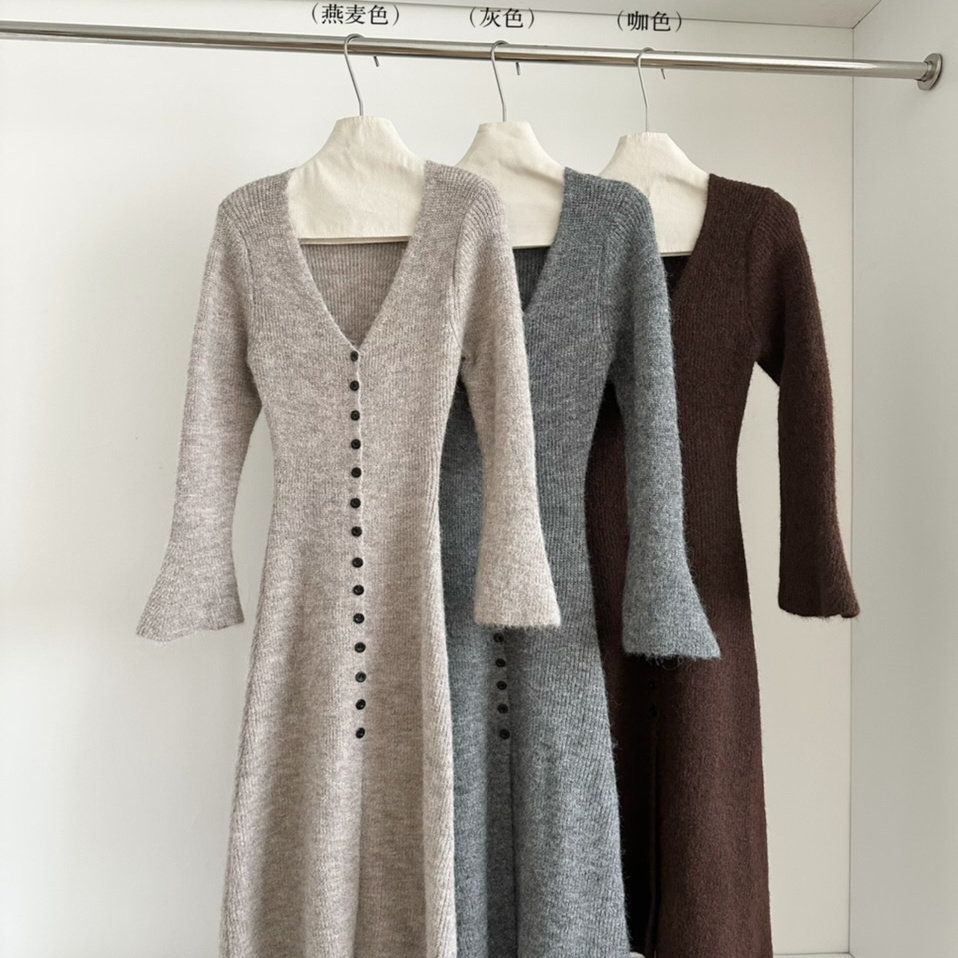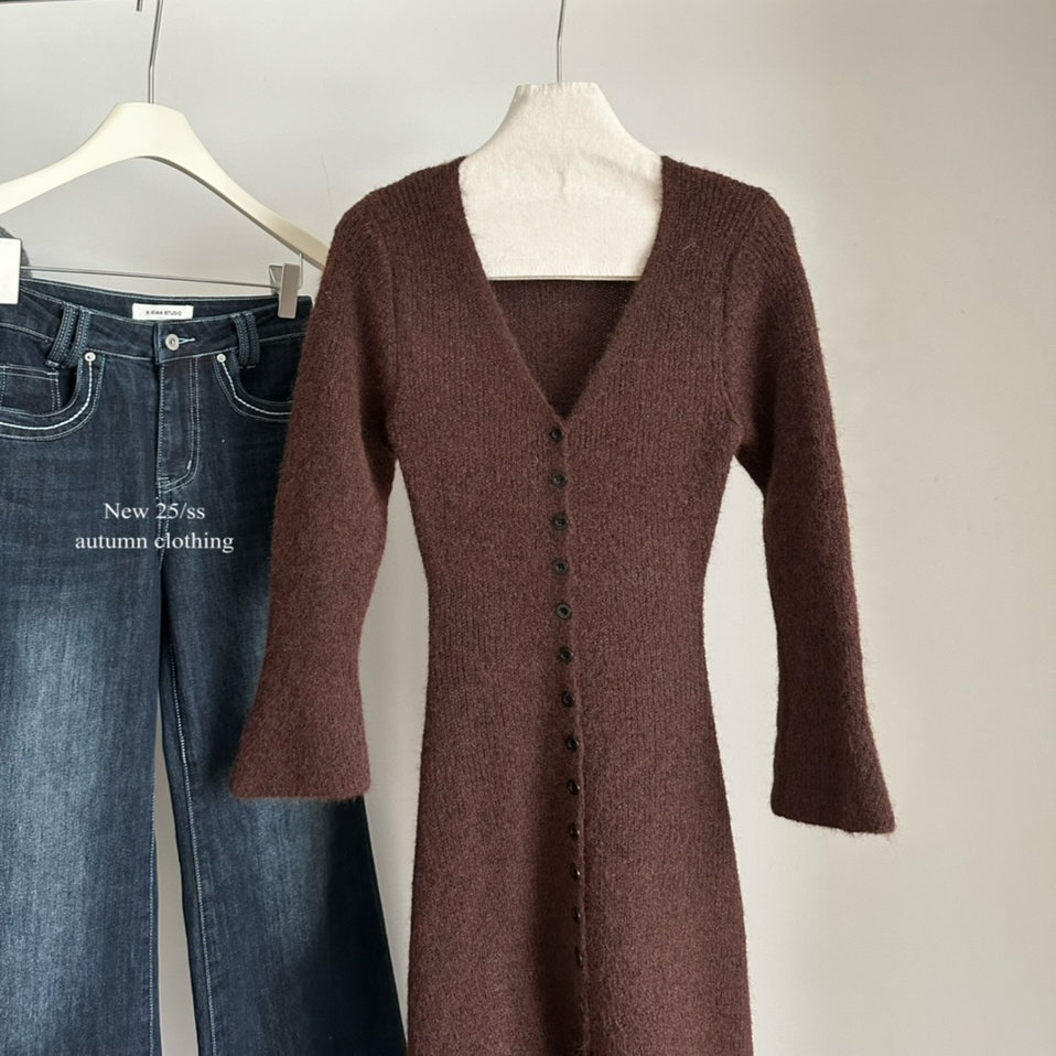 秋冬高级感法式 棕色针织内搭长裙 气质V领显瘦毛衣连衣裙女中长款
