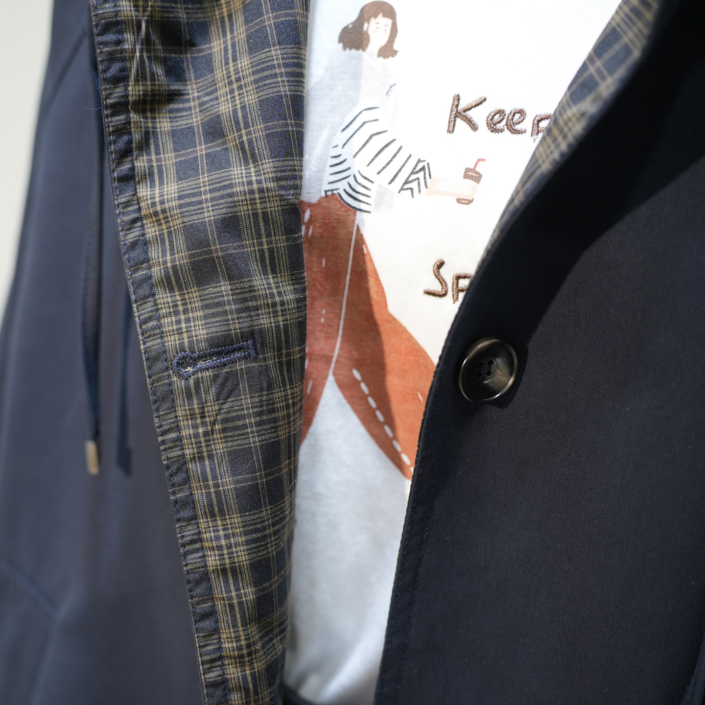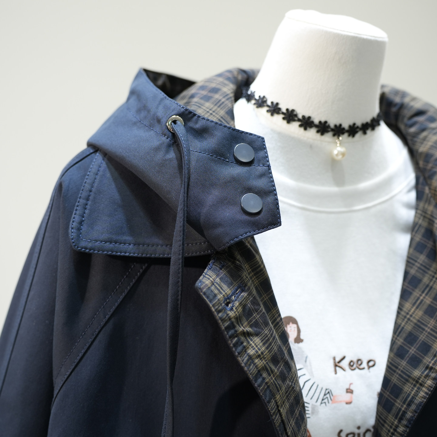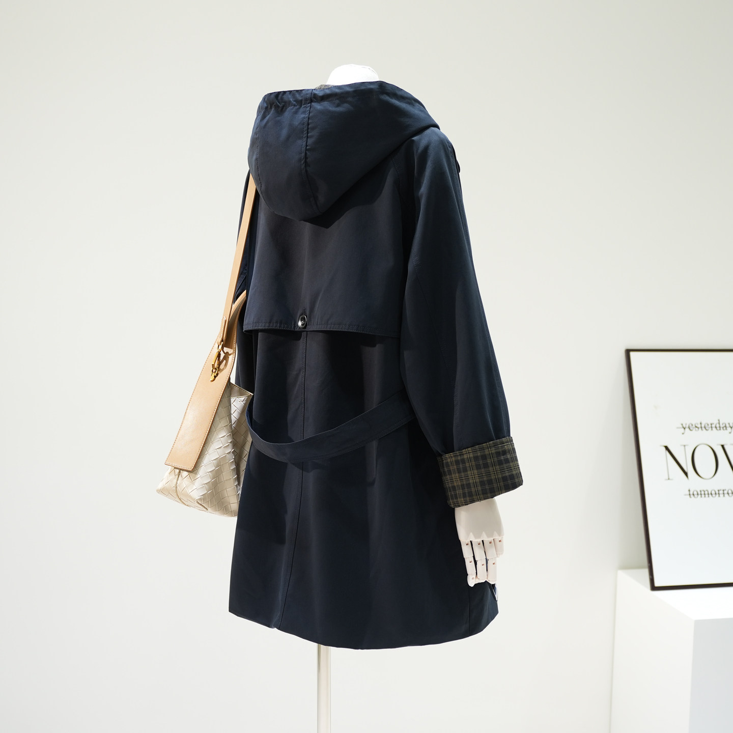 韩系宽松百搭外套 新款 设计感拼格子翻边袖 收腰连帽风衣女2025秋季