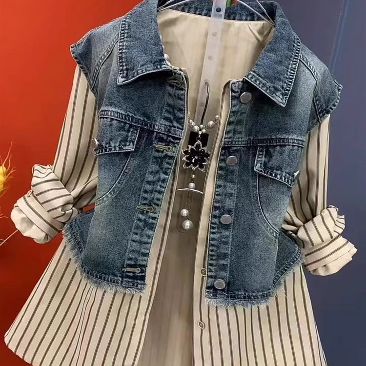 宽松遮肉长袖 时尚 韩版 外套春秋季 衬衣 范洋气水洗牛仔拼接条纹衬衫