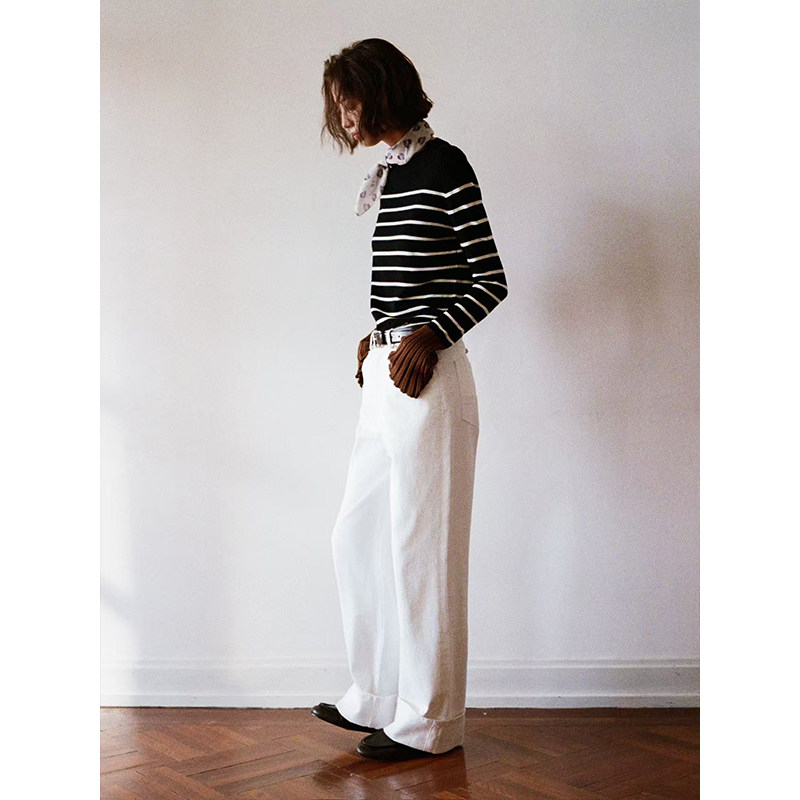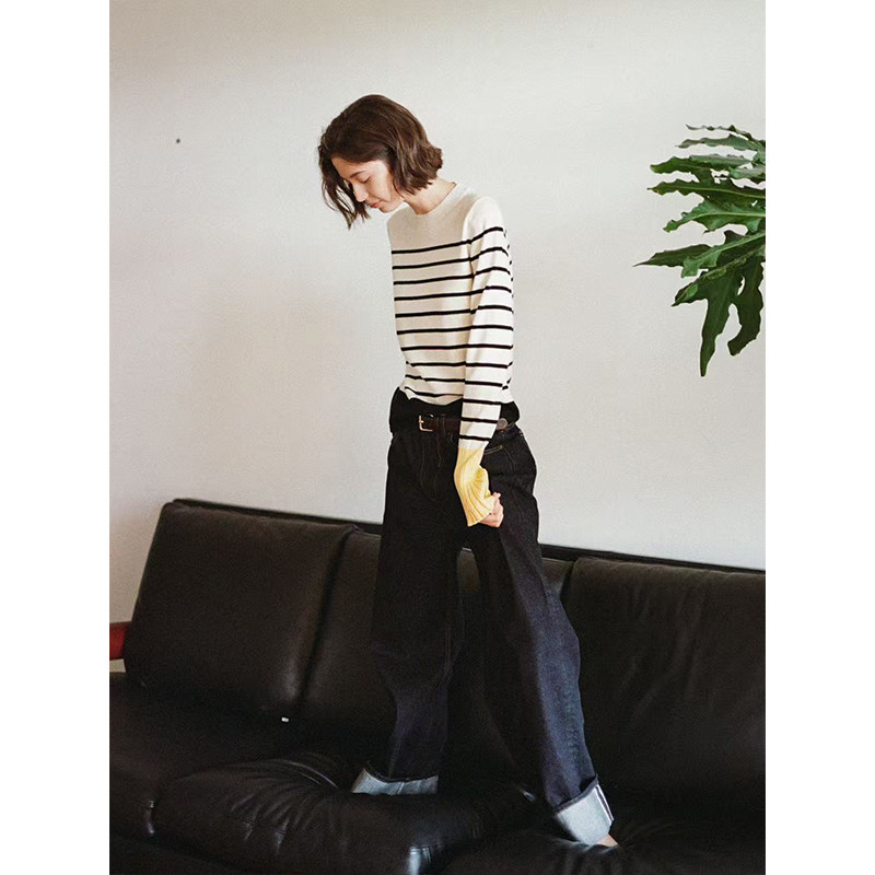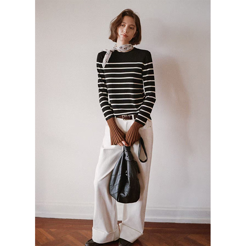 条纹撞色袖 Even 黑白经典 100%美利奴羊毛 口针织上衣 Vintage