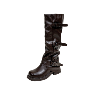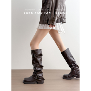 真皮版 管靴大筒围 美拉德长筒靴女复古英伦厚底胖mm褶皱堆堆裤