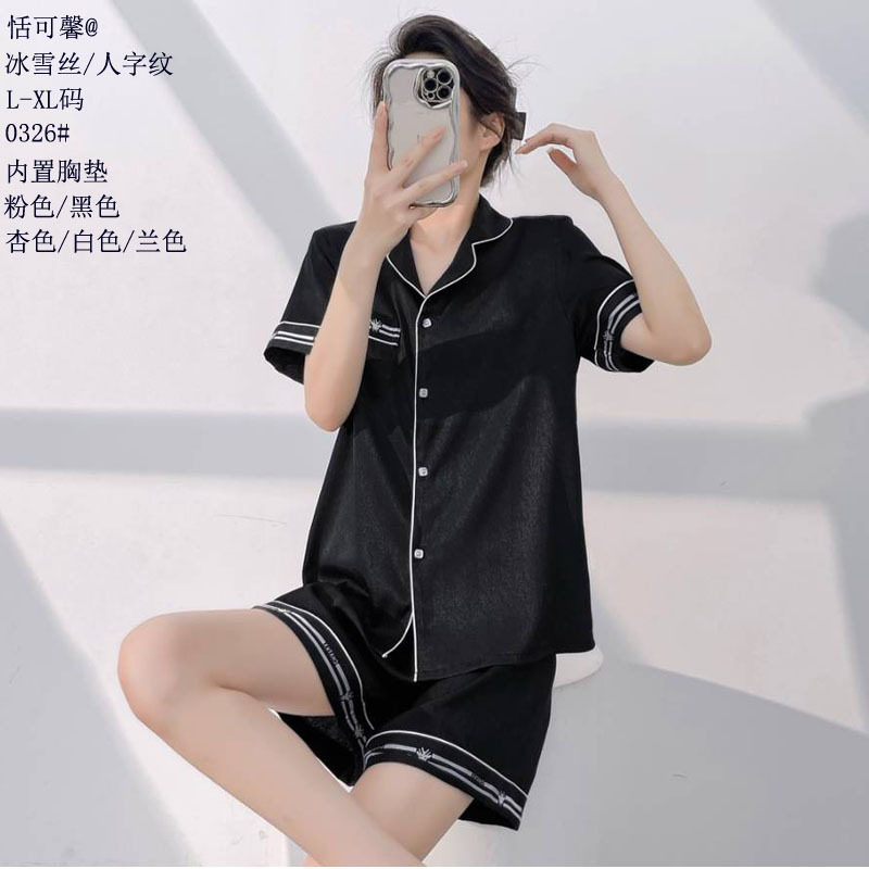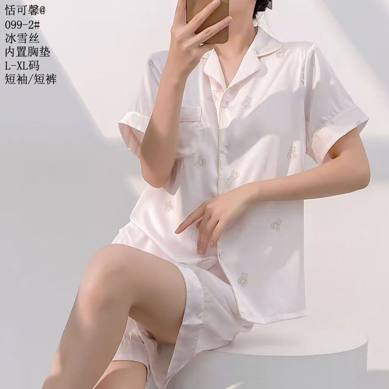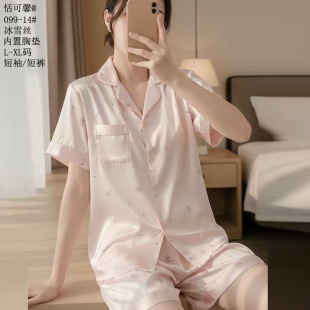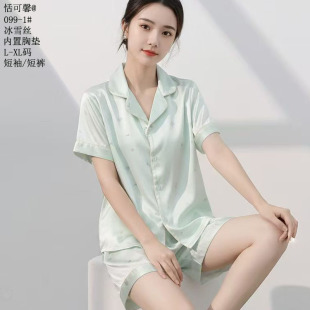 恬可馨冰雪丝2026冰丝人字纹睡衣女款 双短内置胸垫家居服 真丝短袖