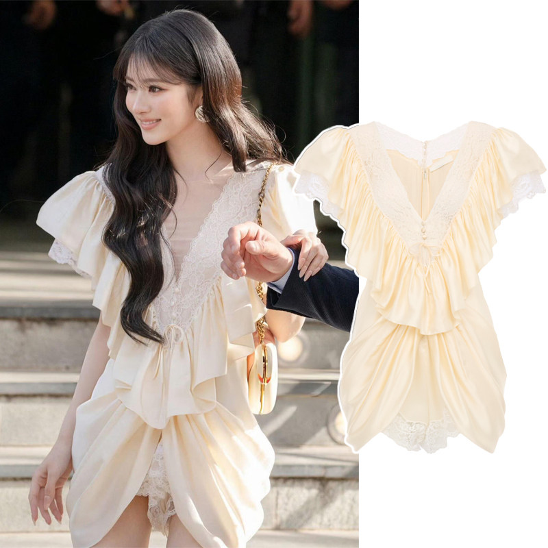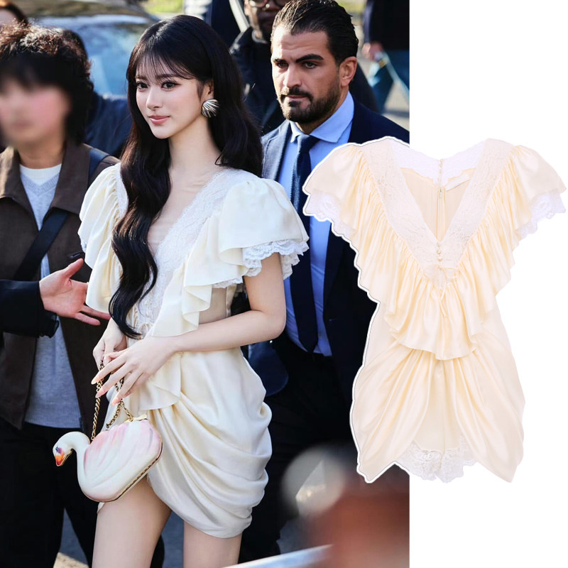 田中杏奈同款 v领蕾丝拼接荷叶边连衣裙女性感收腰包臀礼服裙 法式