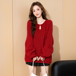 唐狮2026新款 红色毛衣女秋冬红色镂空小众设计感简约气质毛线衫