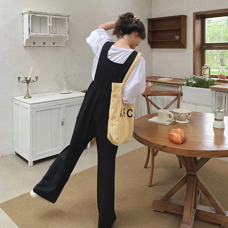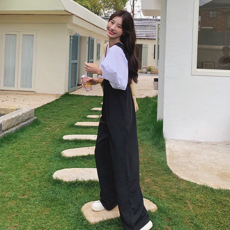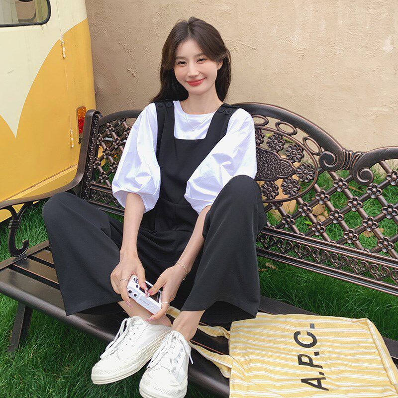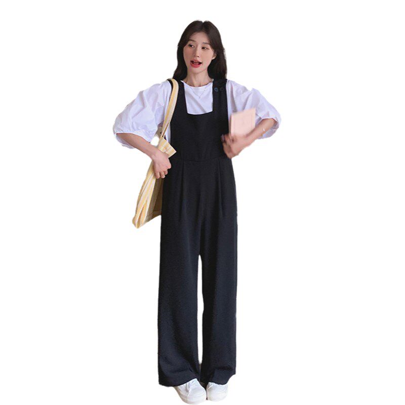 t恤阔腿裤 黑色背带裤 韩系气质减龄泡泡袖 女夏2o025新款 两件套 套装