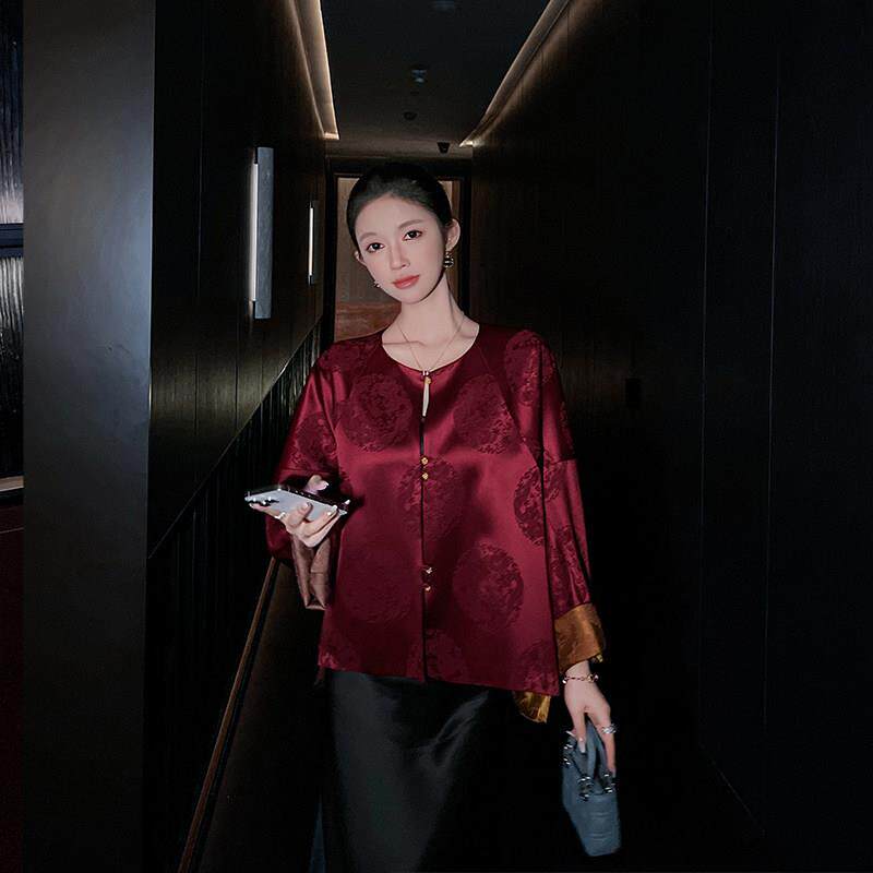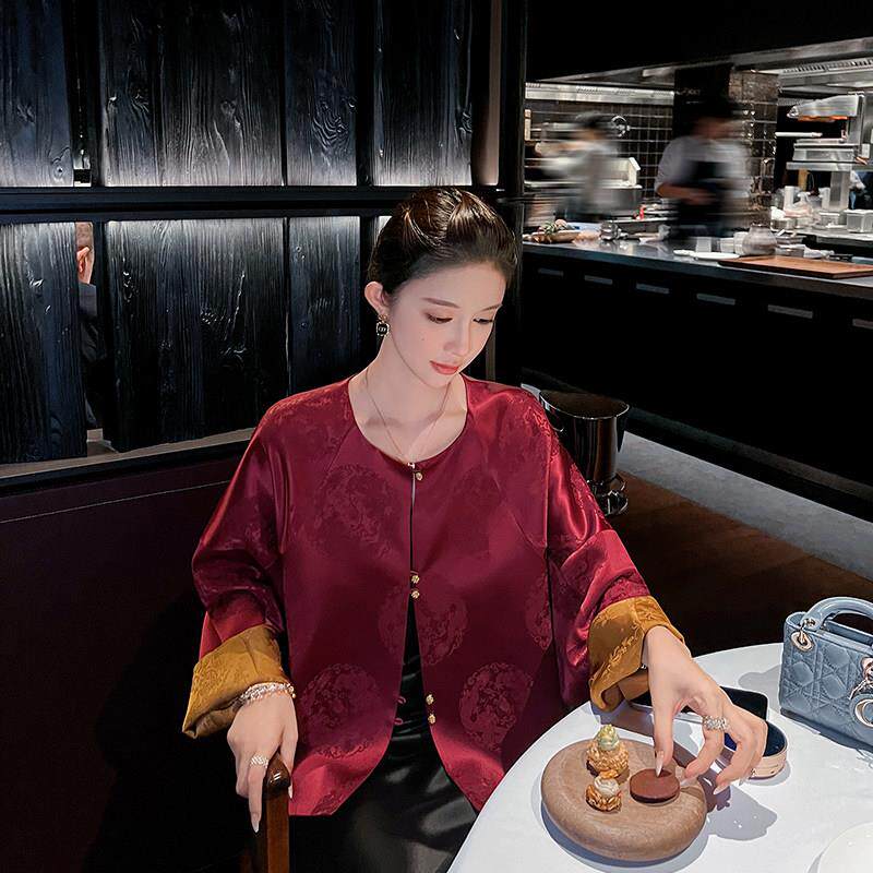 新款 2025年春秋季 暗纹提花通勤气质上衣 国风短外套女装 红色新中式