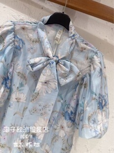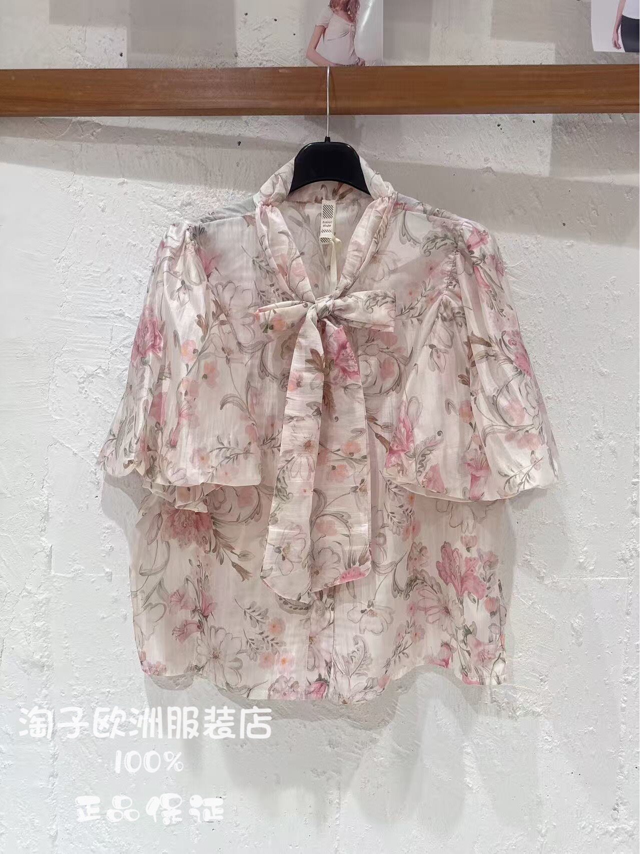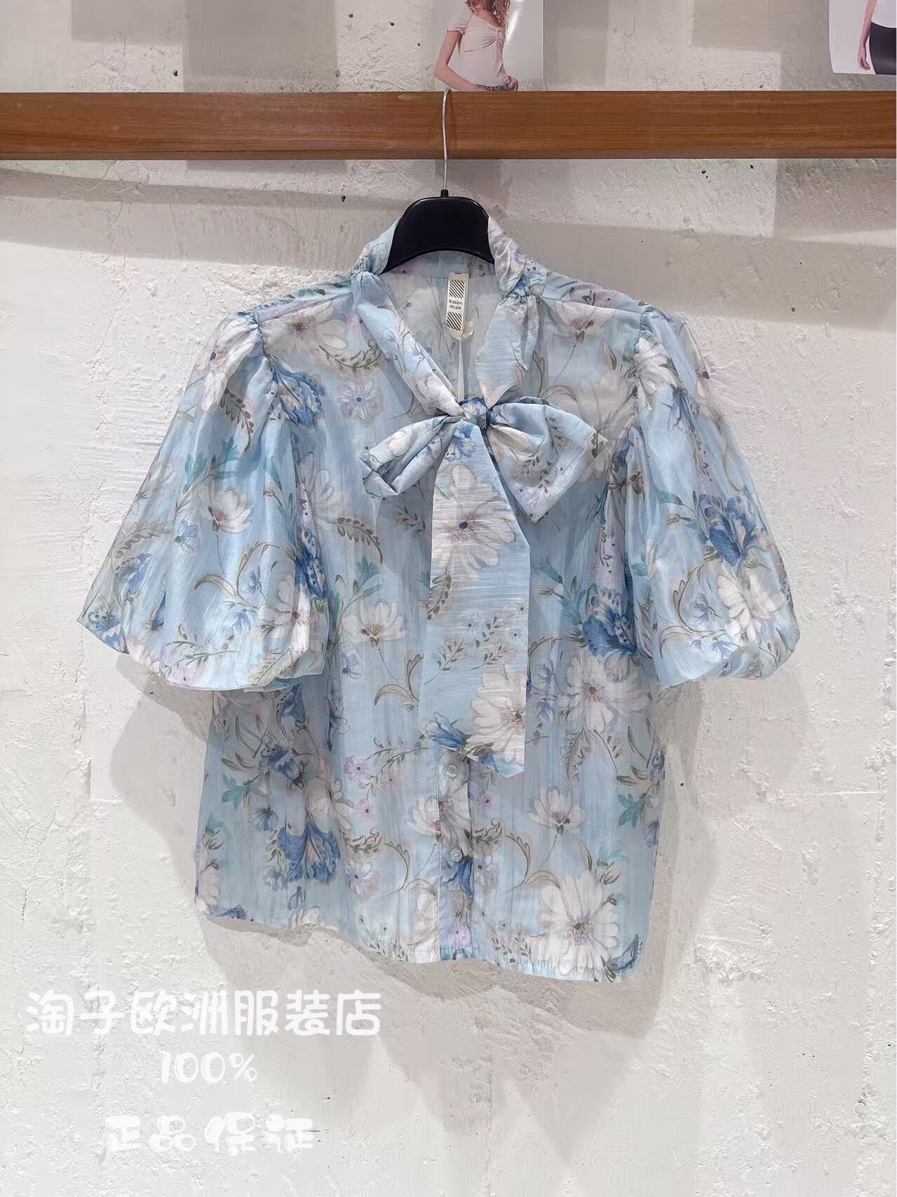 上衣气质2026春夏女 衬衫 意大利品牌p6正品 复古印花领系带纽扣短袖