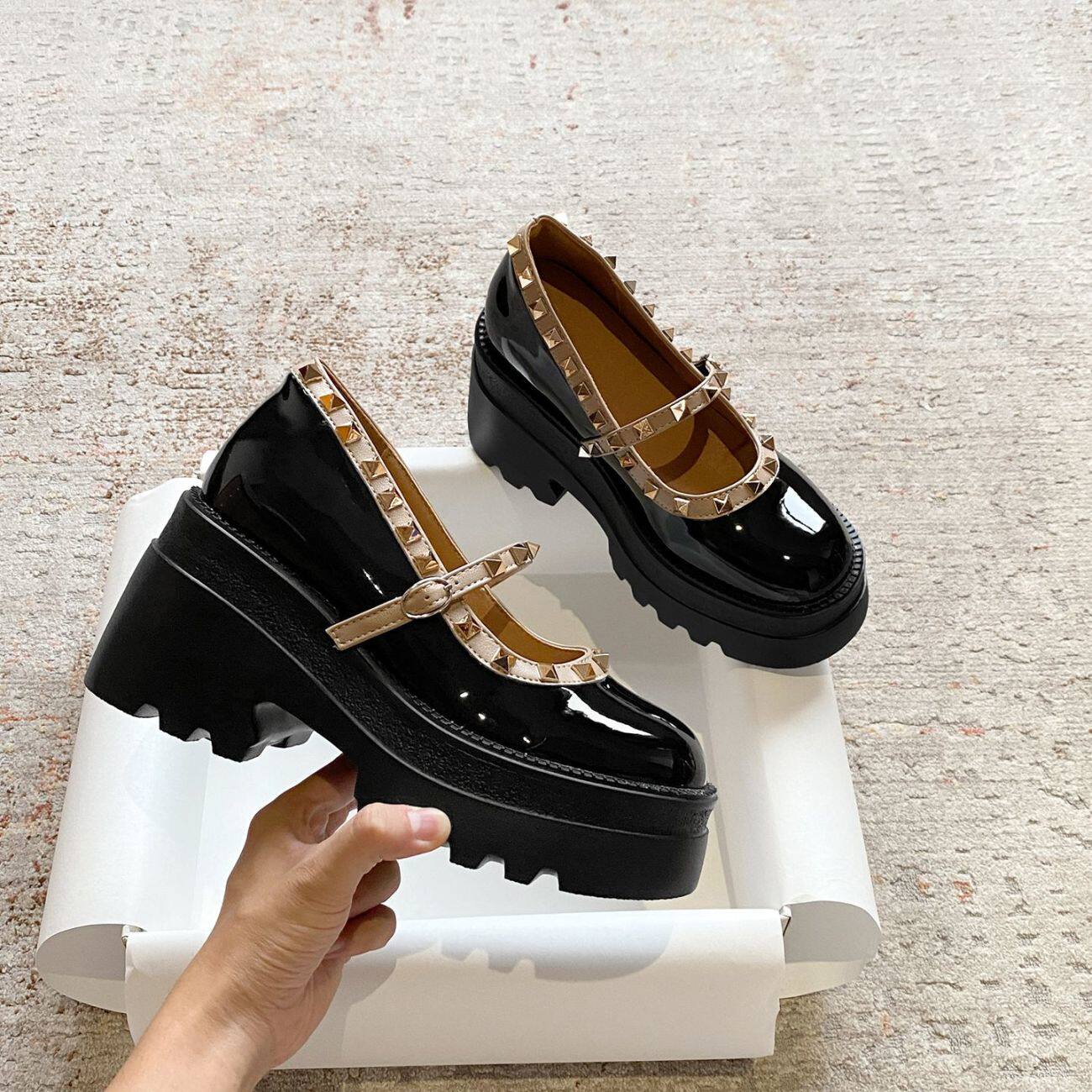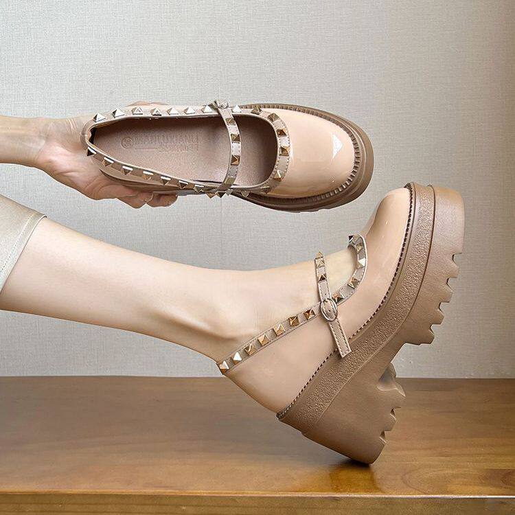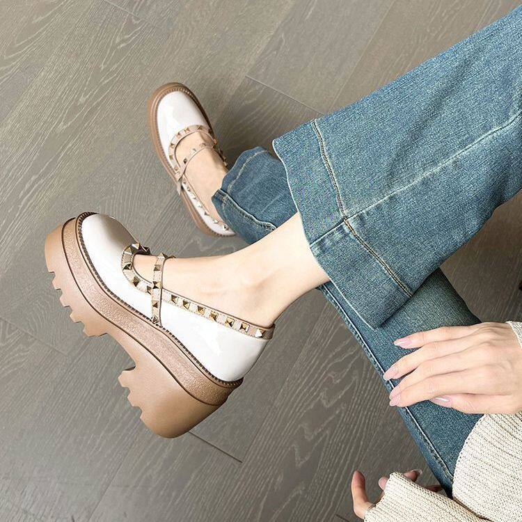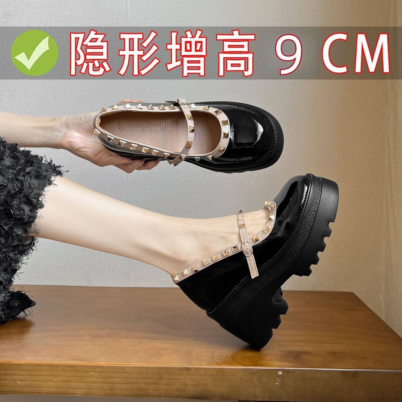 乐福鞋 浅口圆头皮鞋 女一字带铆钉厚底单鞋 8cm增高小个子玛丽珍鞋
