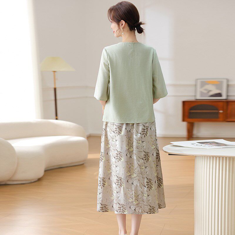 中年女纯色减龄短袖 洋气宽松新款 T恤上衣半裙两件套 套装 妈妈夏装