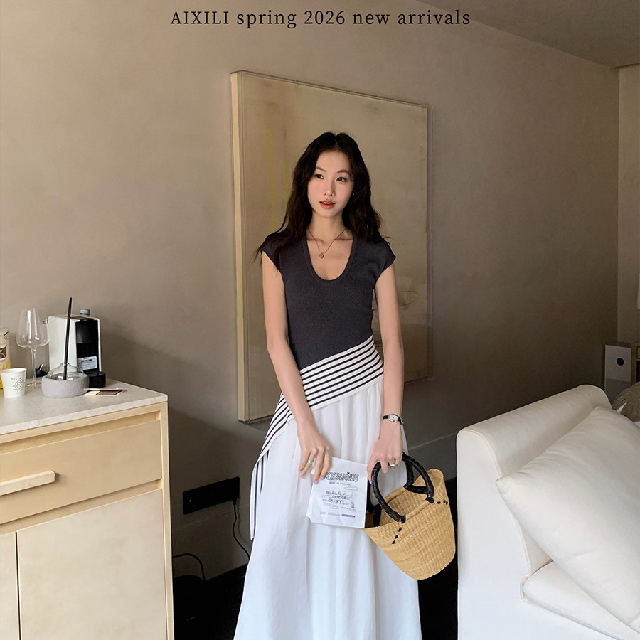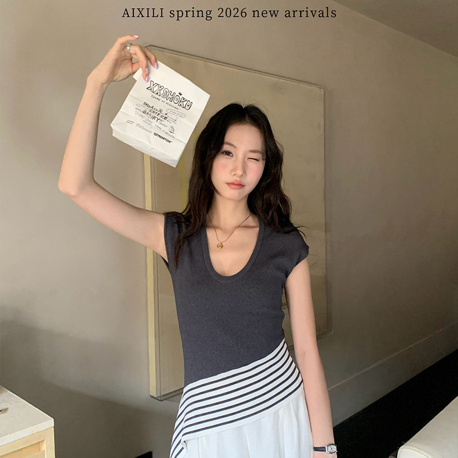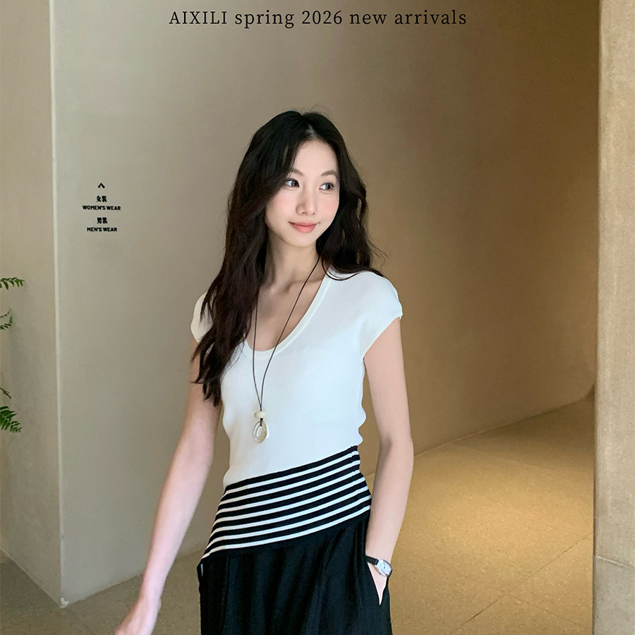 AIXILI爱西里 A2030 时髦气质高级感不规则条纹绑带设计显瘦针织衫