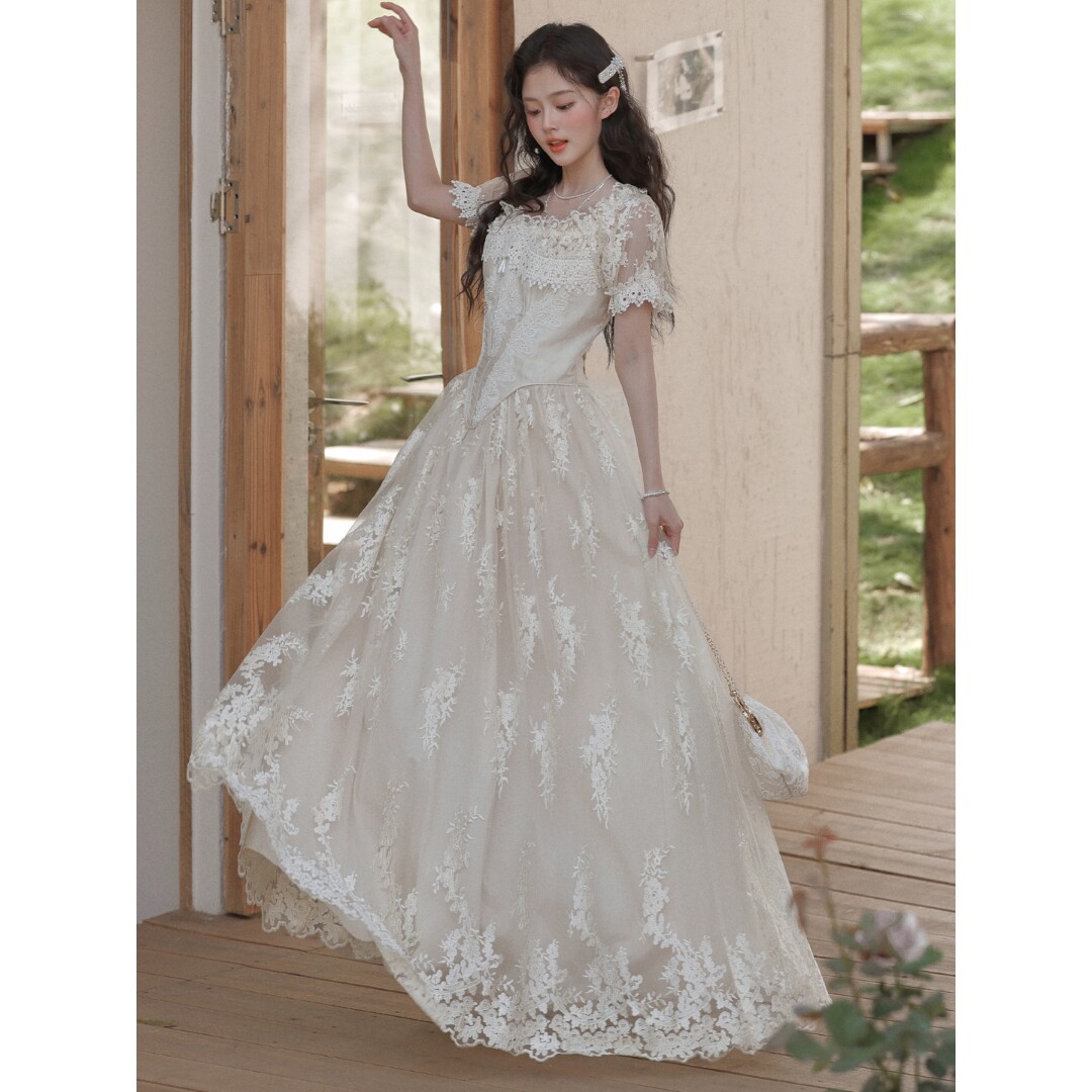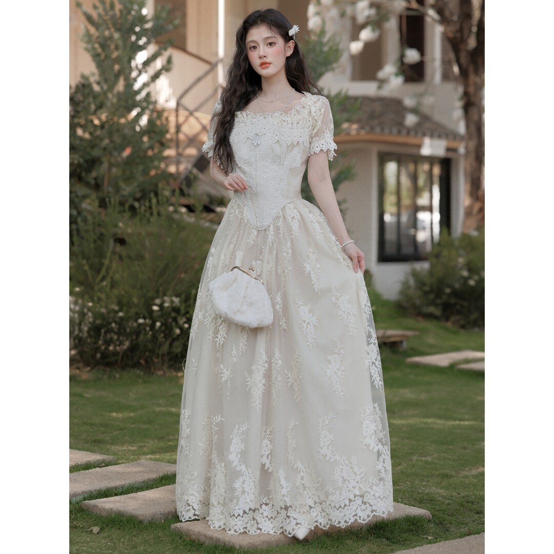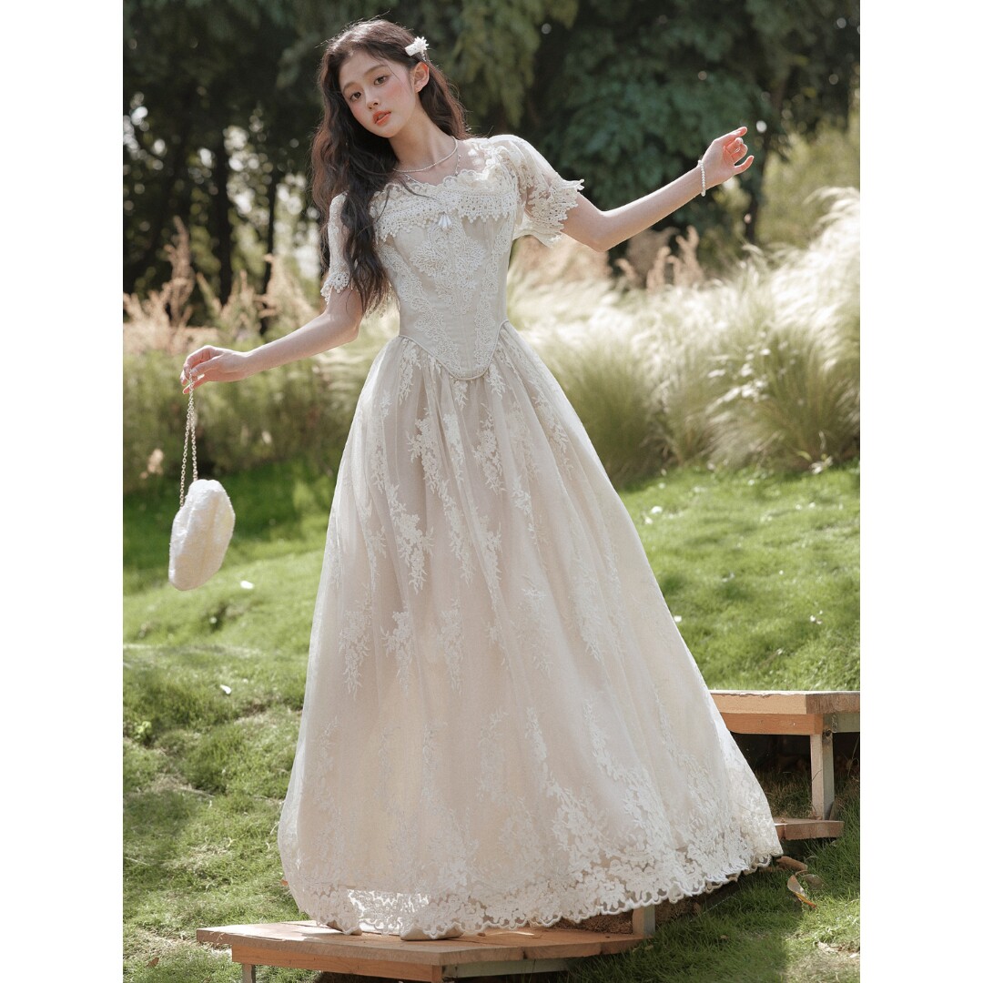 Sweet草莓花烛泪法式 复古宫廷重工收藏蕾丝鱼骨连衣裙轻婚纱礼服