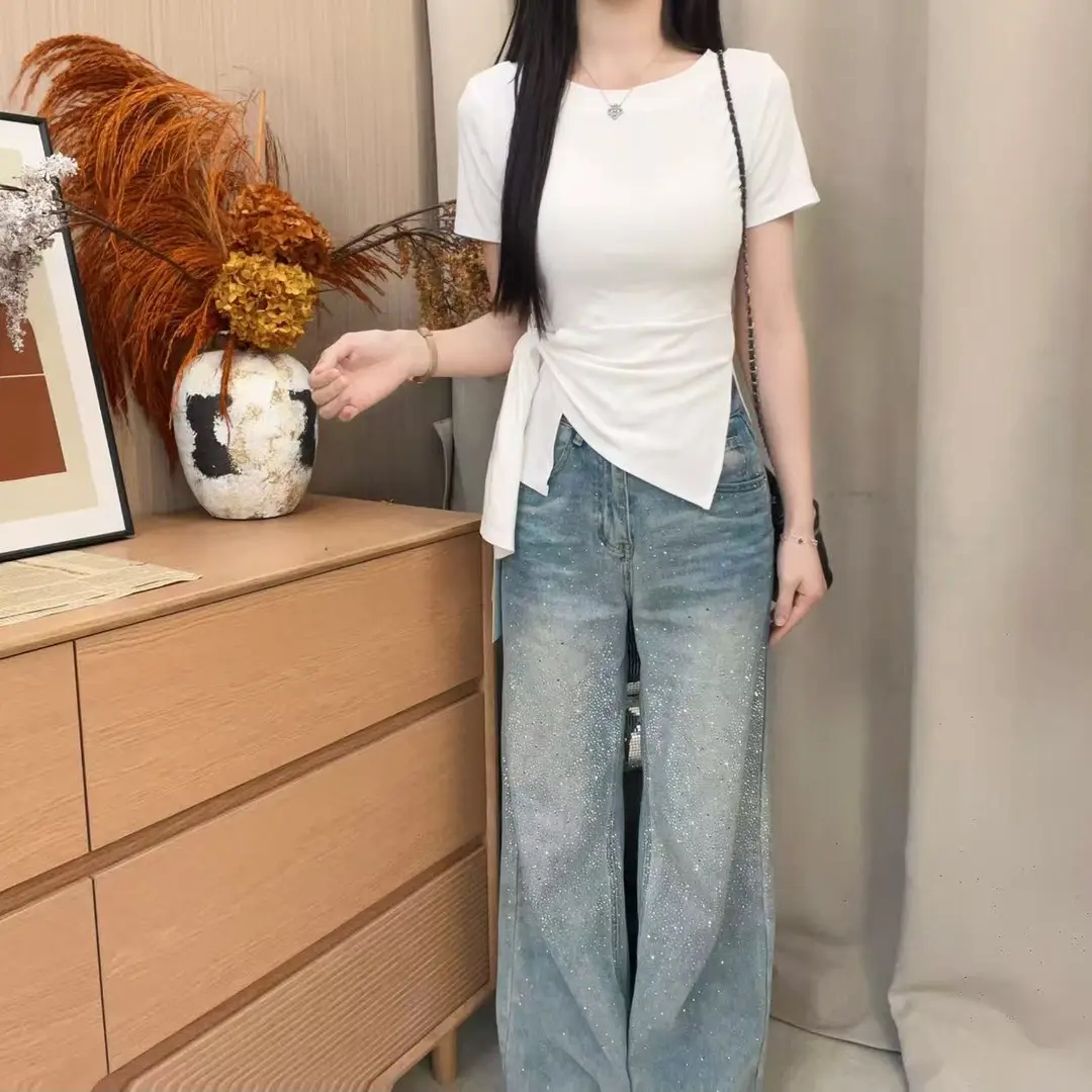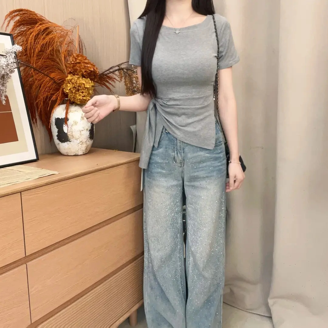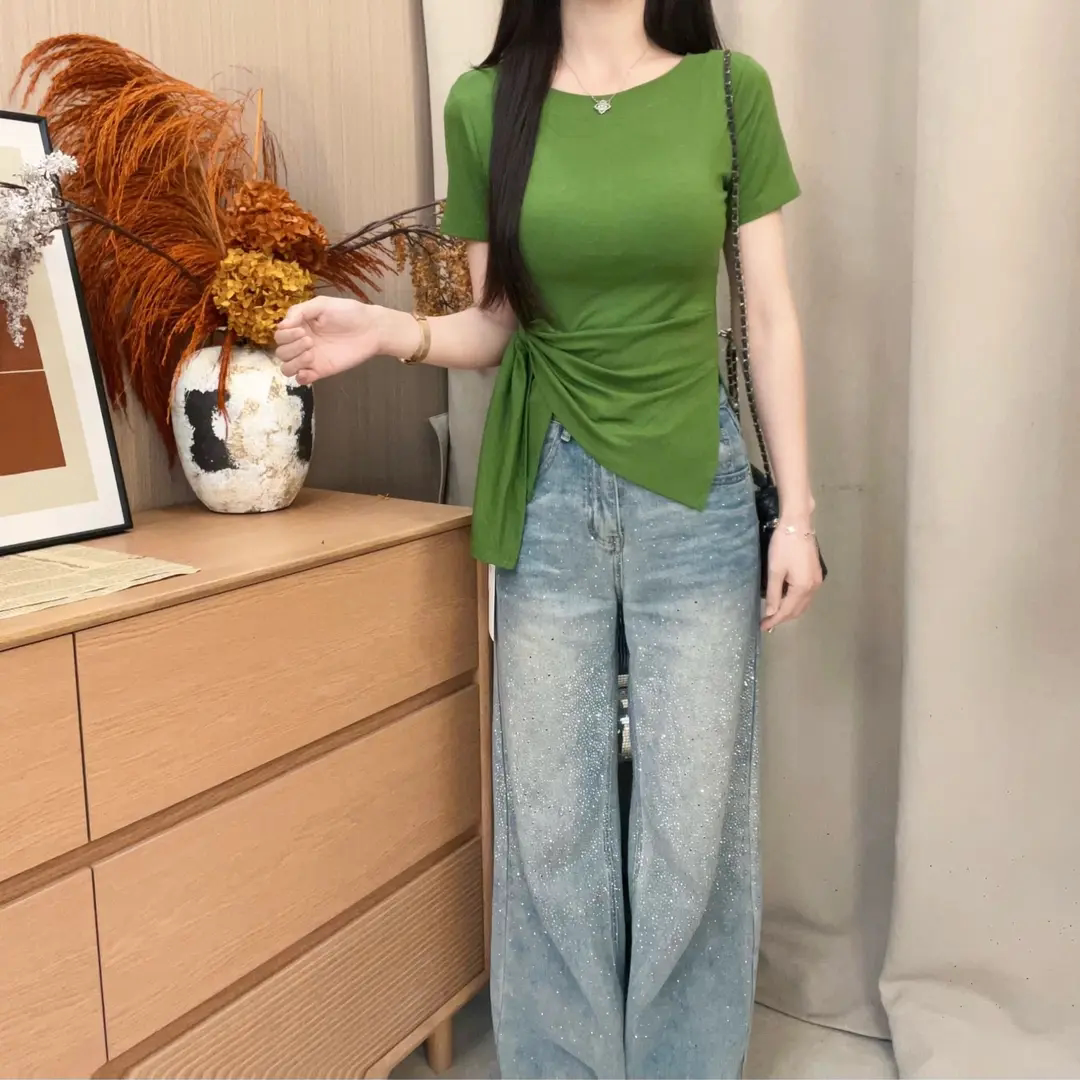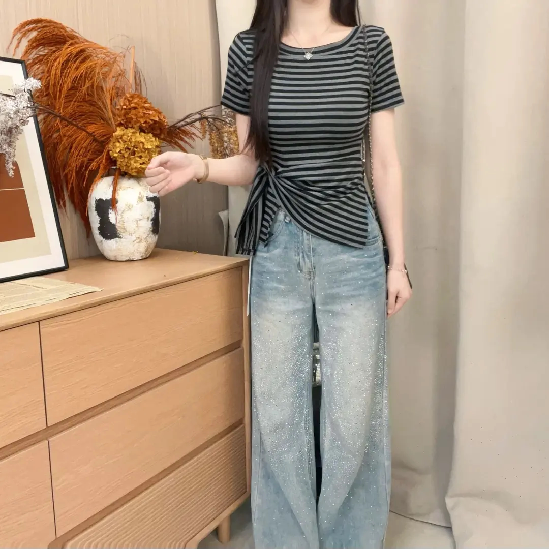 2026早春韩系下摆不规则开叉收腰条纹设计感显瘦百搭斜肩短袖 1019