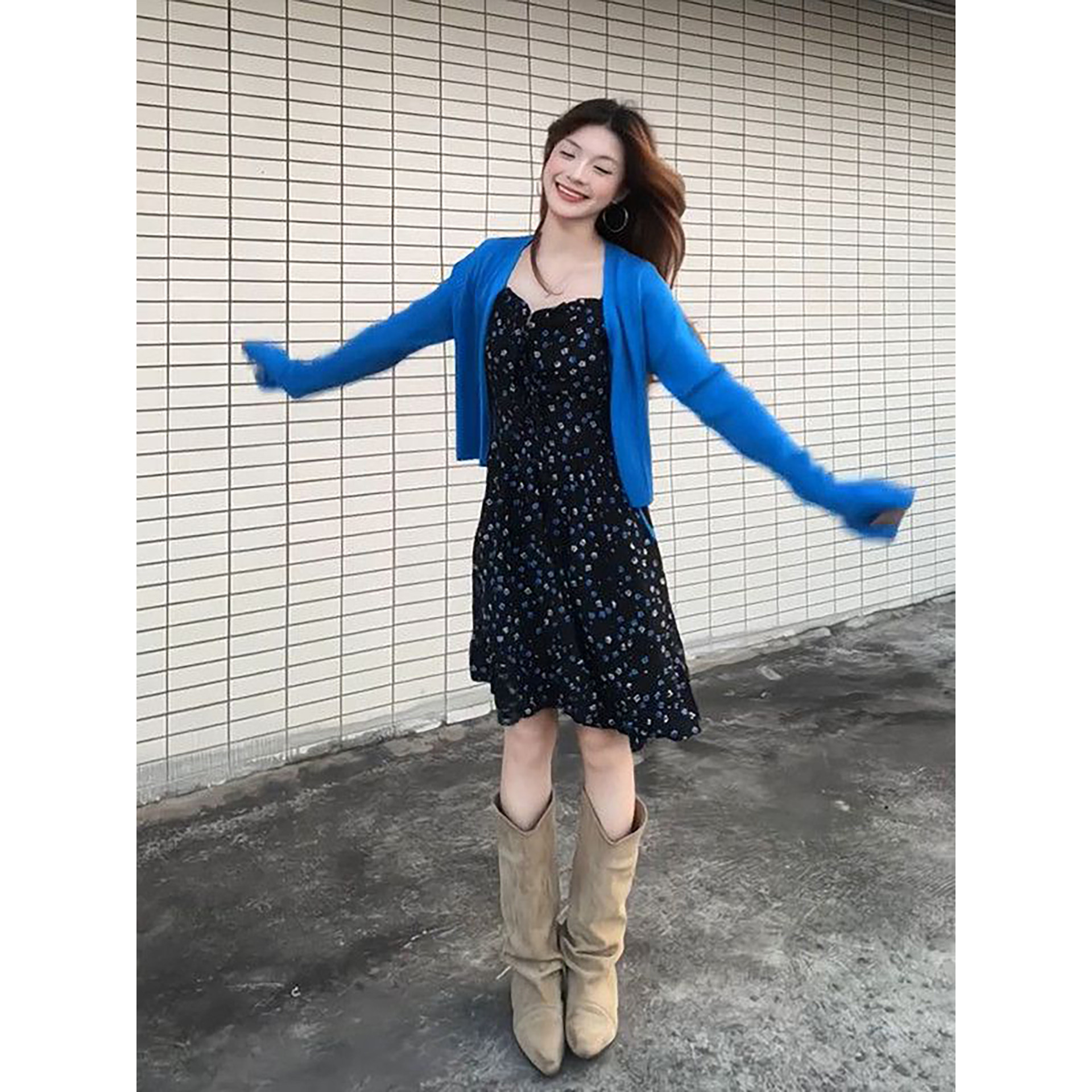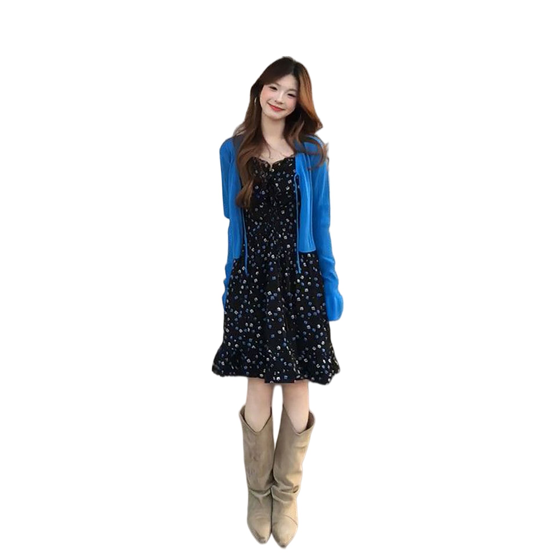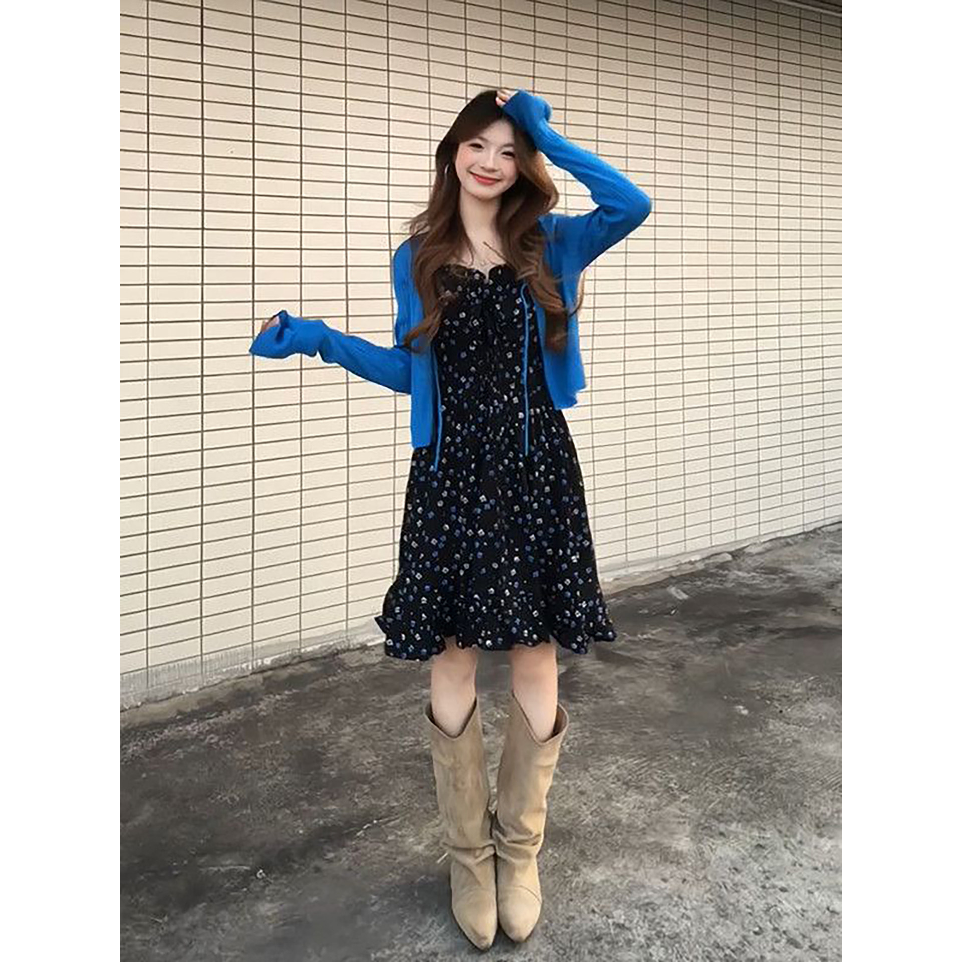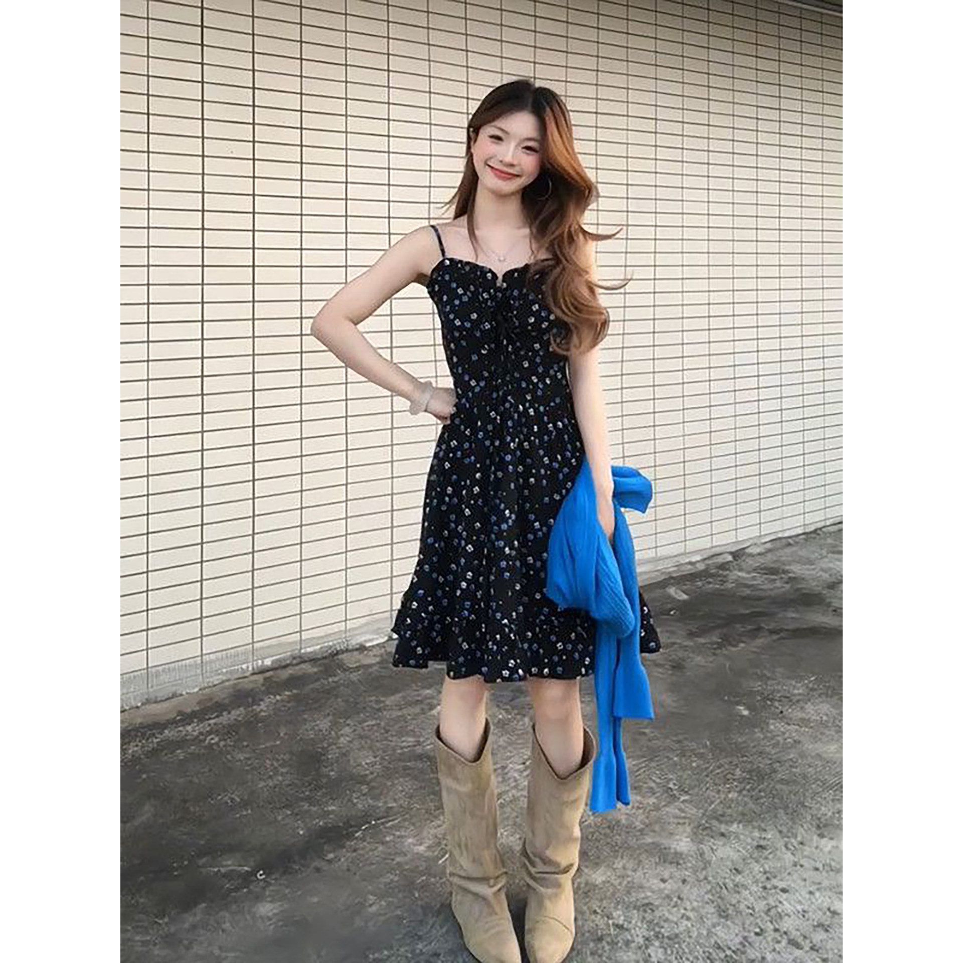两件套装 法式 温柔淑女风黑色碎花吊带连衣裙搭配蓝色绑带毛衣开衫