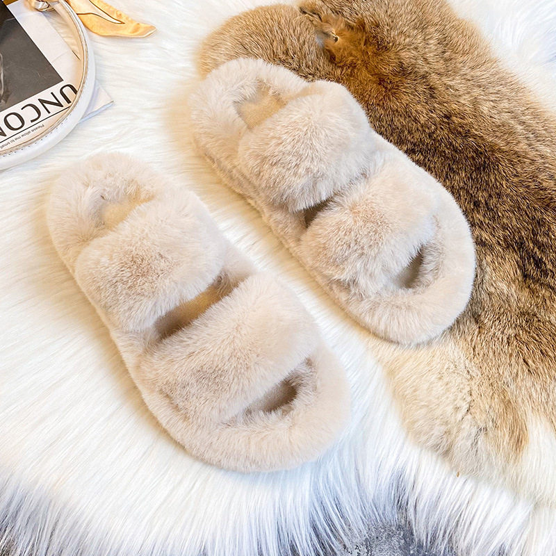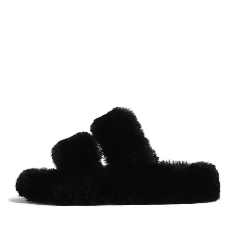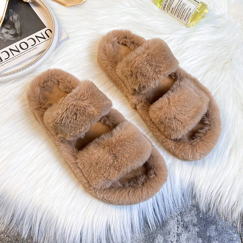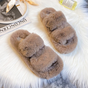 新款 外穿女春秋季 加绒厚底平底一字仙女毛毛拖鞋 葡萄妈同款