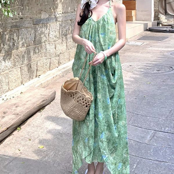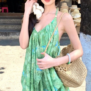 云南旅游穿搭女装 复古绿色碎花挂脖连衣裙度假风宽松a字沙滩裙夏