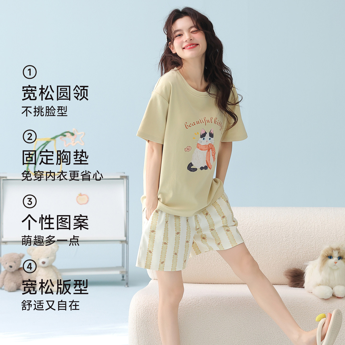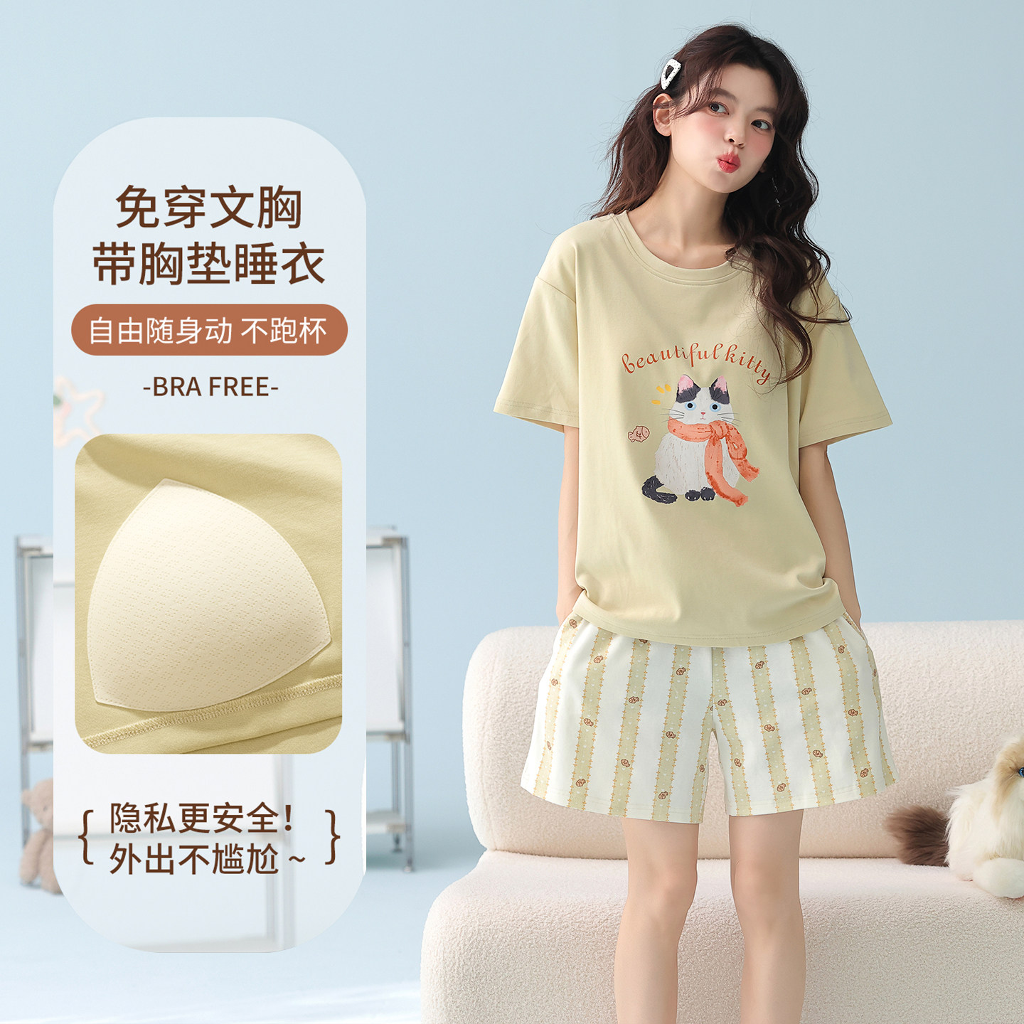 2026新款 高级感家居服套装 夏季 短裤 纯棉带胸垫短袖 七色纺睡衣女款