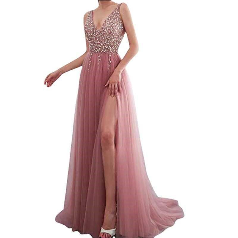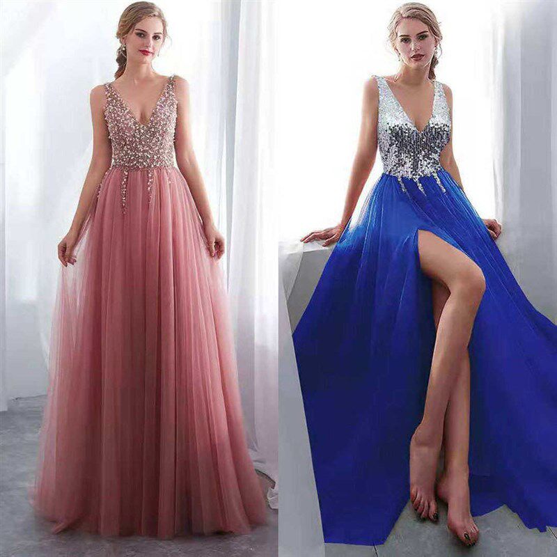 sleeveless slit Women evening deep sequin gown女礼服 dress