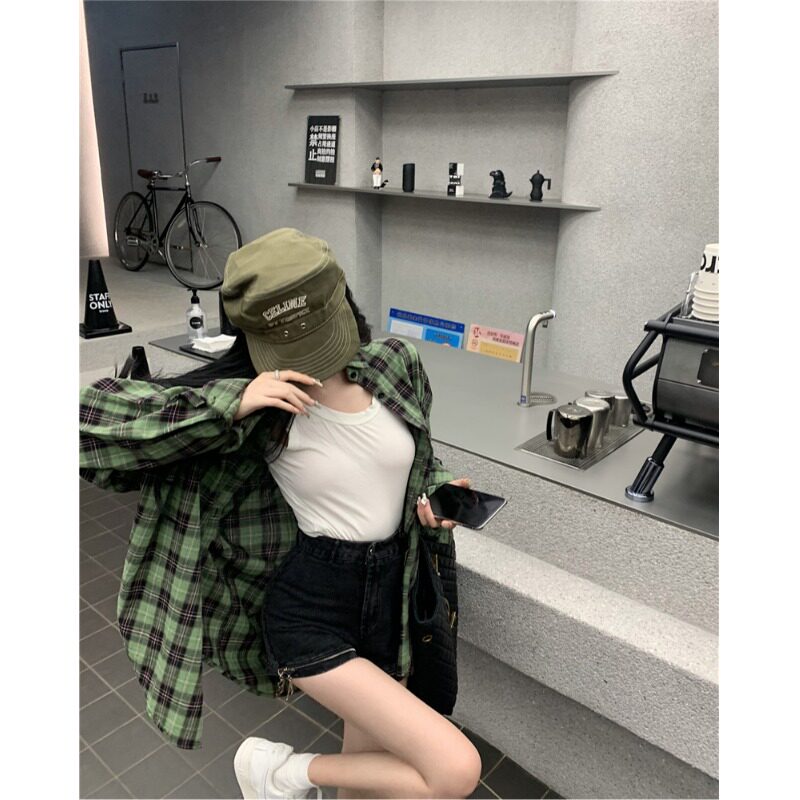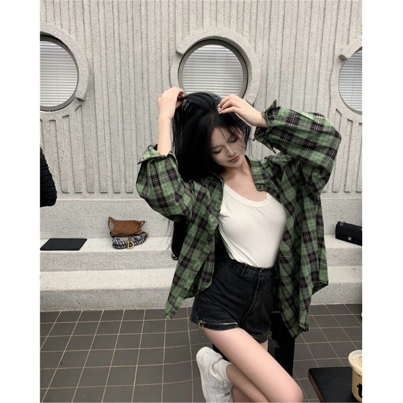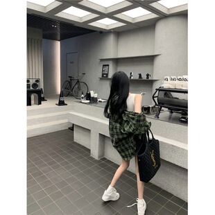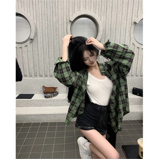 宽松休闲慵懒衬衣上衣 外套女早春2026新款 复古绿色格子薄款 衬衫