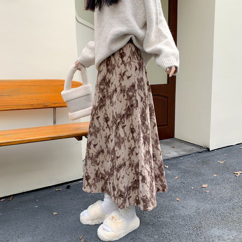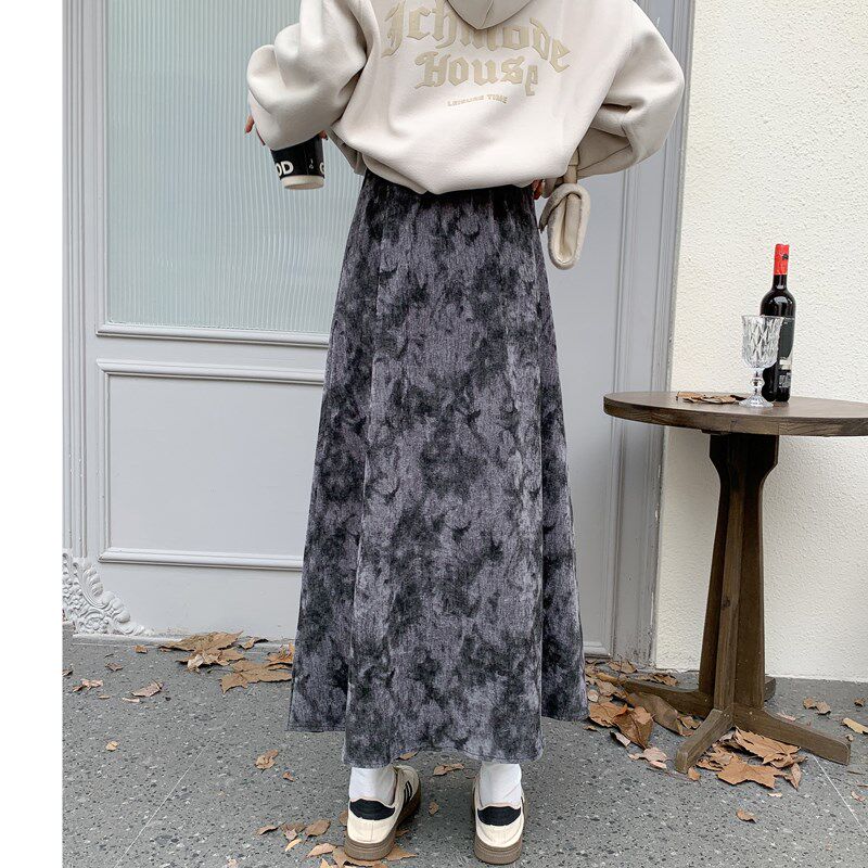 新品 高腰a字裙丝绒长裙子墨染遮跨保暖冬 碎花半身裙秋冬202s5新款