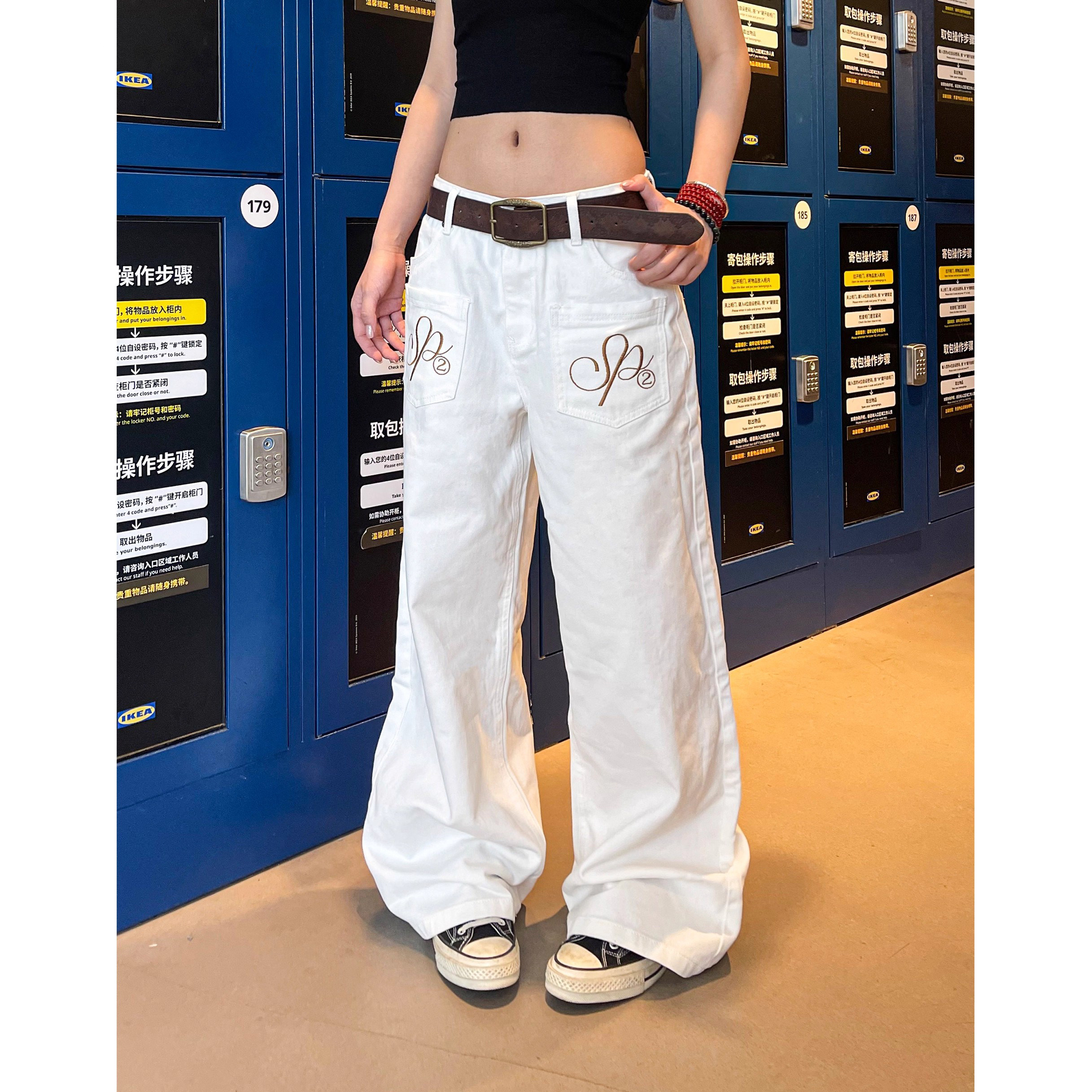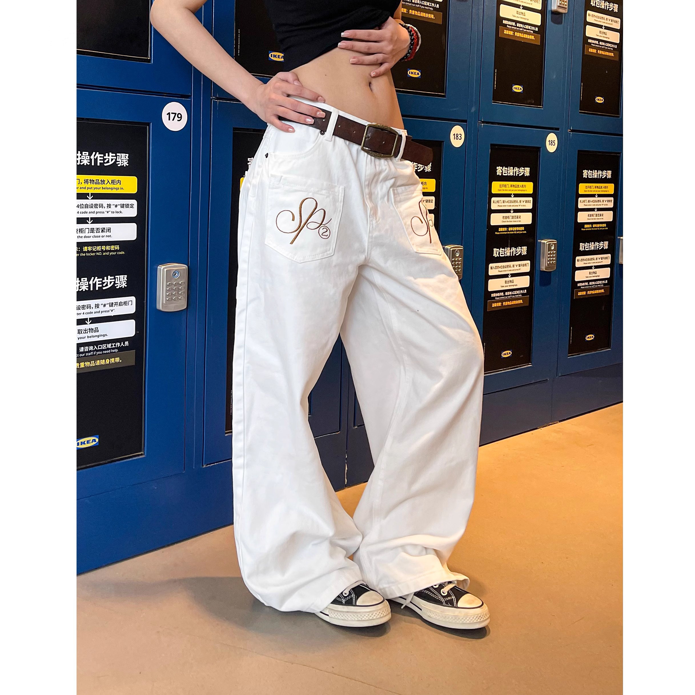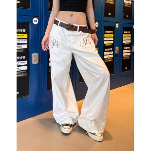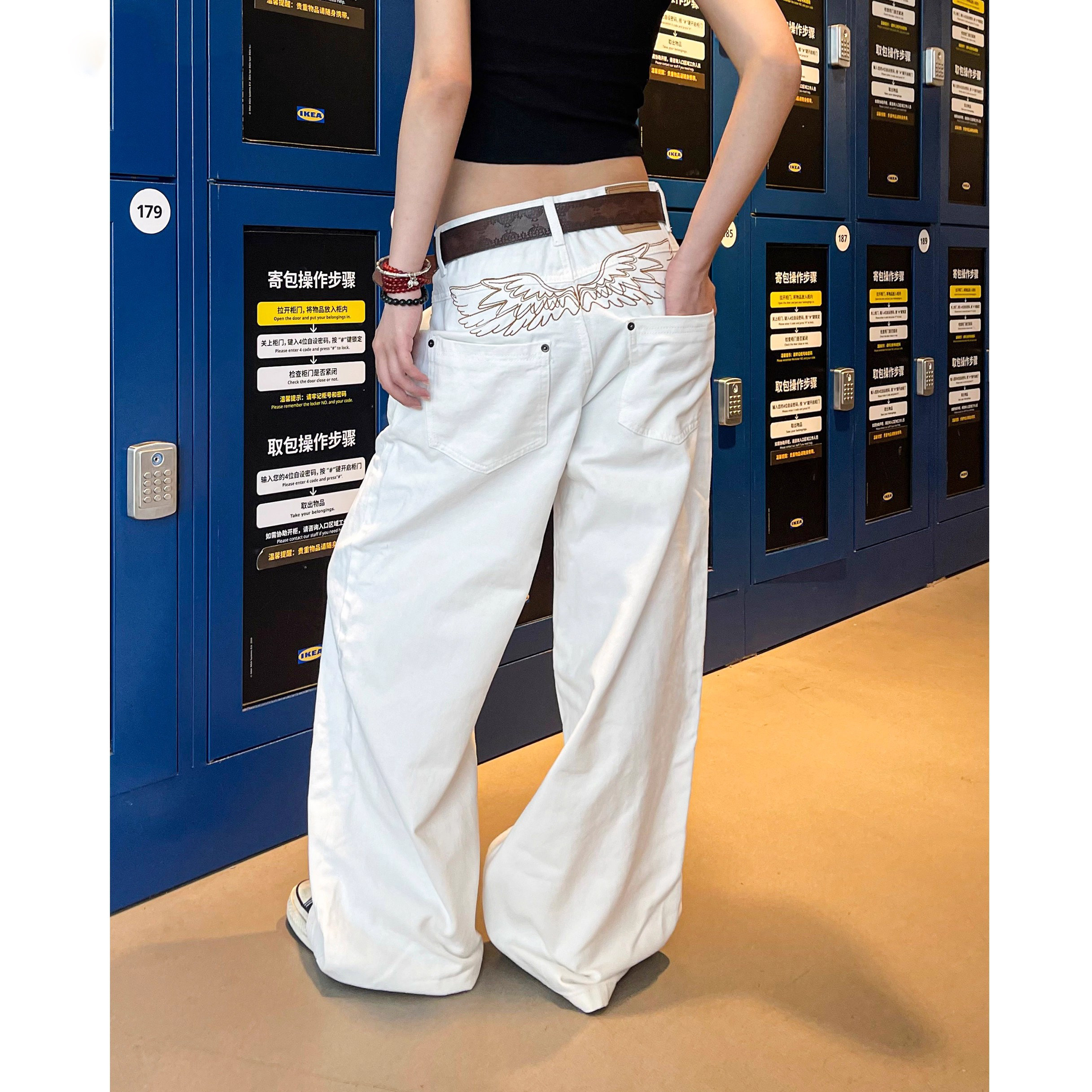 潮 男女baggy阔腿宽松情侣休闲裤 美式 复古反穿设计翅膀刺绣牛仔裤