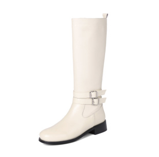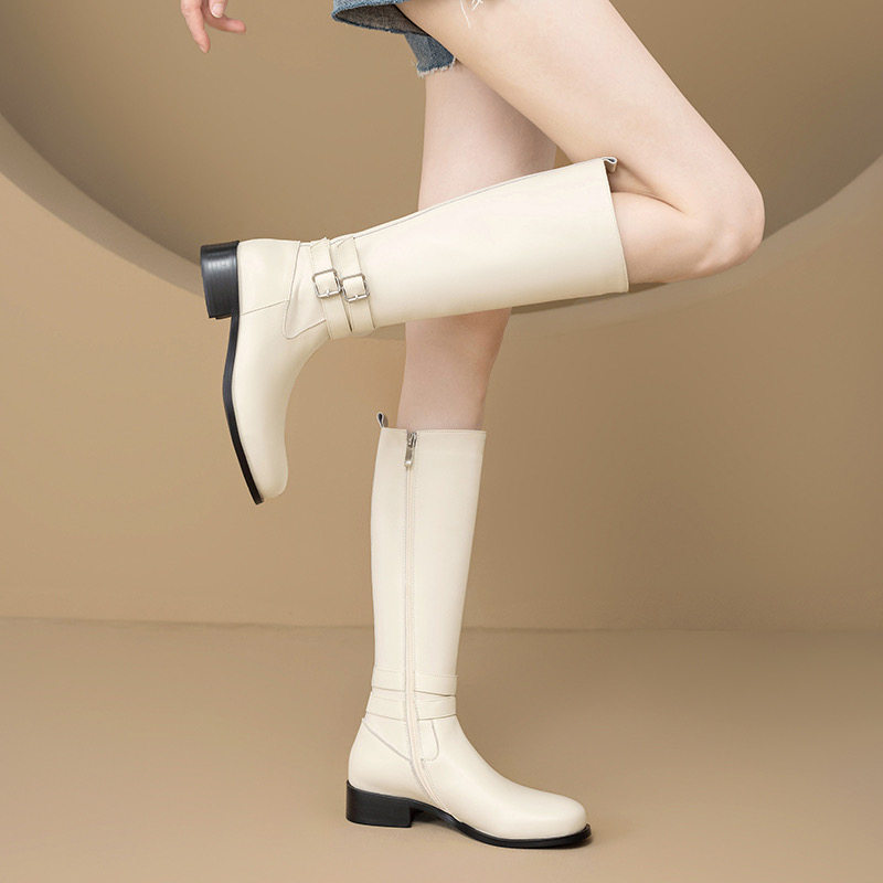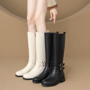 真皮高筒靴女2025秋冬新款 低跟女靴百搭单靴白色长筒靴显瘦骑士靴