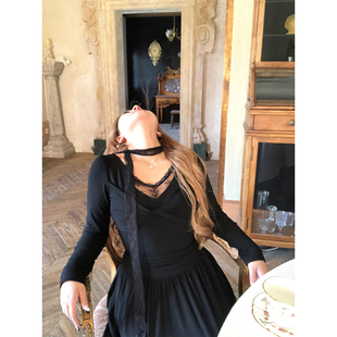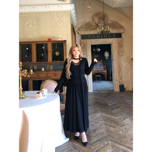 Girlsat18御姐蕾丝V领黑色长袖 长裙 连衣裙女秋冬高级气质性感修身