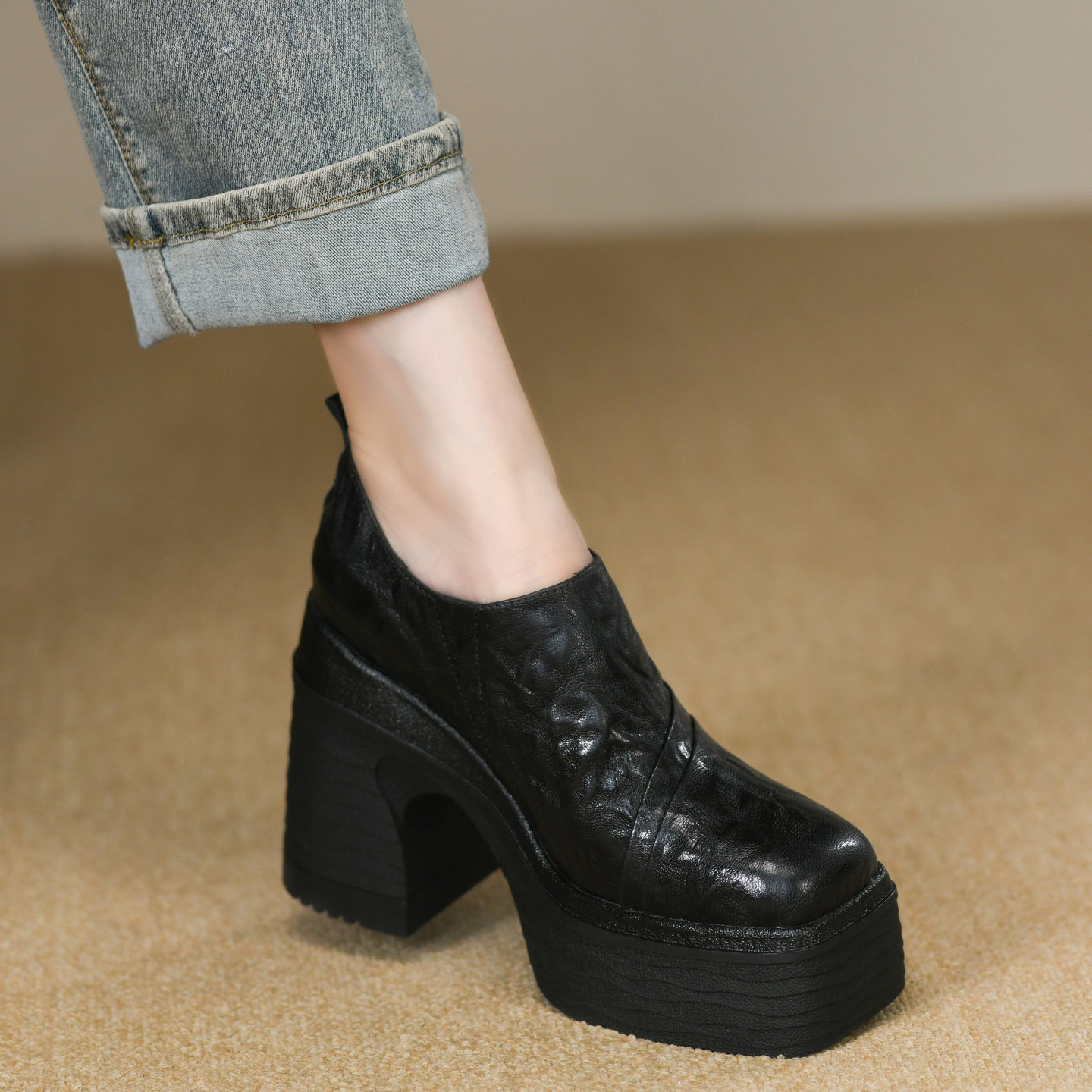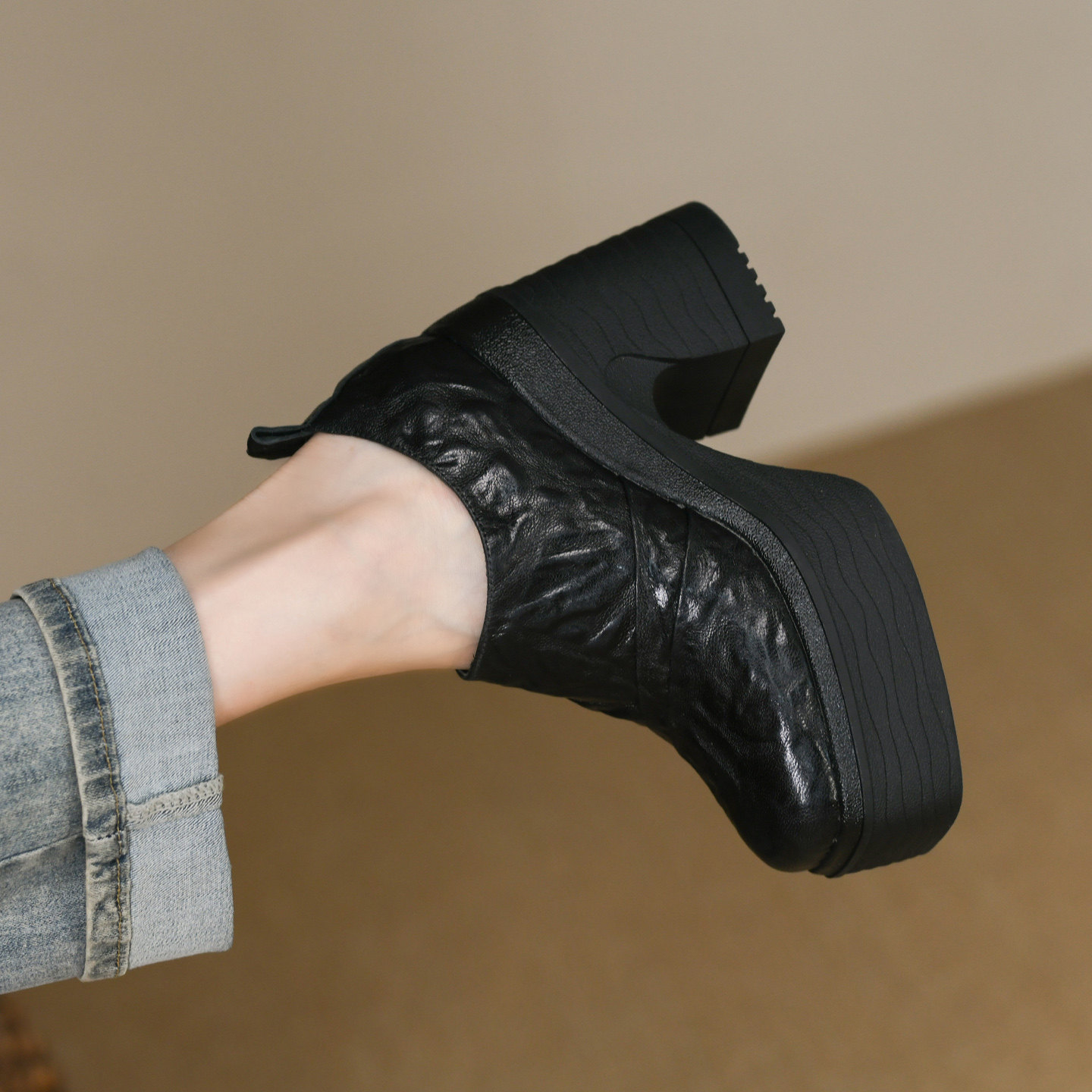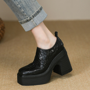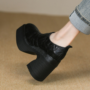 真皮一脚蹬防水台圆头高跟鞋 款 女 女粗跟秋季 11cm黑色深口厚底单鞋