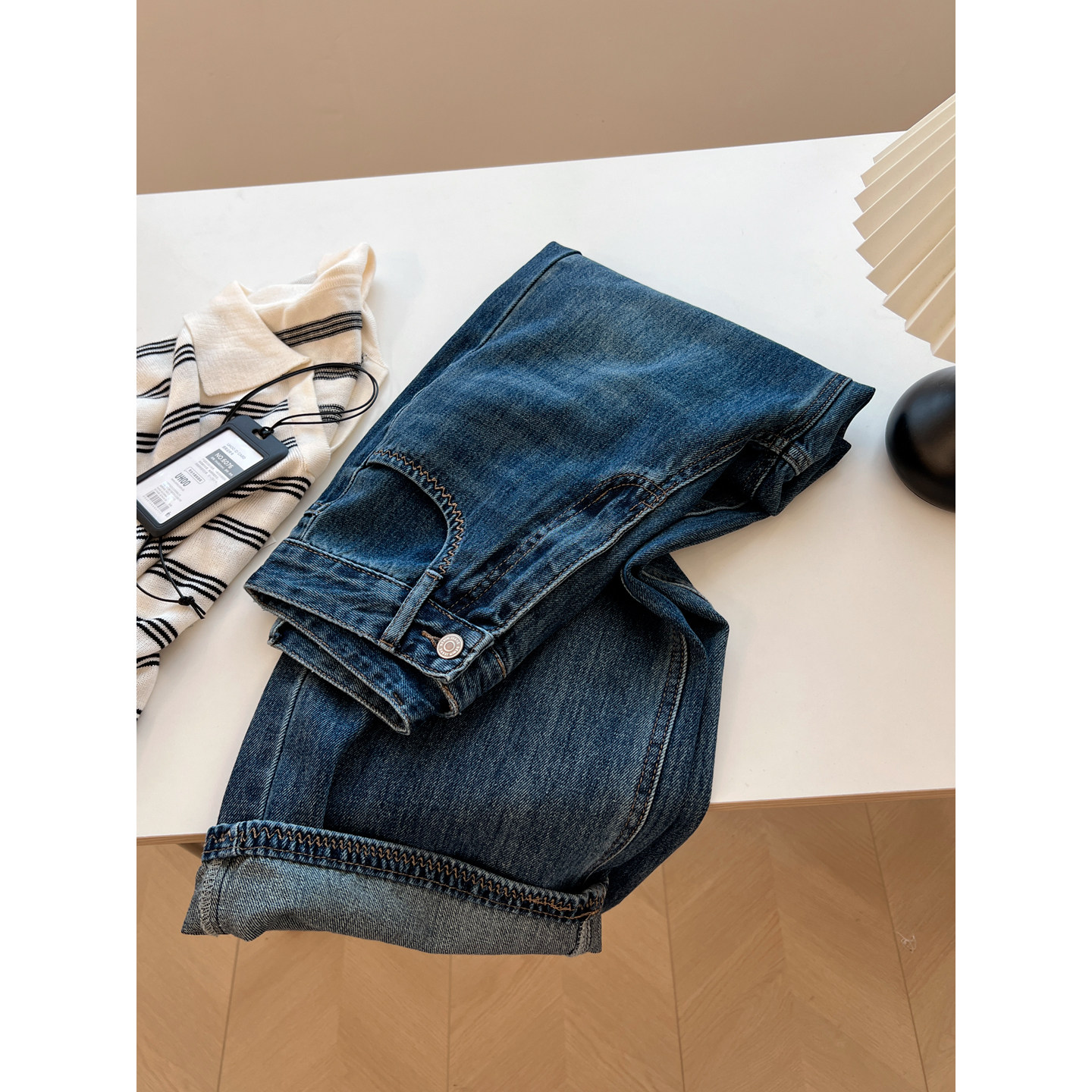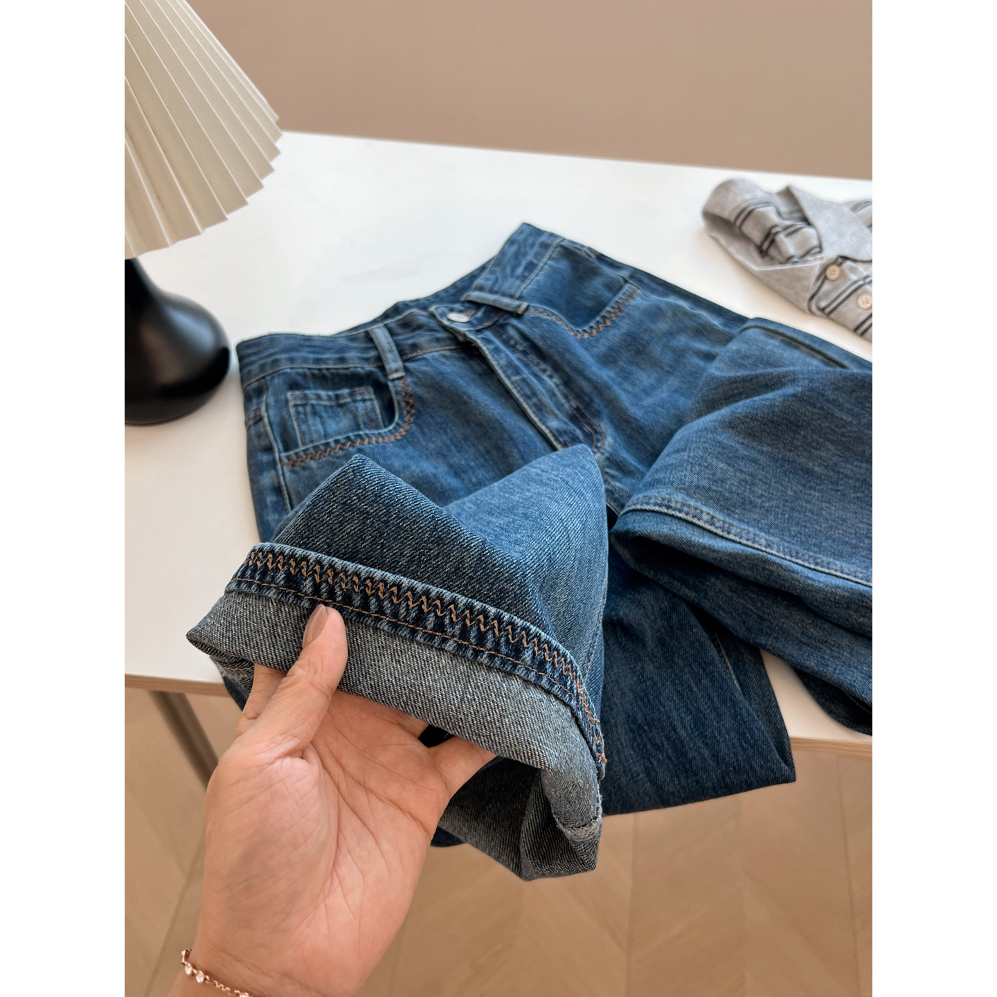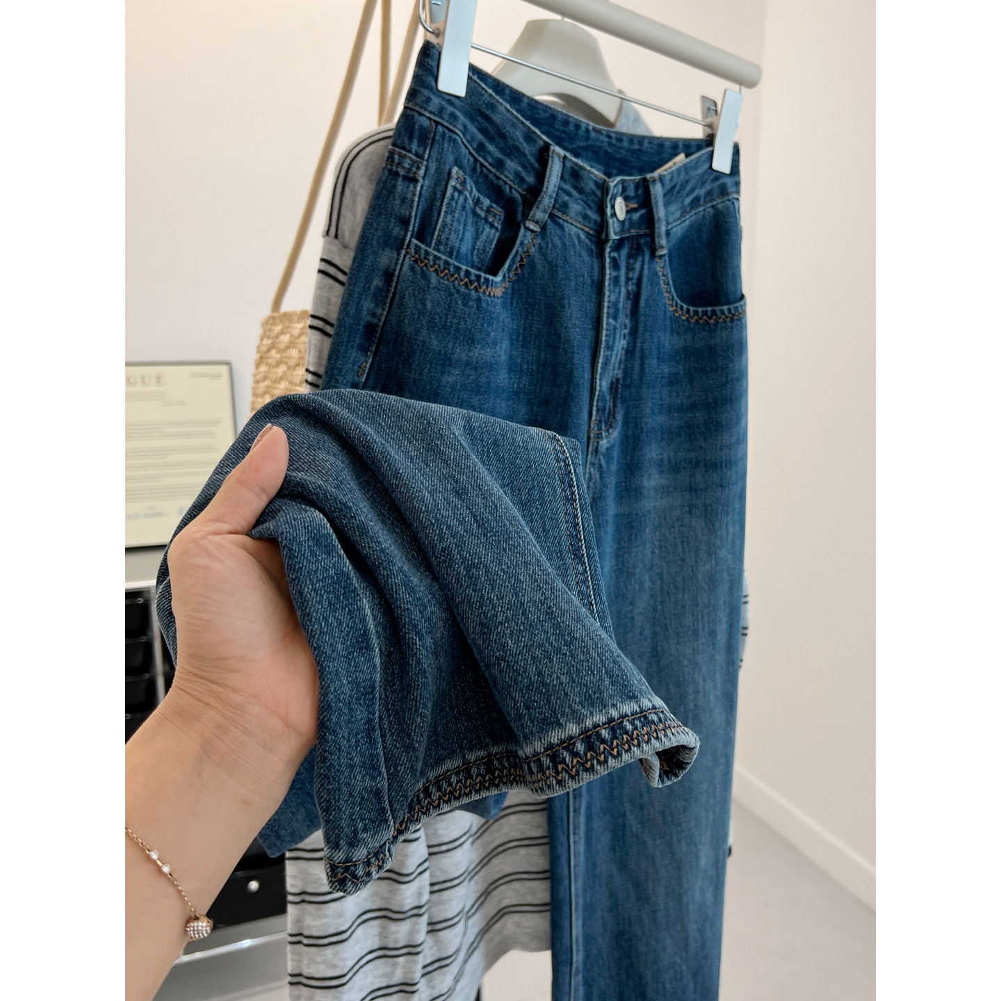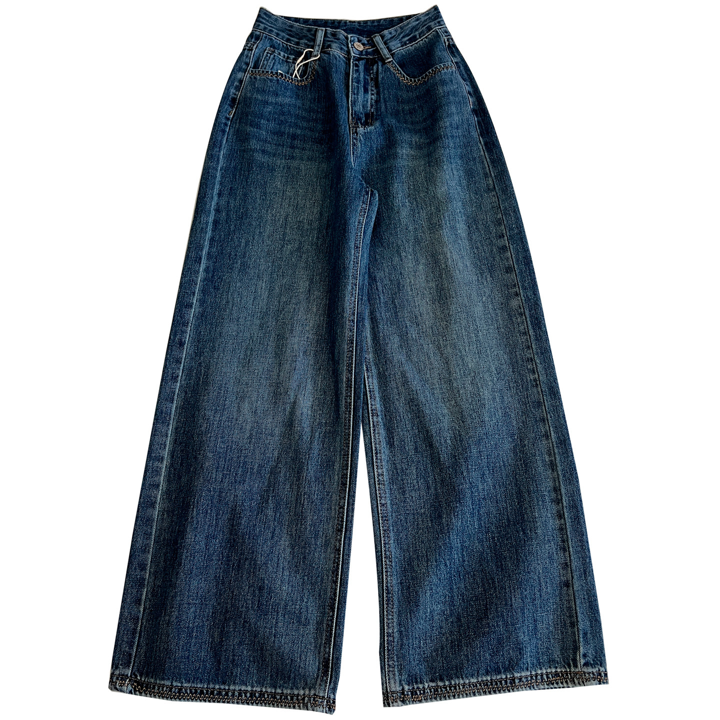 秋季 女宽松慵懒气质小众阔腿裤 潮 复古水洗做旧高腰直筒牛仔裤 韩版