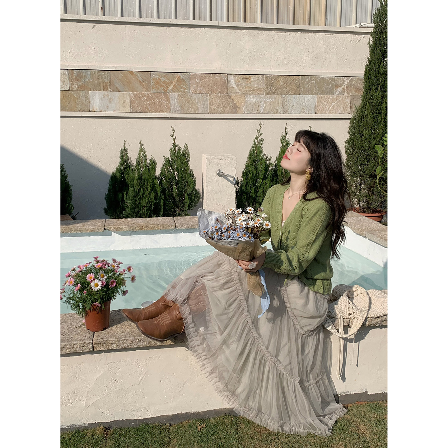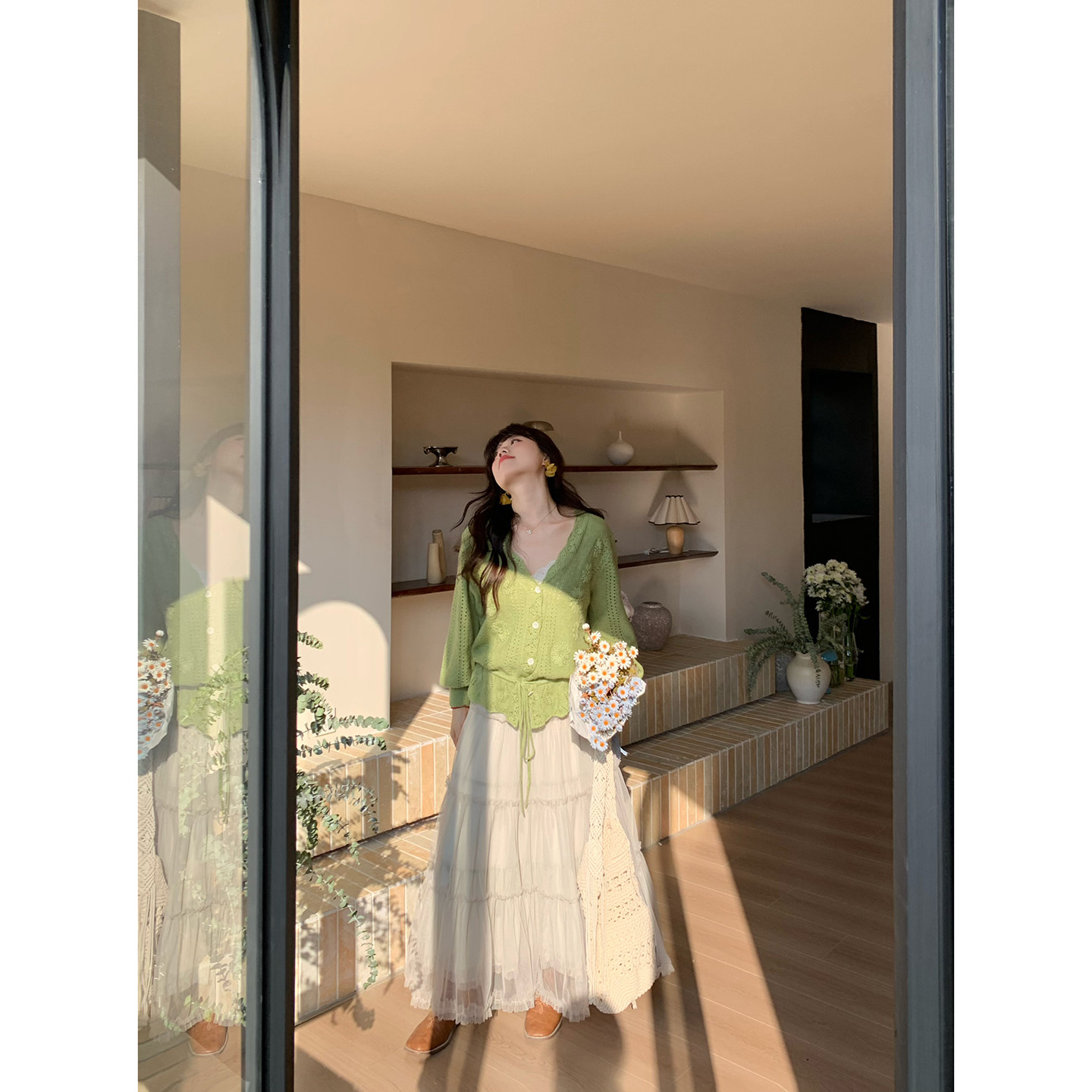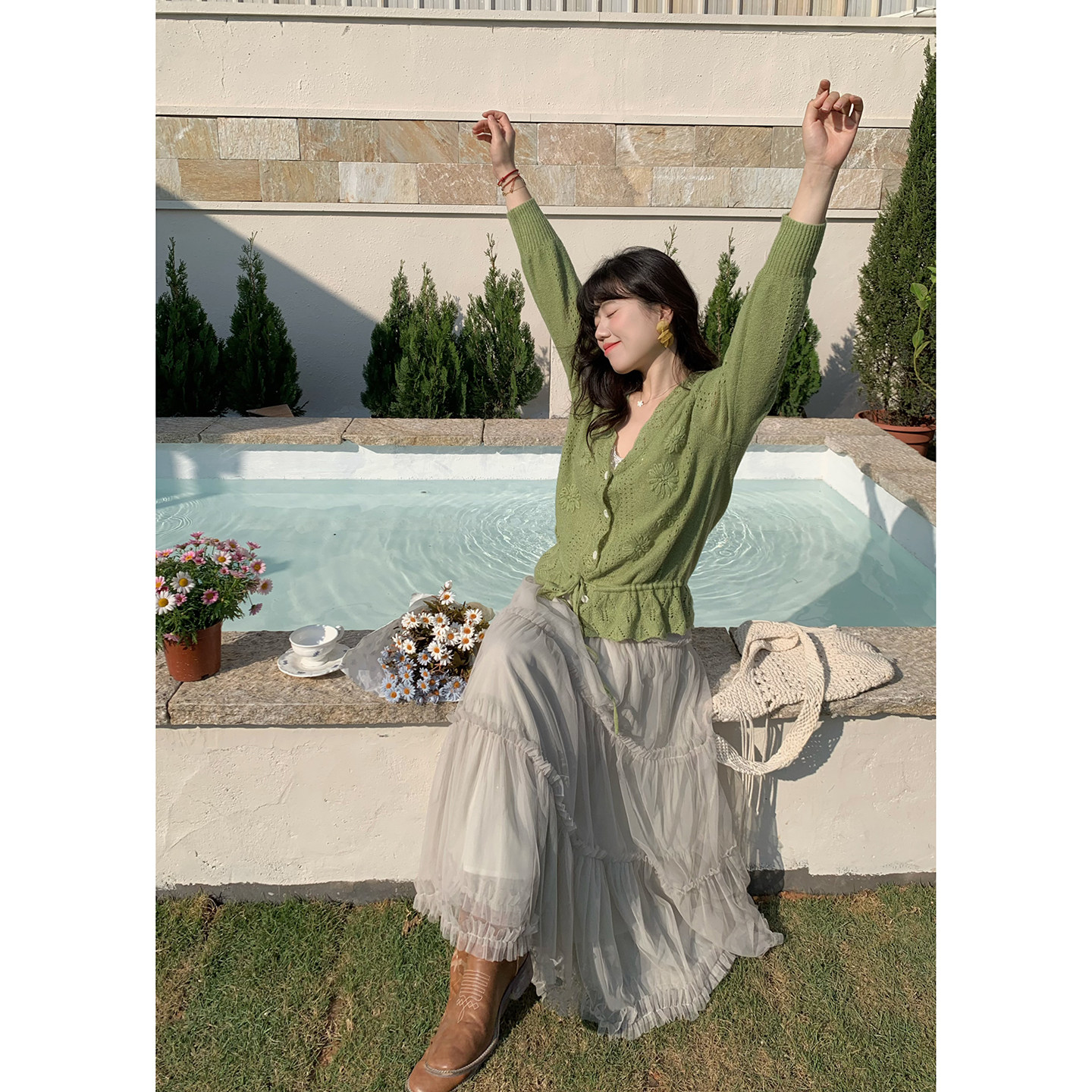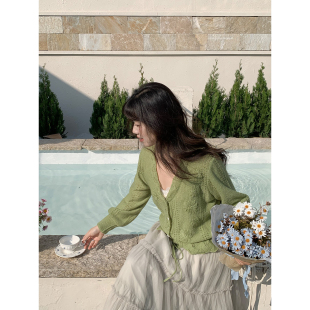 开衫 米米子微胖大码 气质抹茶绿温柔风镂空长袖 温柔风时尚 春 胖mm
