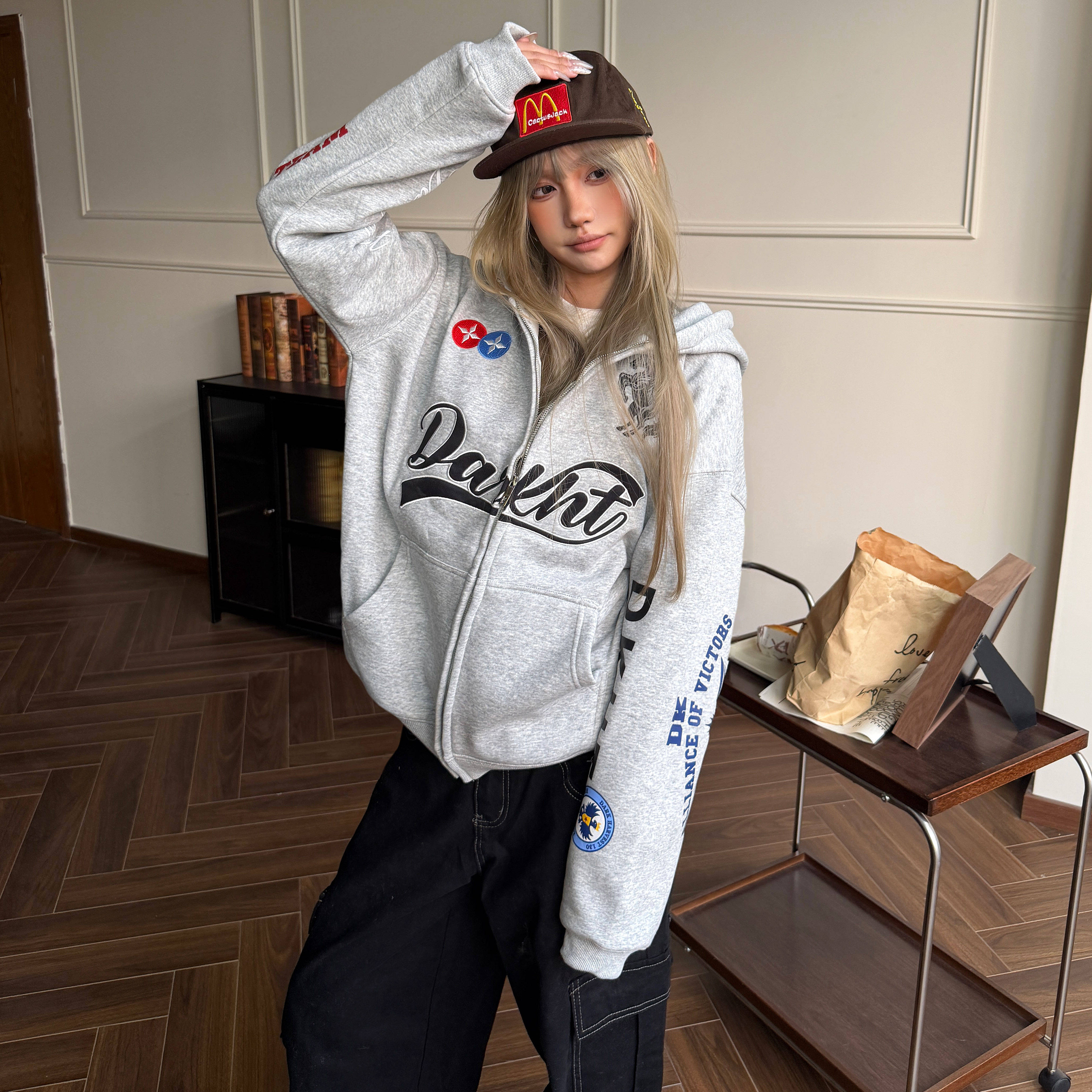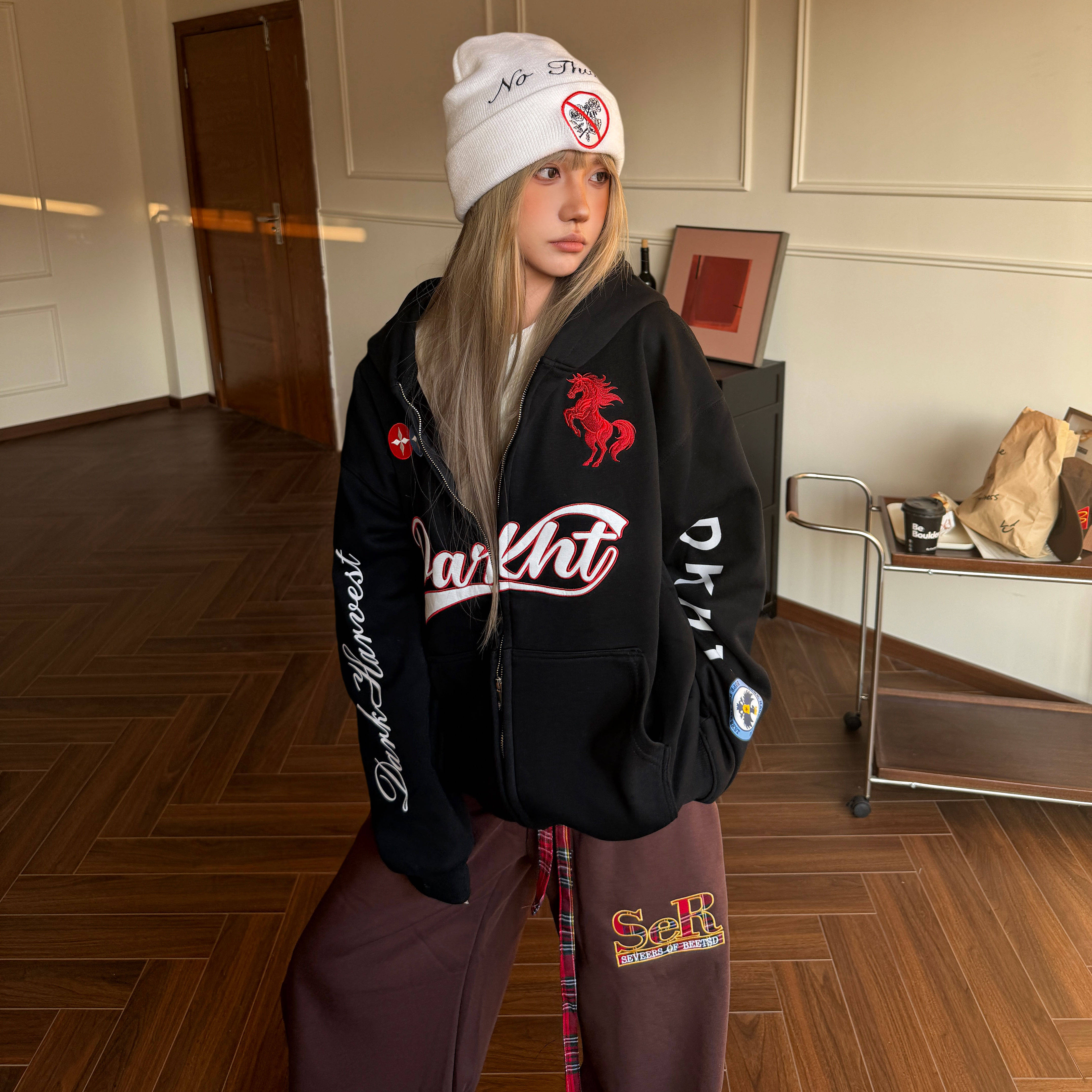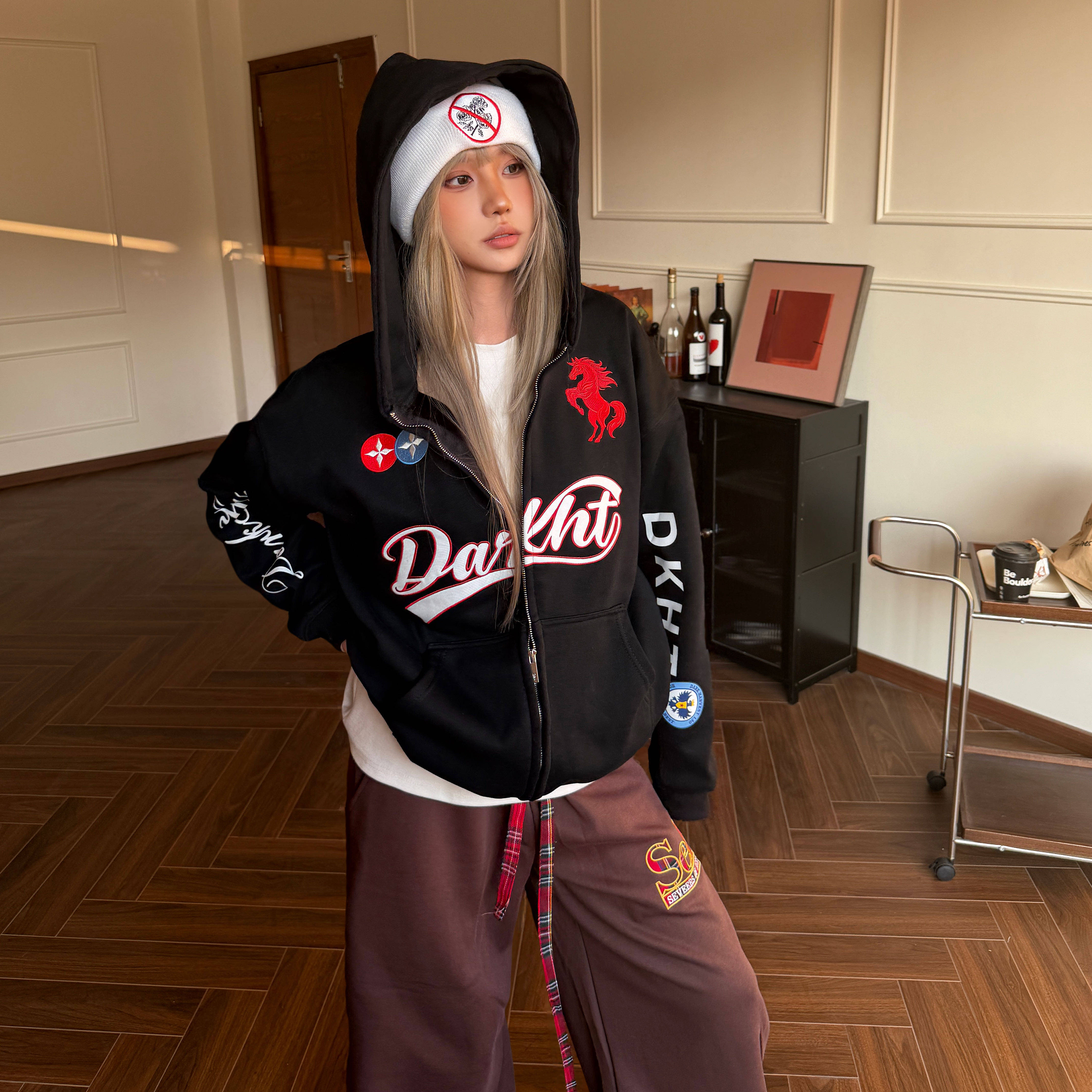Amoeba美式 男女宽松外套 复古跃马字母刺绣加绒连帽卫衣拉链开衫
