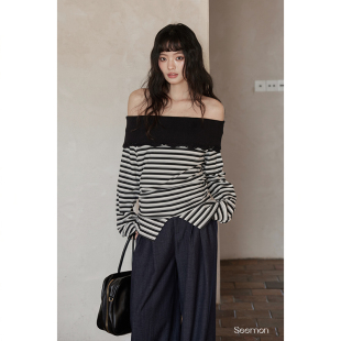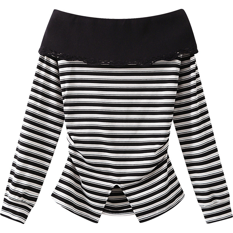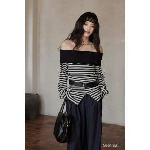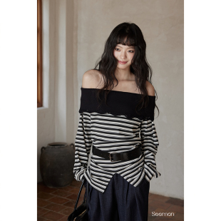 韩系气质上衣设计感小众一字肩露肩条纹长袖 春季 t恤 清仓秒杀