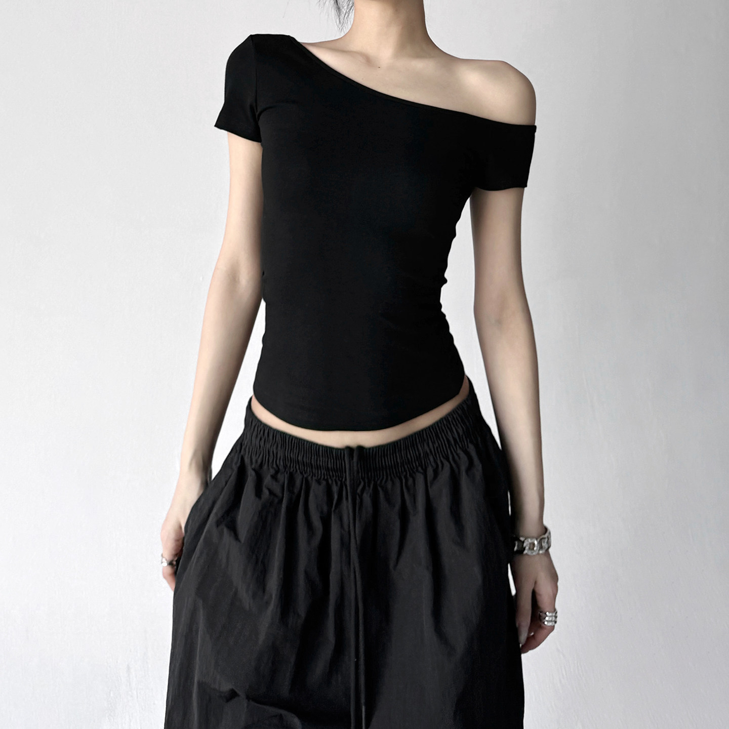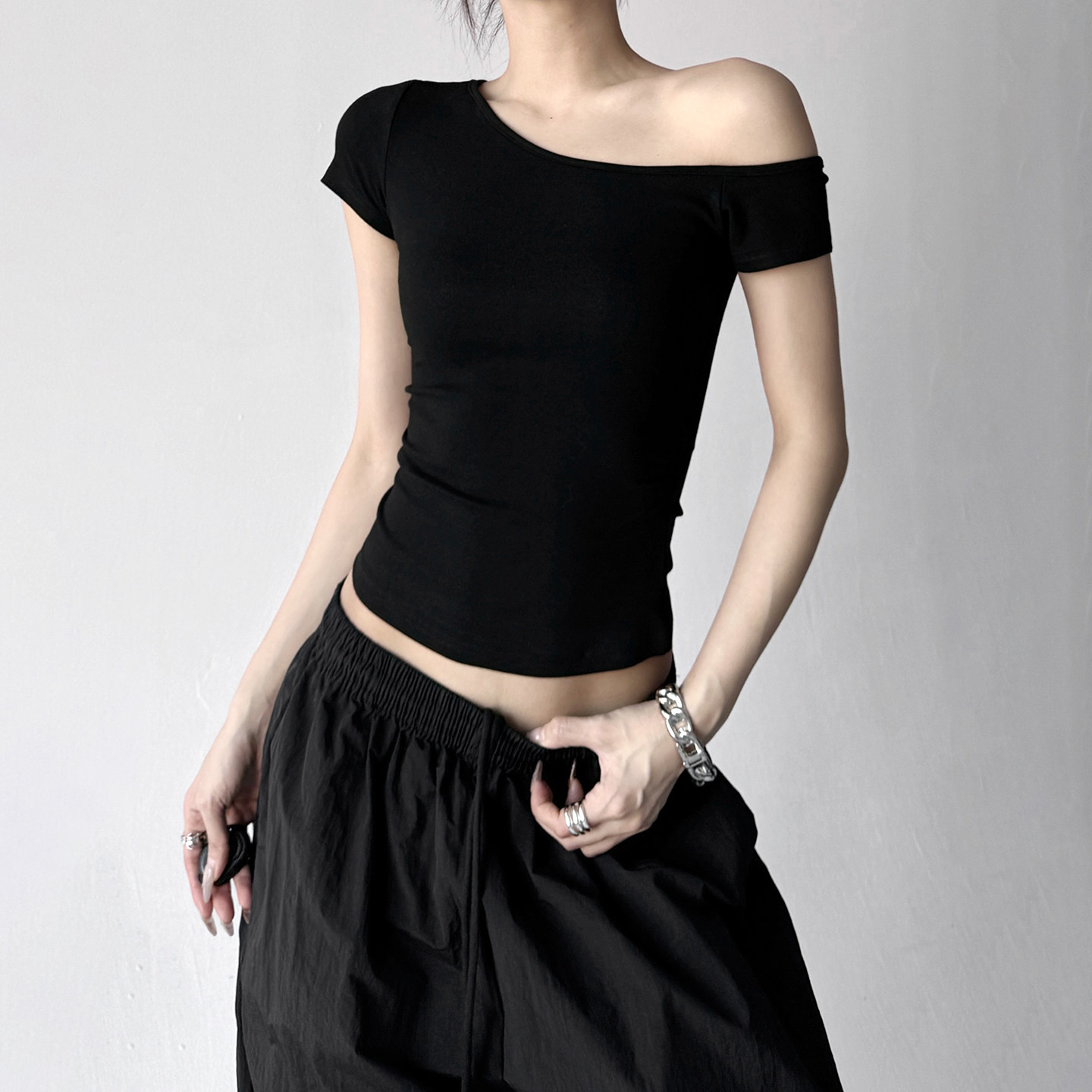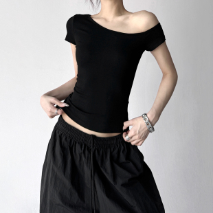 辣妹露肩短款 黑色斜肩短袖 高个子修身 新款 上衣潮 t恤女2026夏季