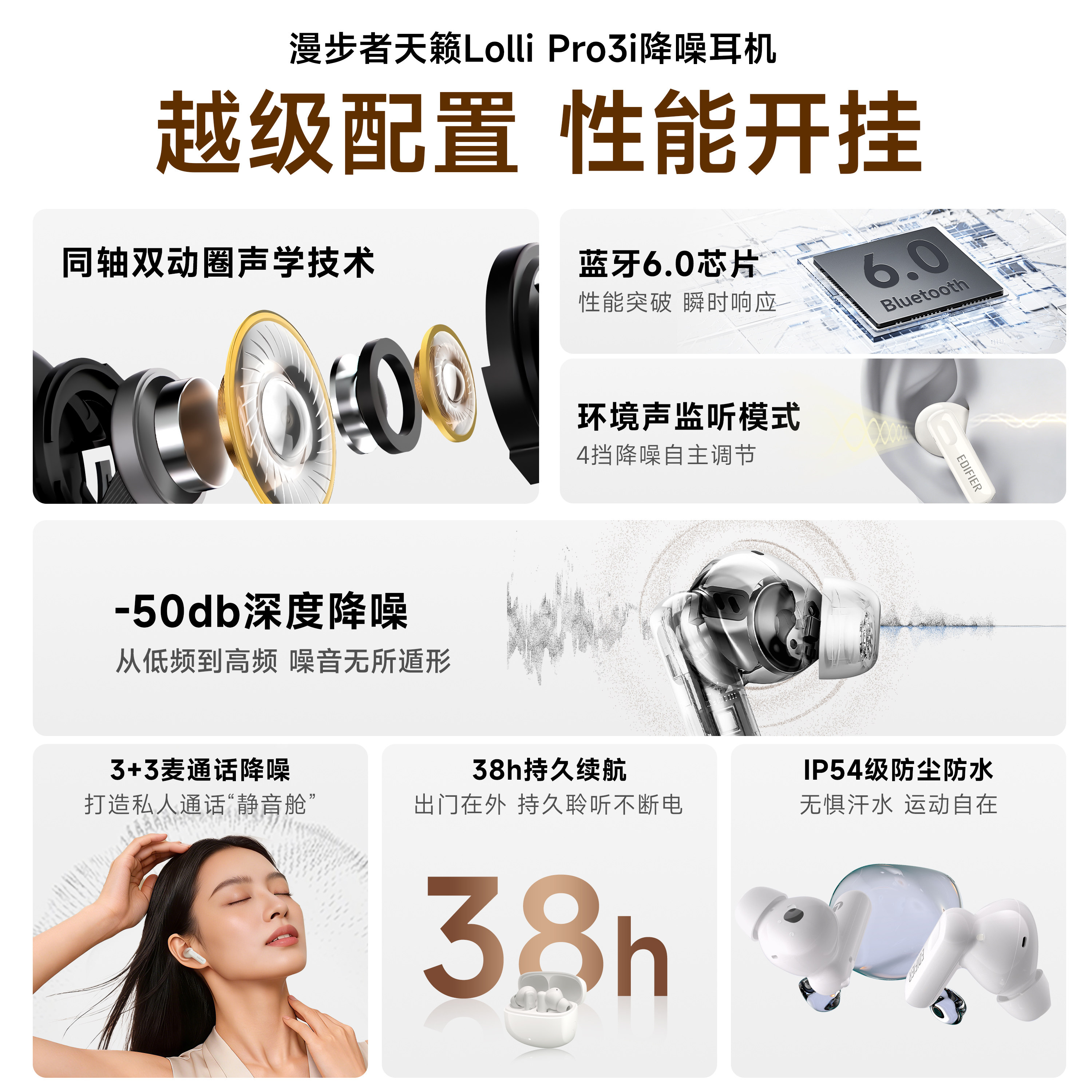 漫步者天籁lollipro3i主动降噪真无线入耳式 运动金标 蓝牙耳机新款