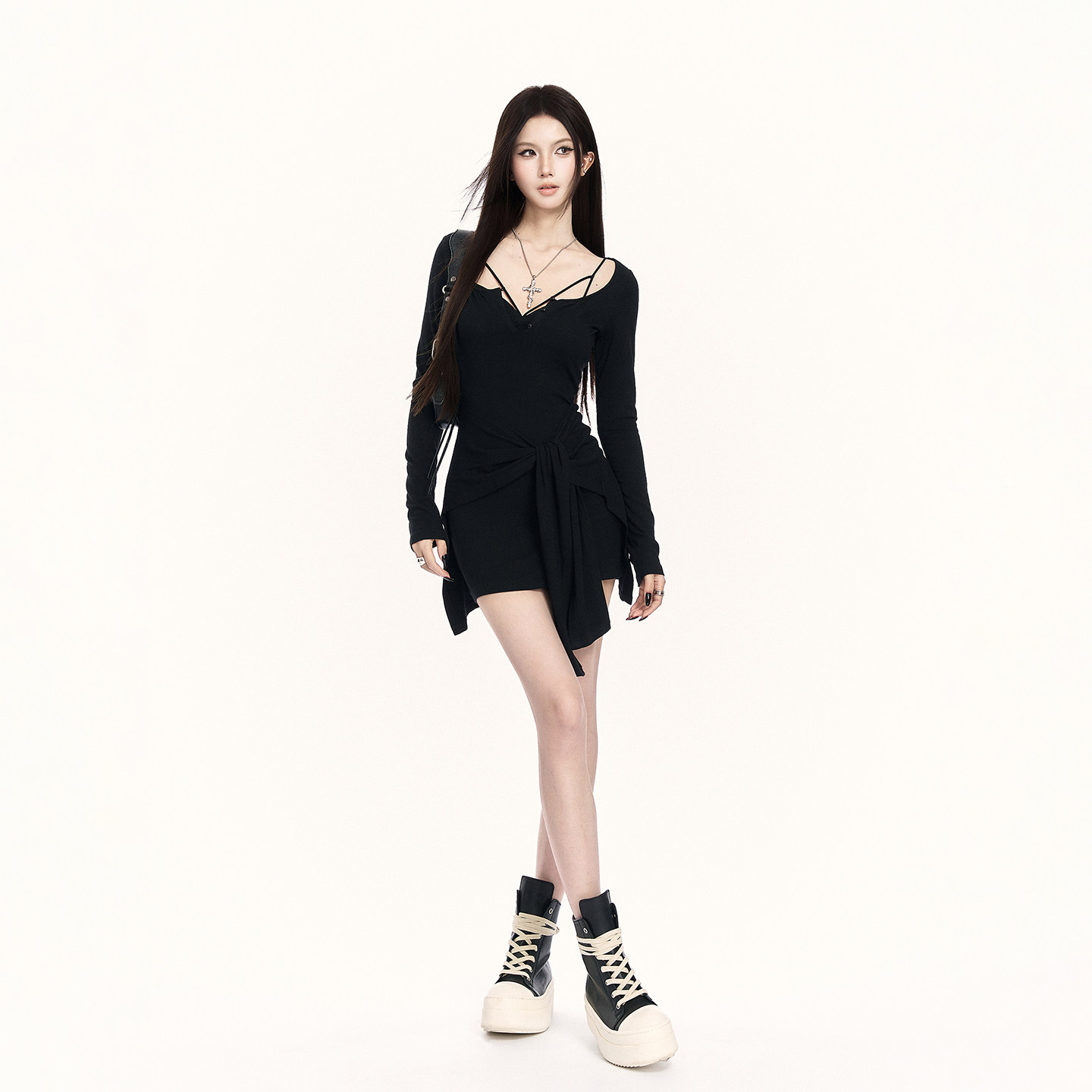 收腰包臀连衣裙 早春休闲辣妹假两件针织打底裙长袖 VOCK 高分出街