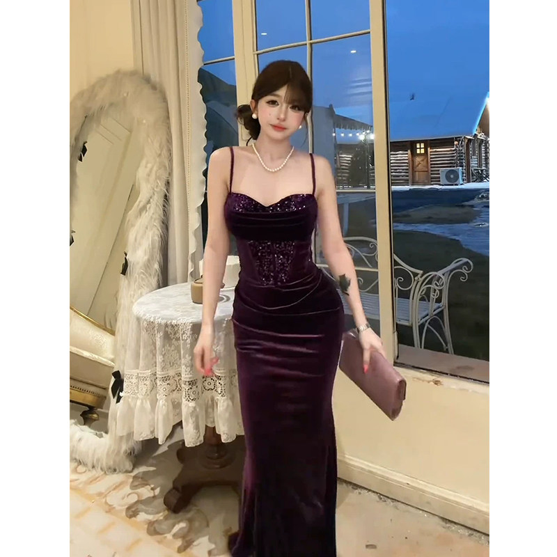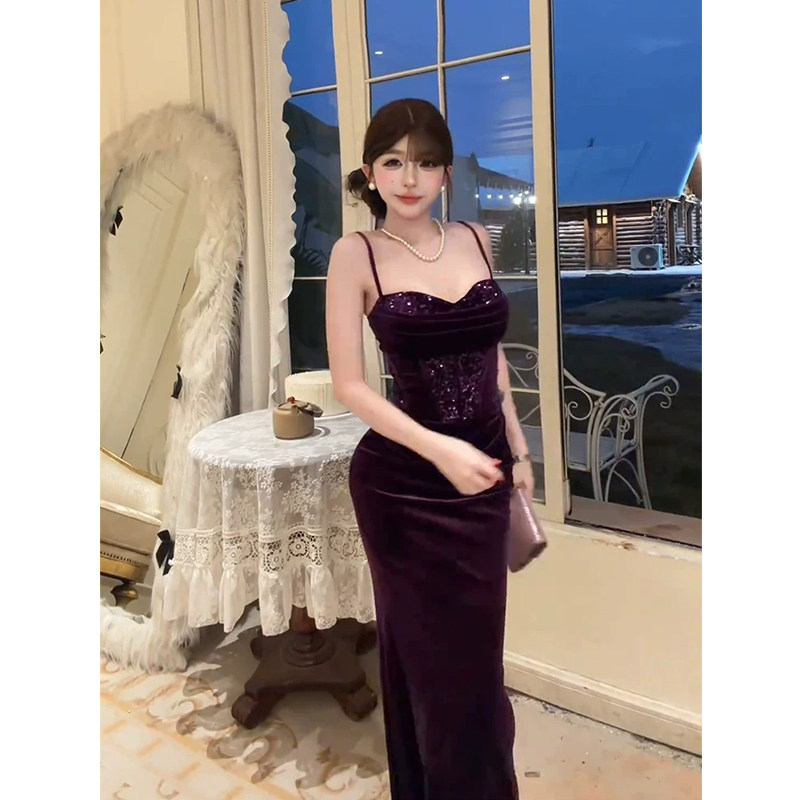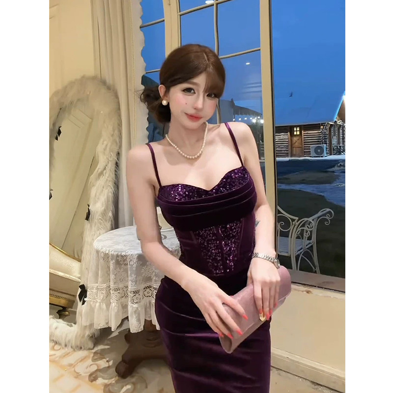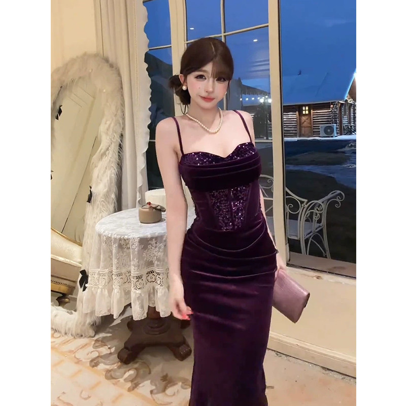 气质礼服包臀长裙 纯欲紫色亮片吊带连衣裙女26年春季 XZY 微胖法式