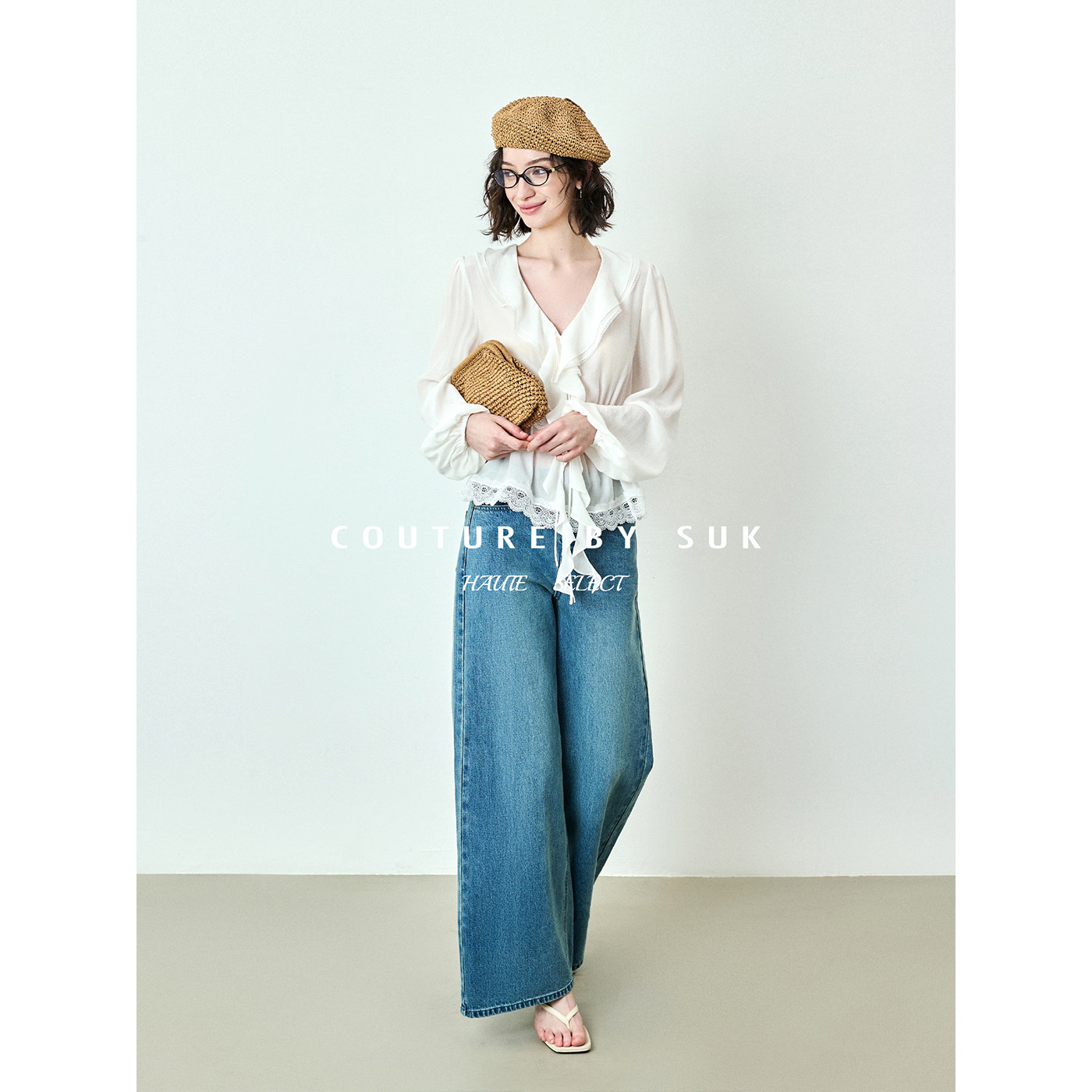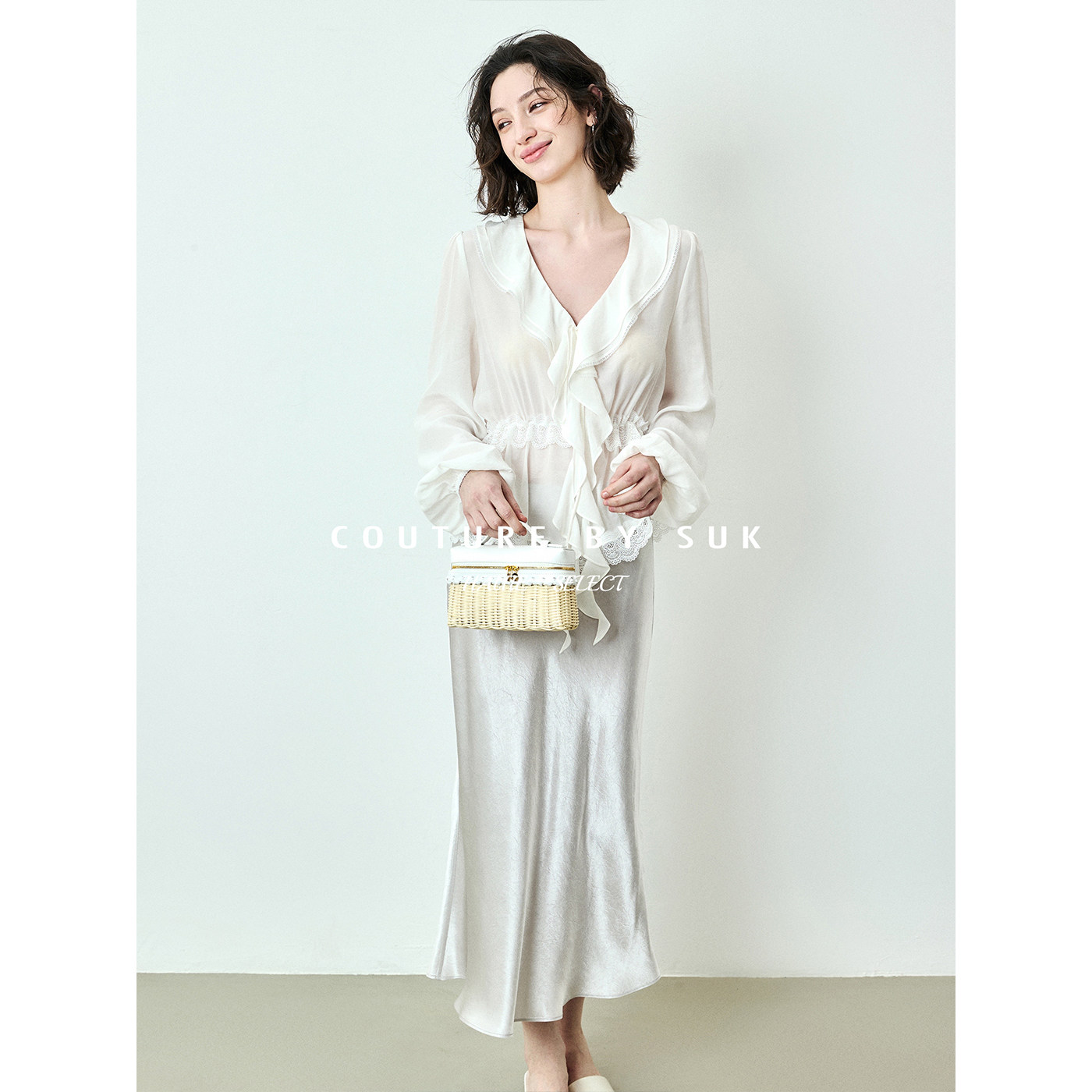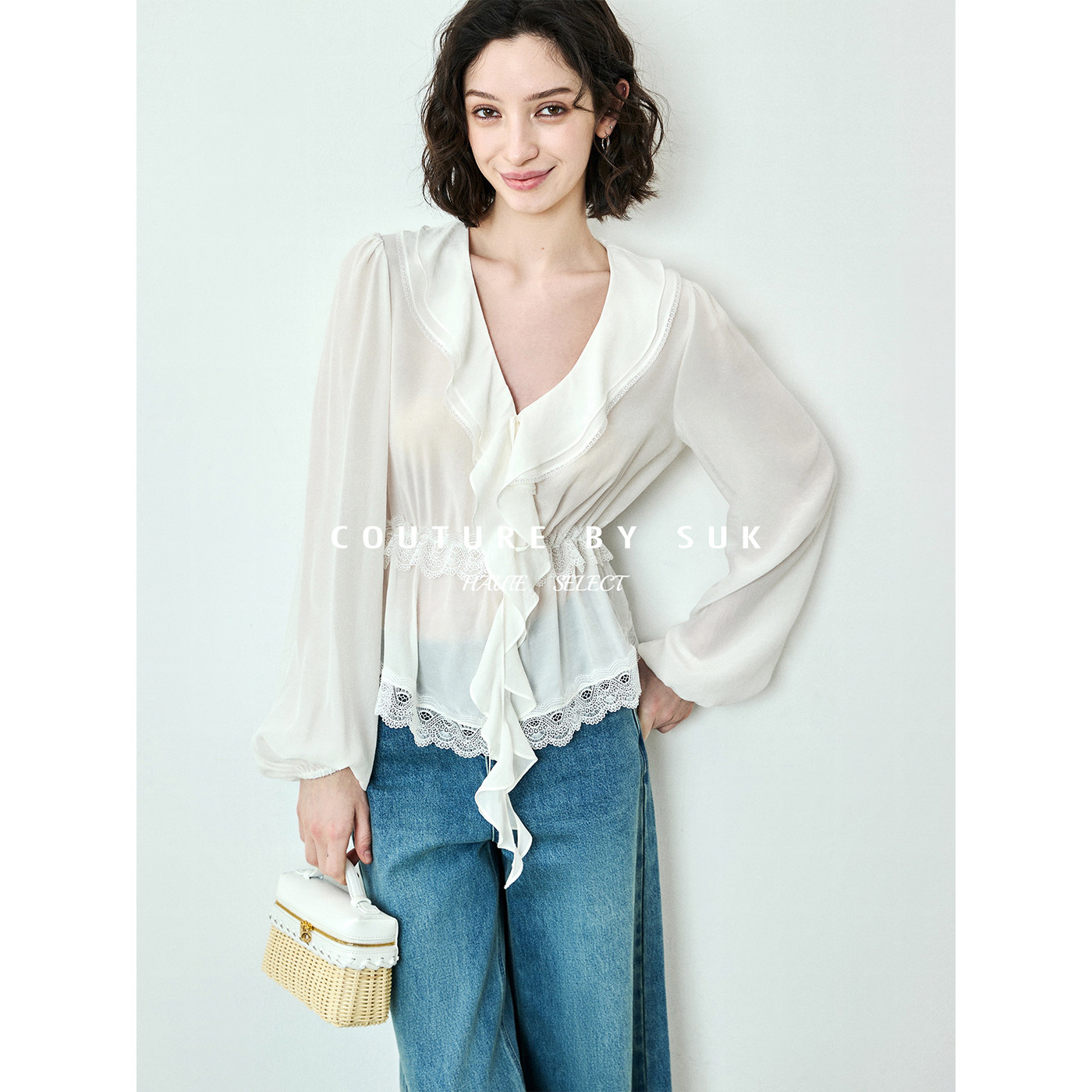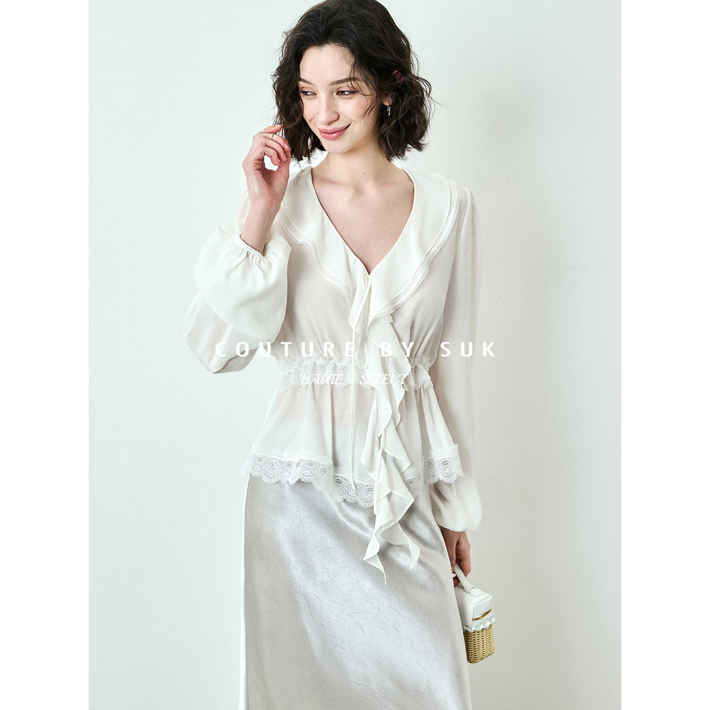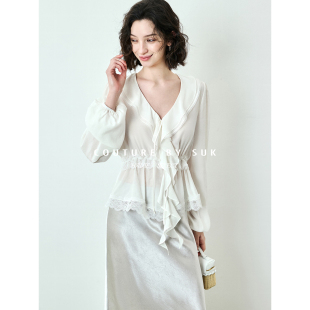 女长袖 SUK 浪漫V领荷叶边系带收腰小衫 法式 上衣白色 如水束腰
