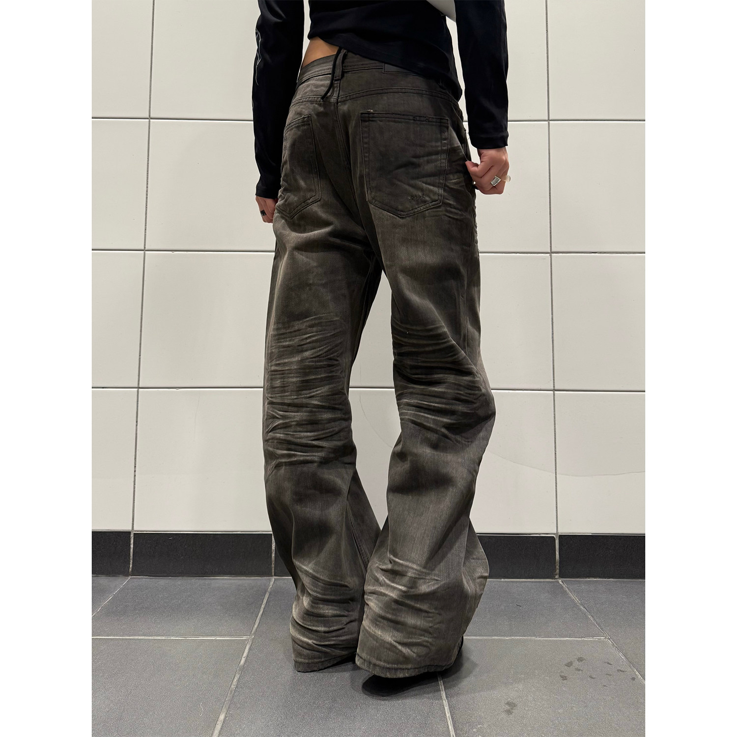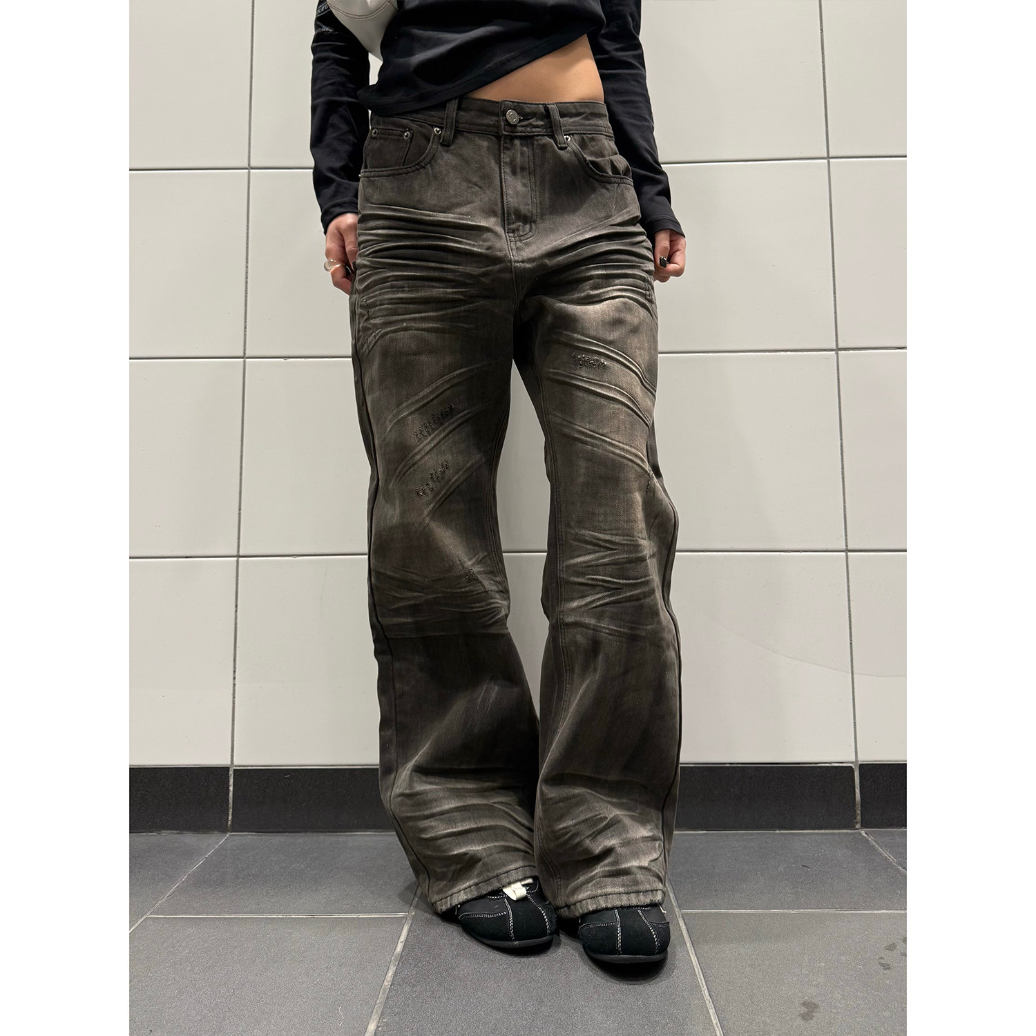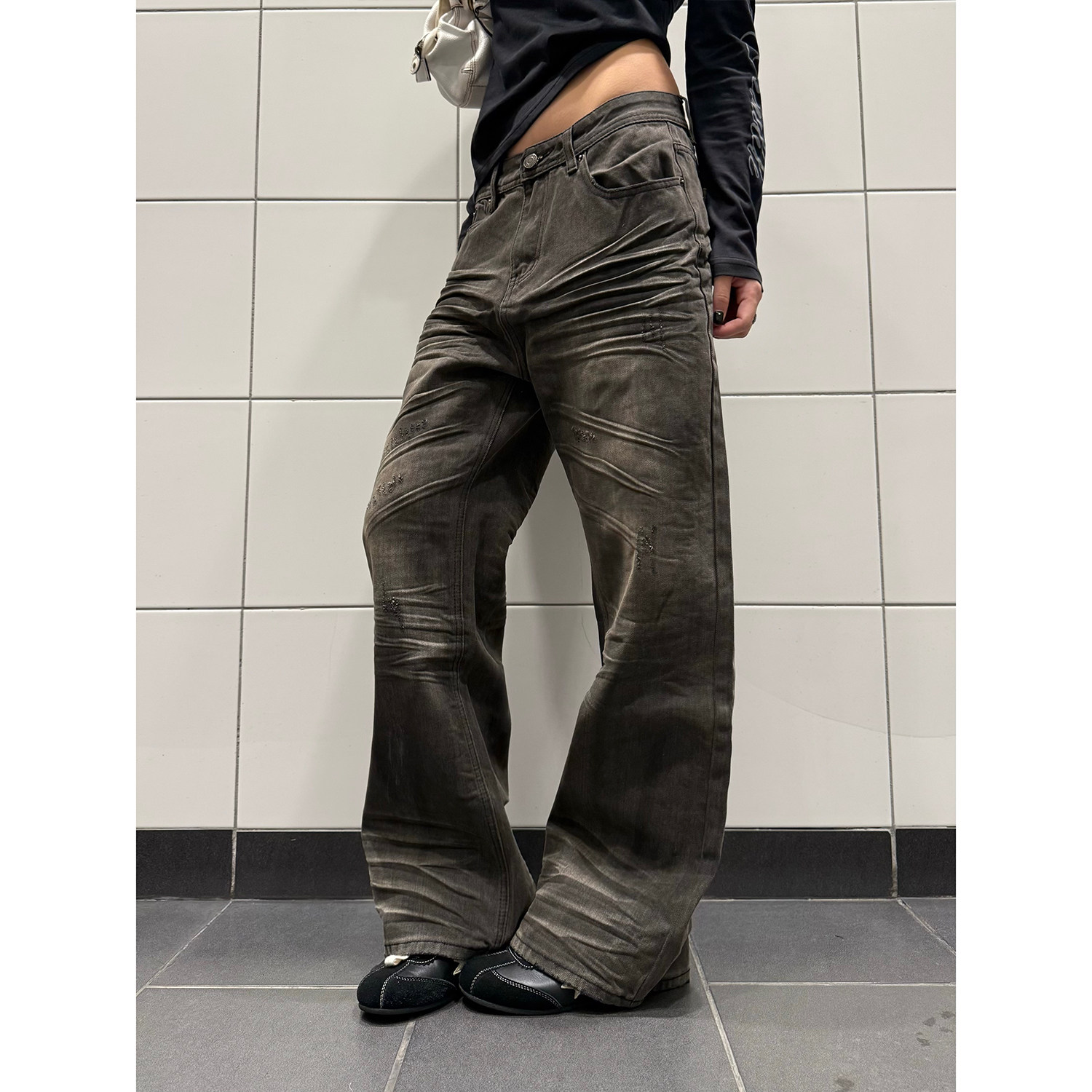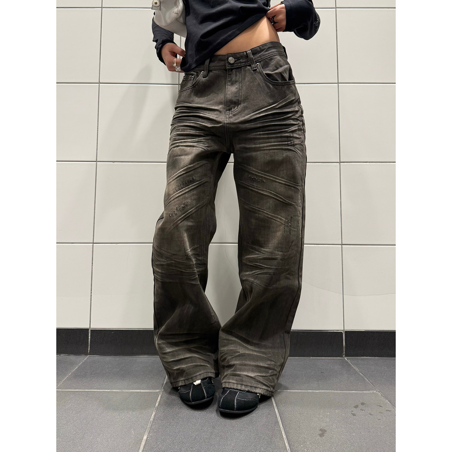 男女宽松直筒显瘦百搭长裤 复古做旧擦脏立体压纹牛仔裤 美式 F383