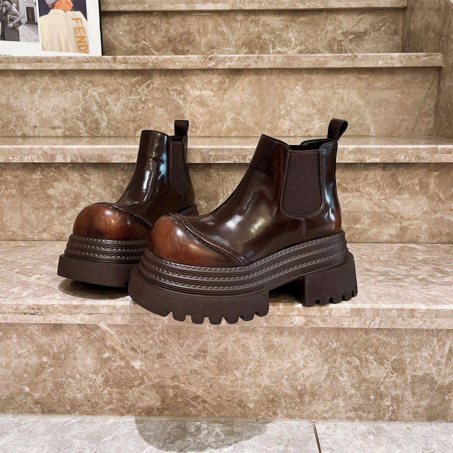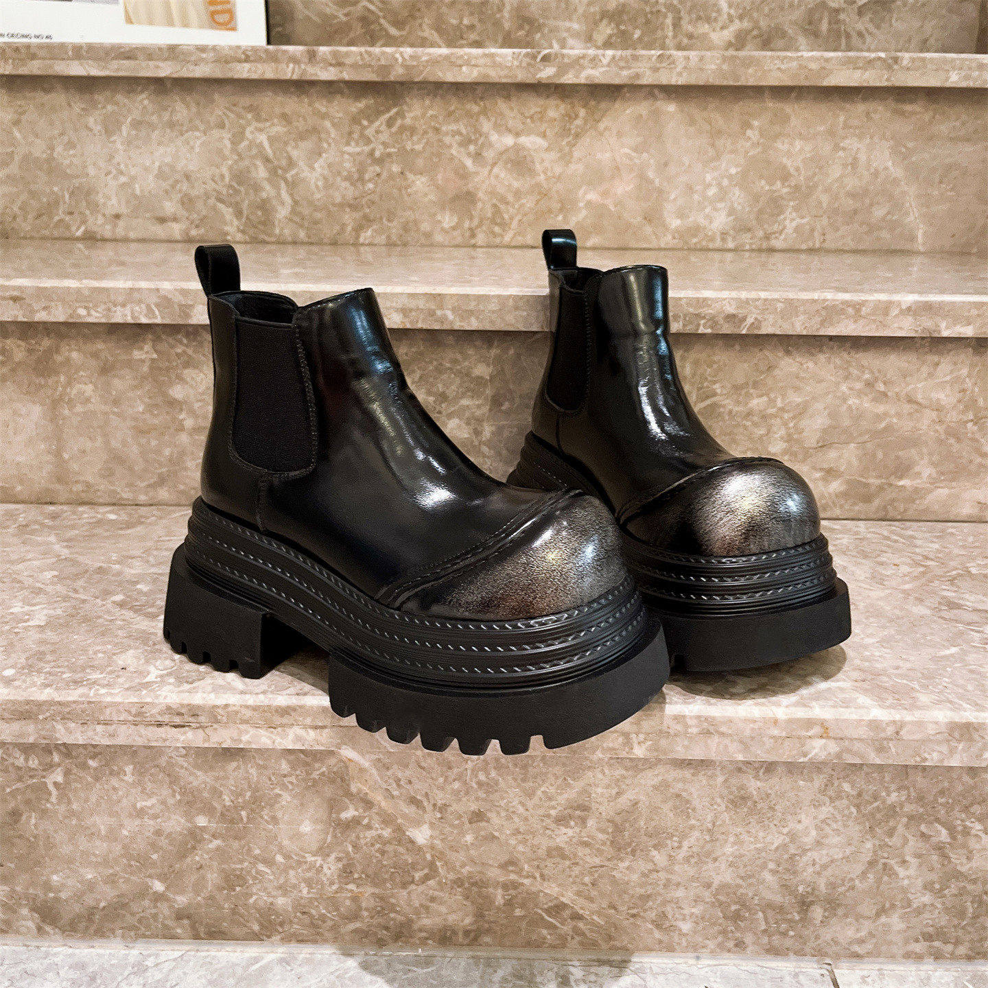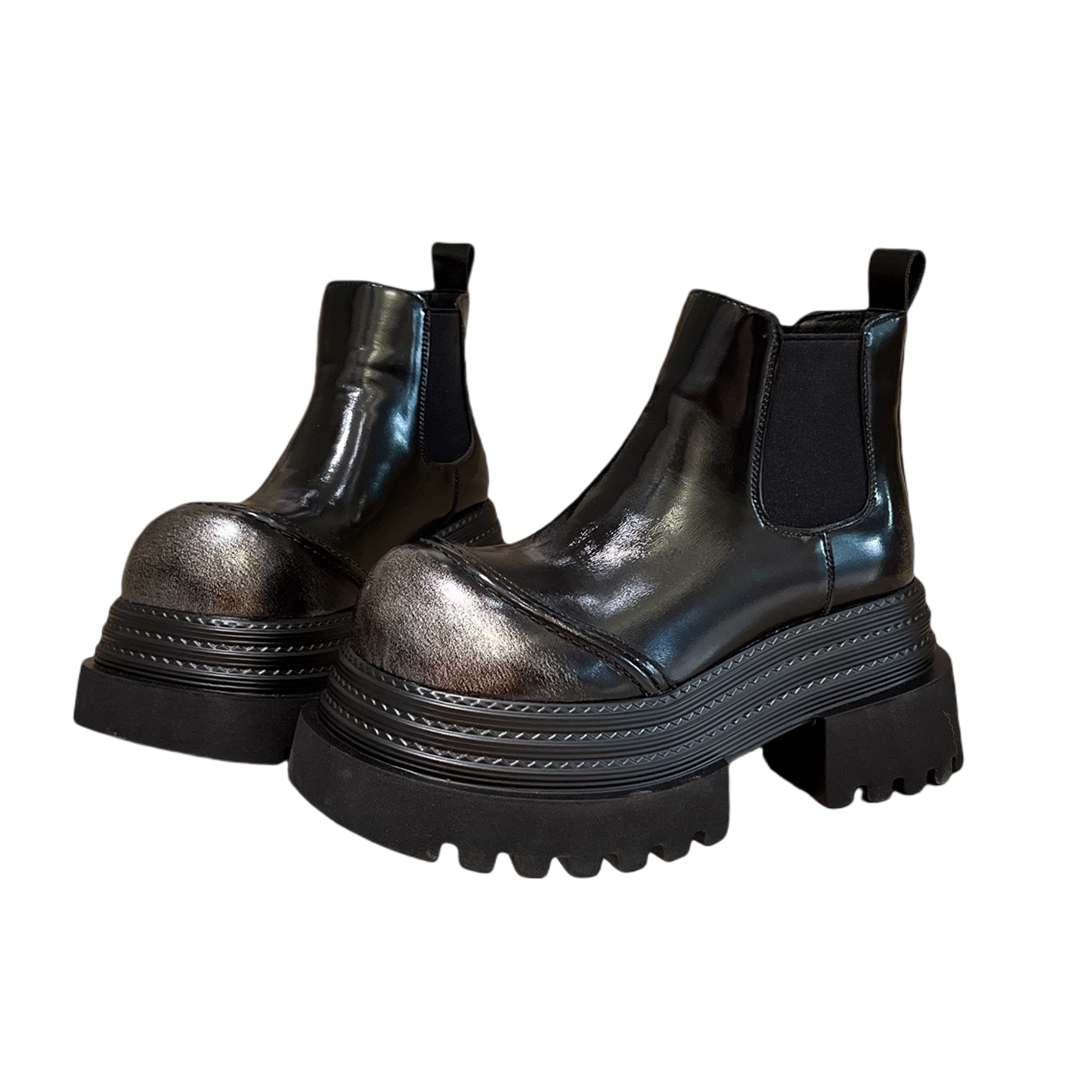 欧洲站真皮大头厚底松糕三层底短靴烟筒靴马丁靴机车靴小个子女鞋