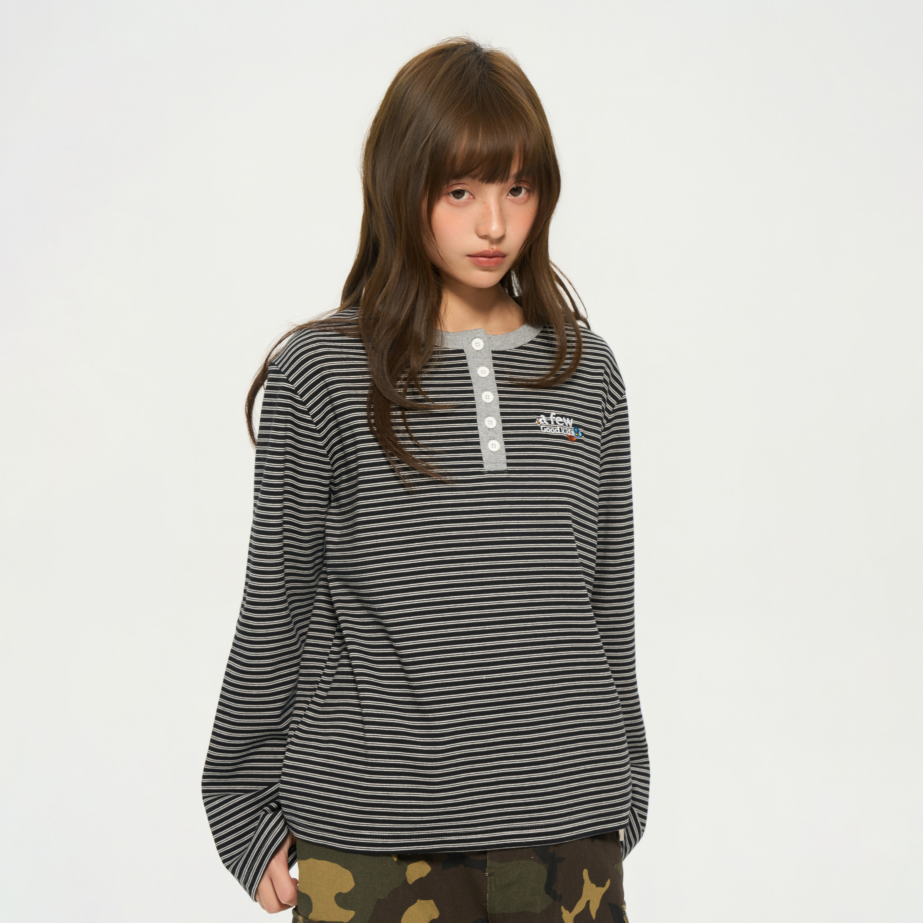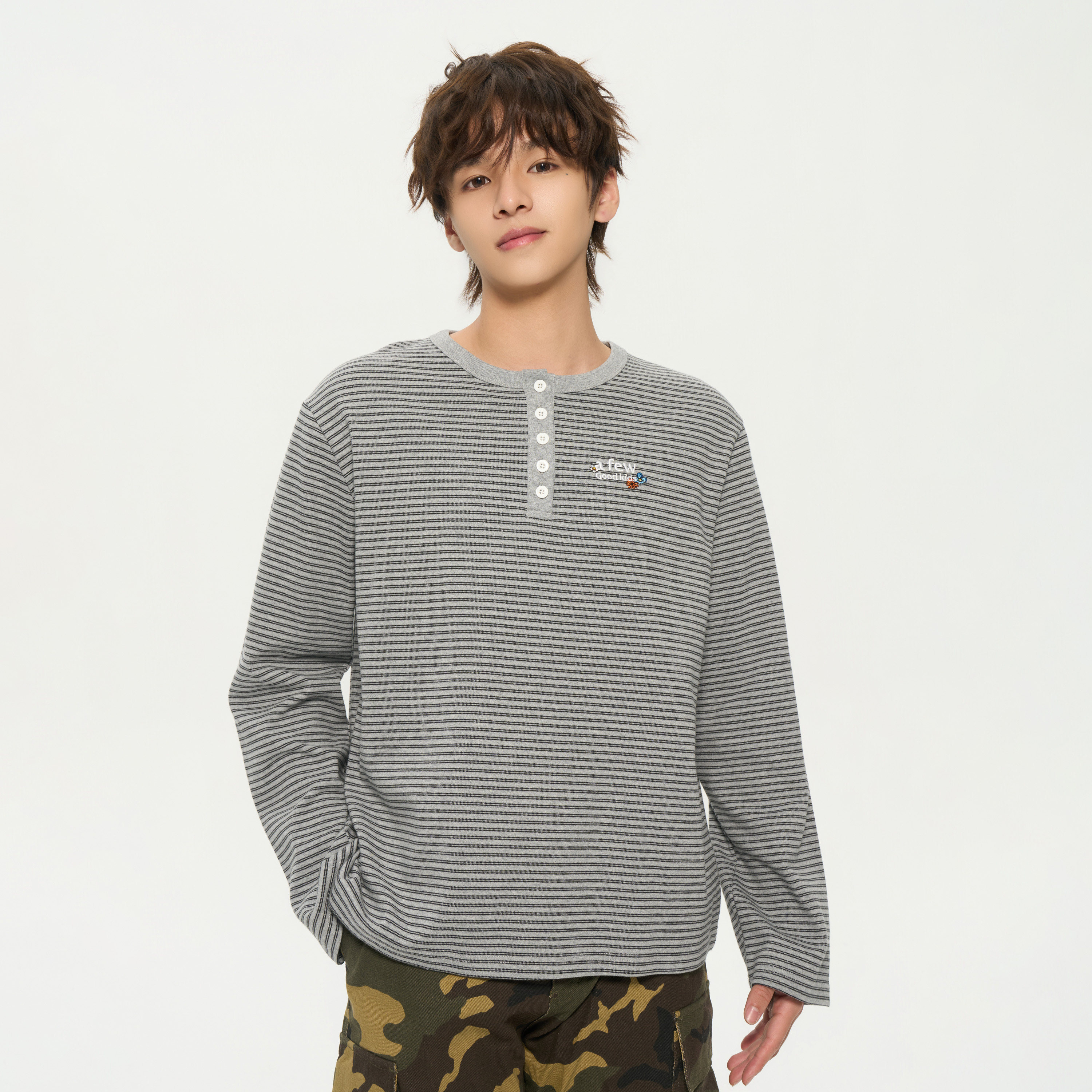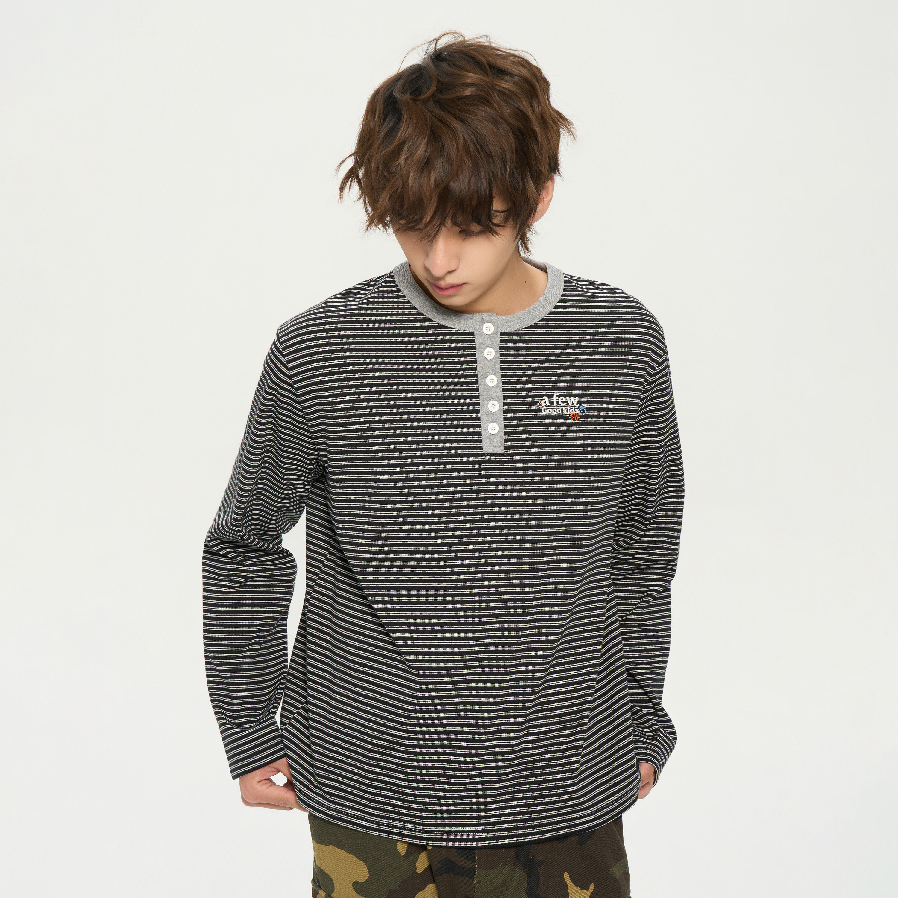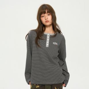 AFGK26SS条纹亨利领长袖 春秋正肩复古宽松上衣情侣休闲基础打底衫
