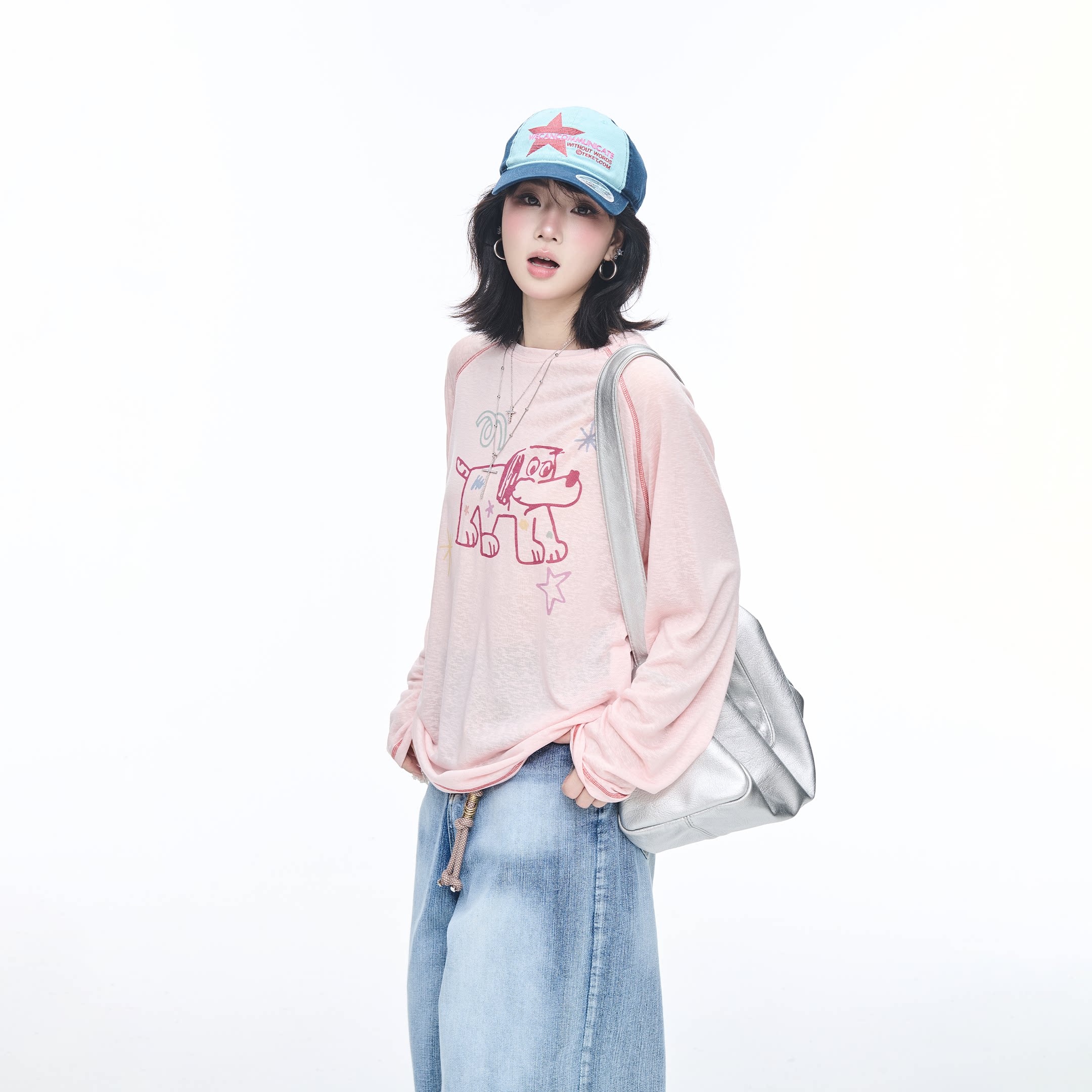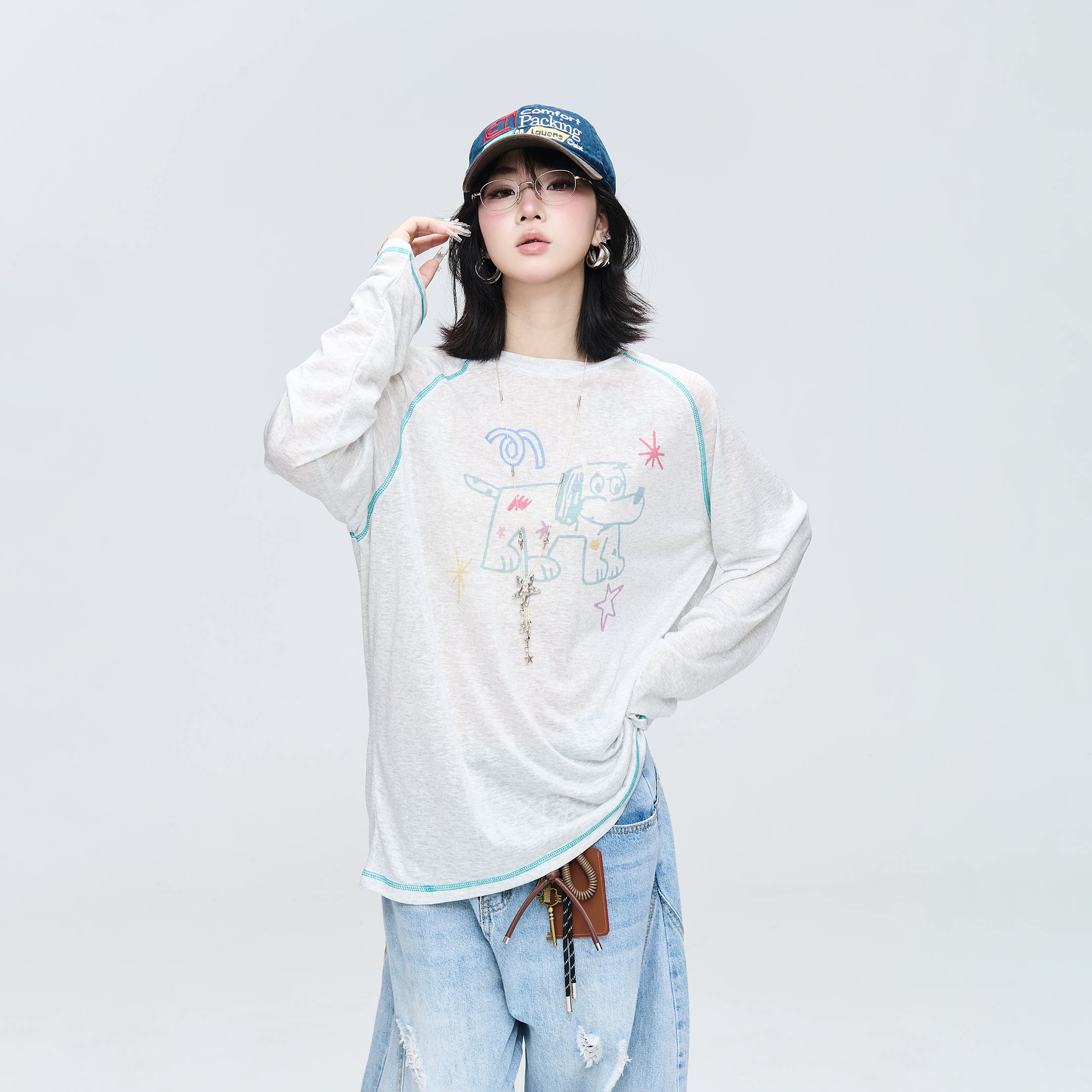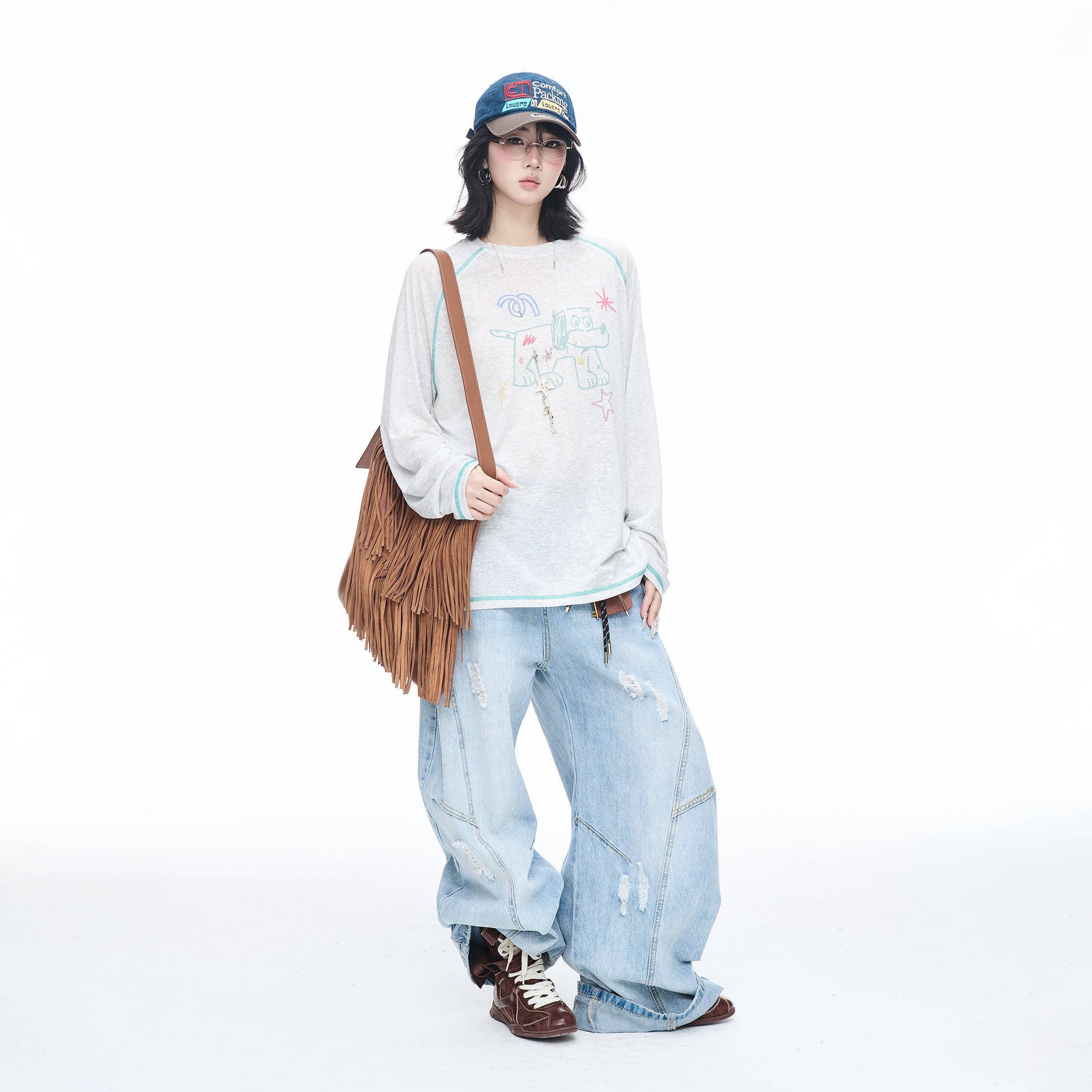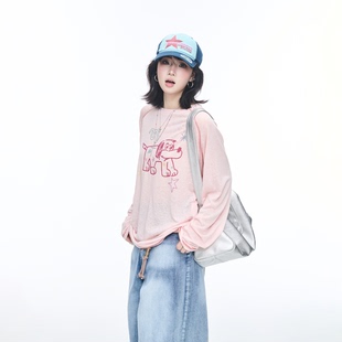 T恤女罩衫 复古印花宽松长袖 休闲慵懒风日常上衣 美式 2026新款
