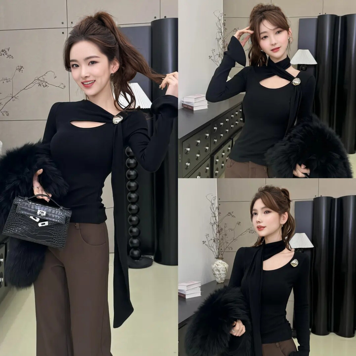 上衣 打底衫 气质辣妹风斜肩飘带设计感长袖 T恤女秋冬一衣多穿时尚