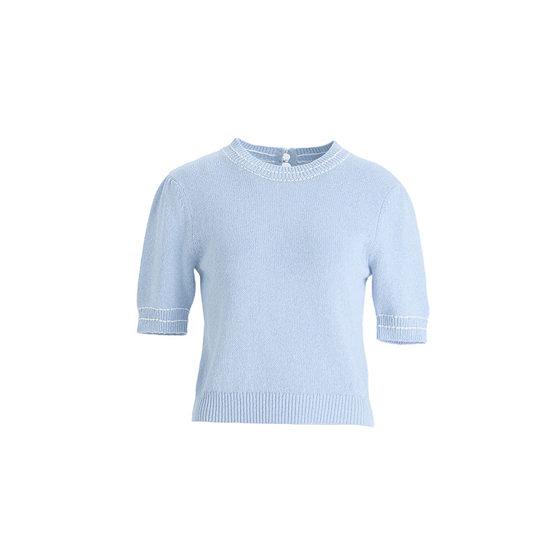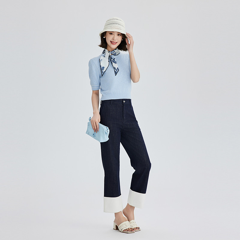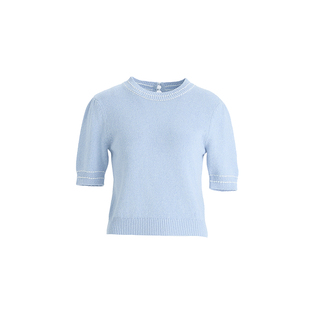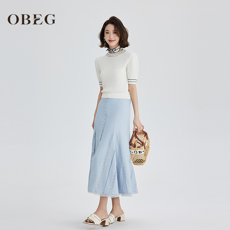 OBEG欧碧倩韩系温柔风亚麻针织短袖 撞色设计感上衣10502019 女夏季