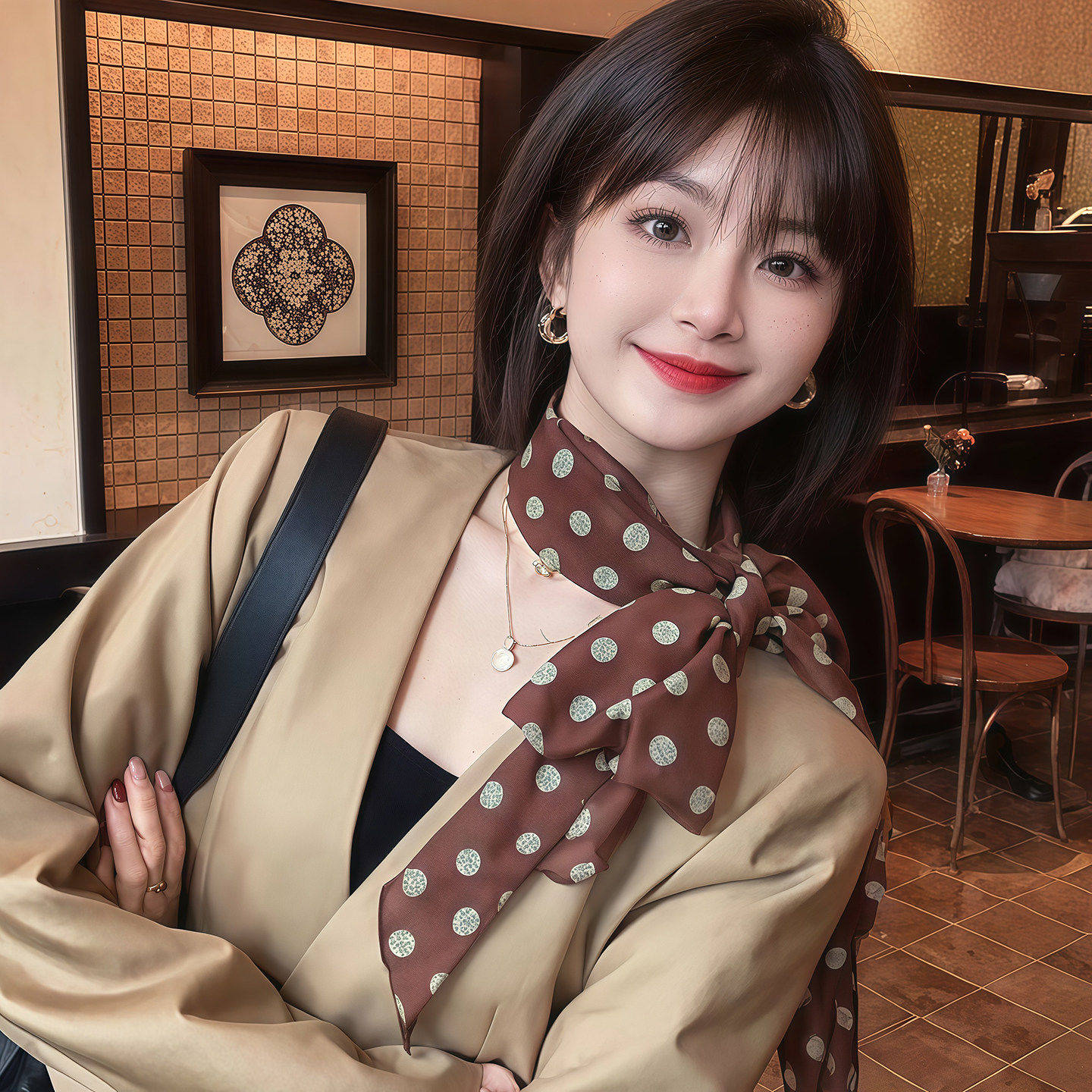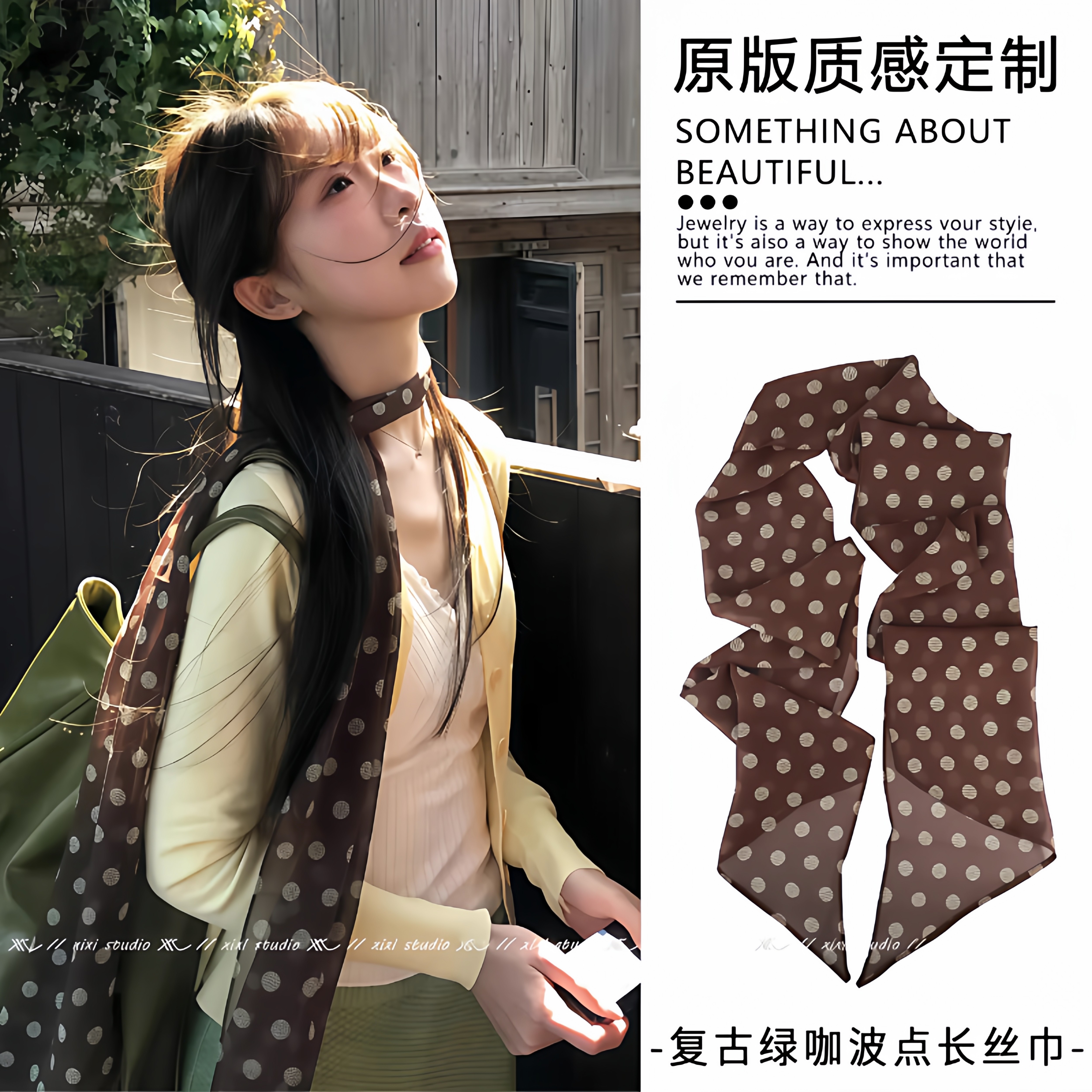 棕色波点丝巾印花高级百搭配饰系脖女2026年新款 发带绑发长条围巾