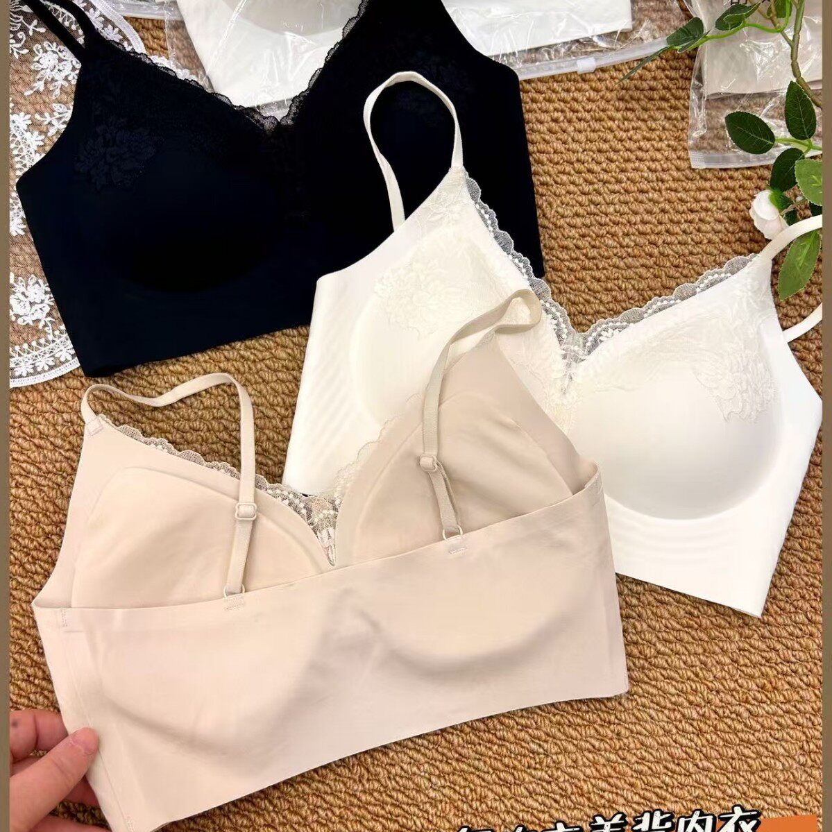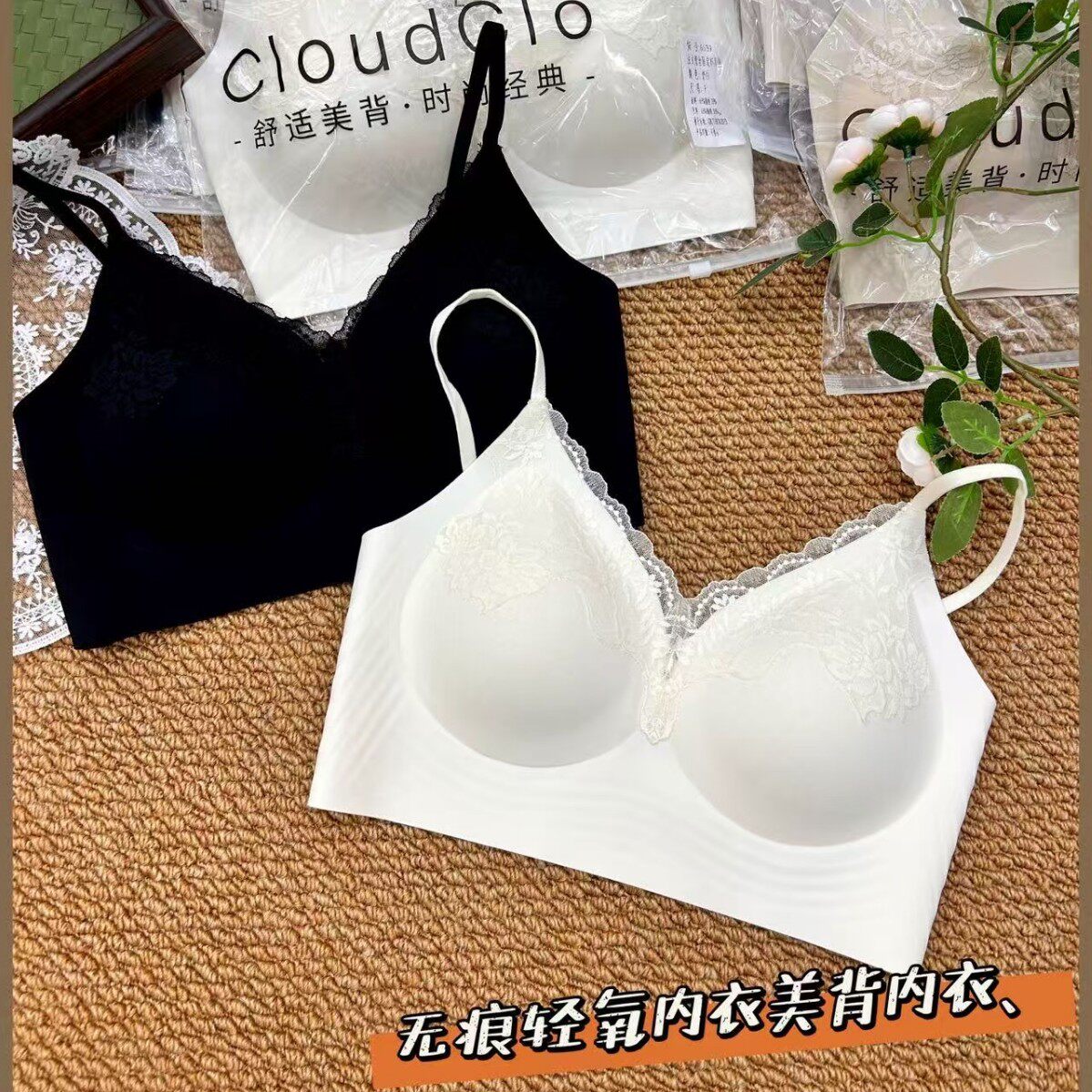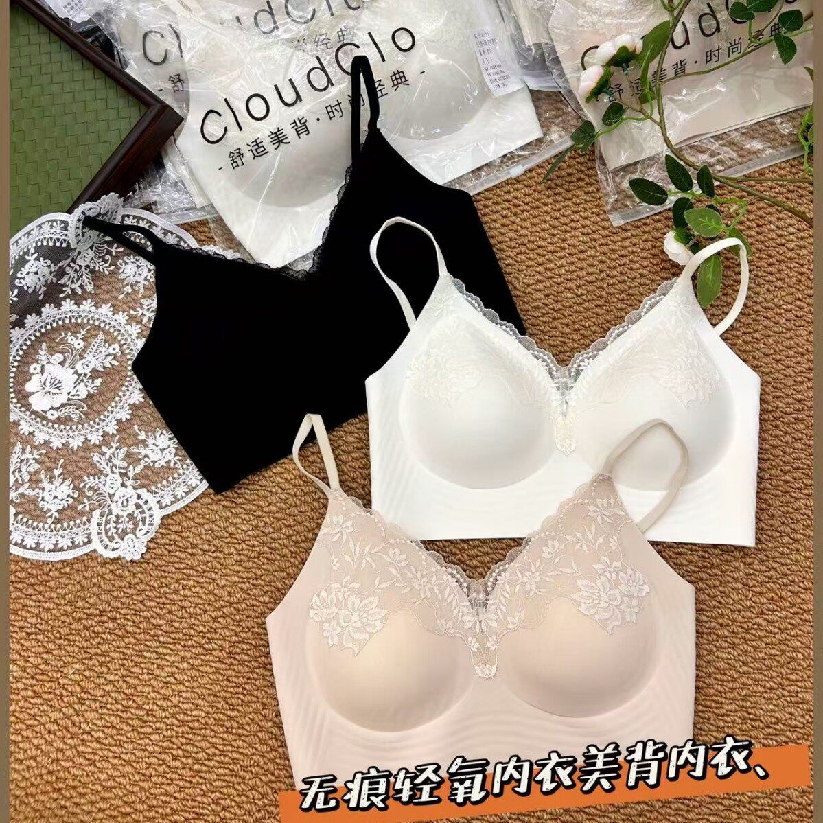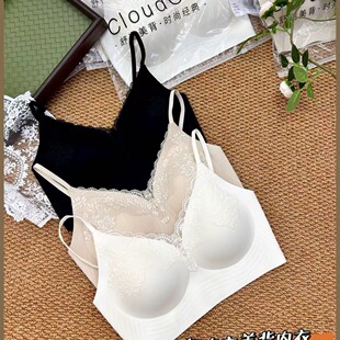新品 蕾丝无钢圈聚拢文胸女美背固定杯性感内衣无痕 粉底液隐形法式