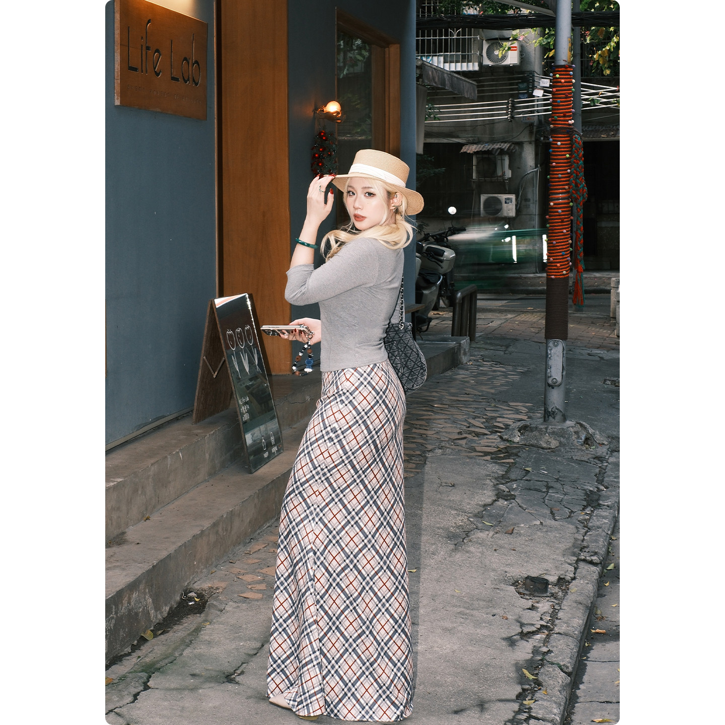 糯米子 复古格纹半身裙格子姐系miu风高腰鱼尾A字裙 超模格本