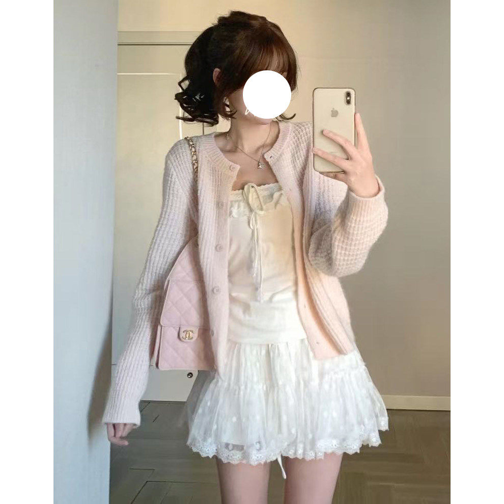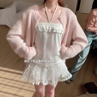 慵懒小香风粉色华夫格针织开衫 外套 女春秋韩系外搭马海毛毛衣罩衫