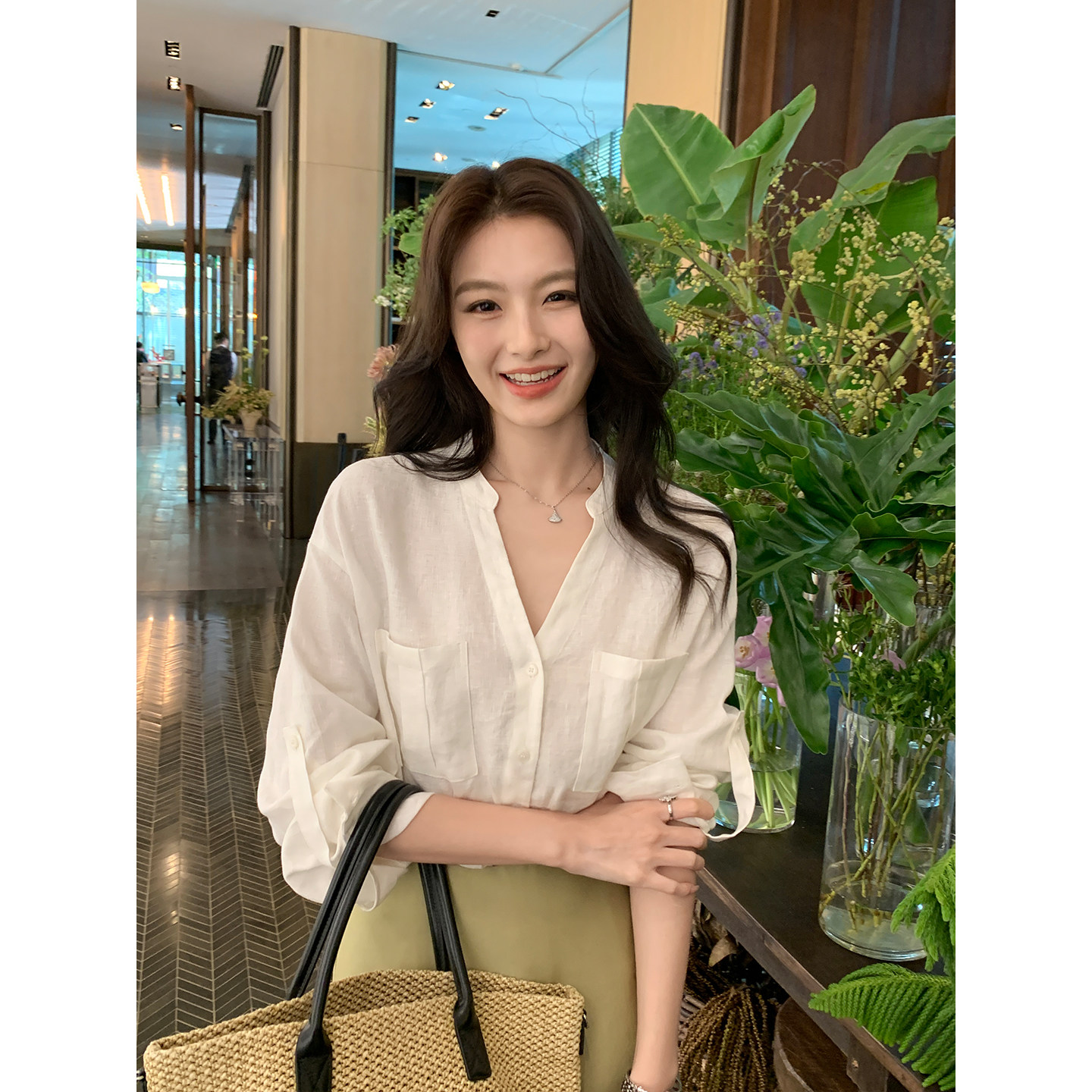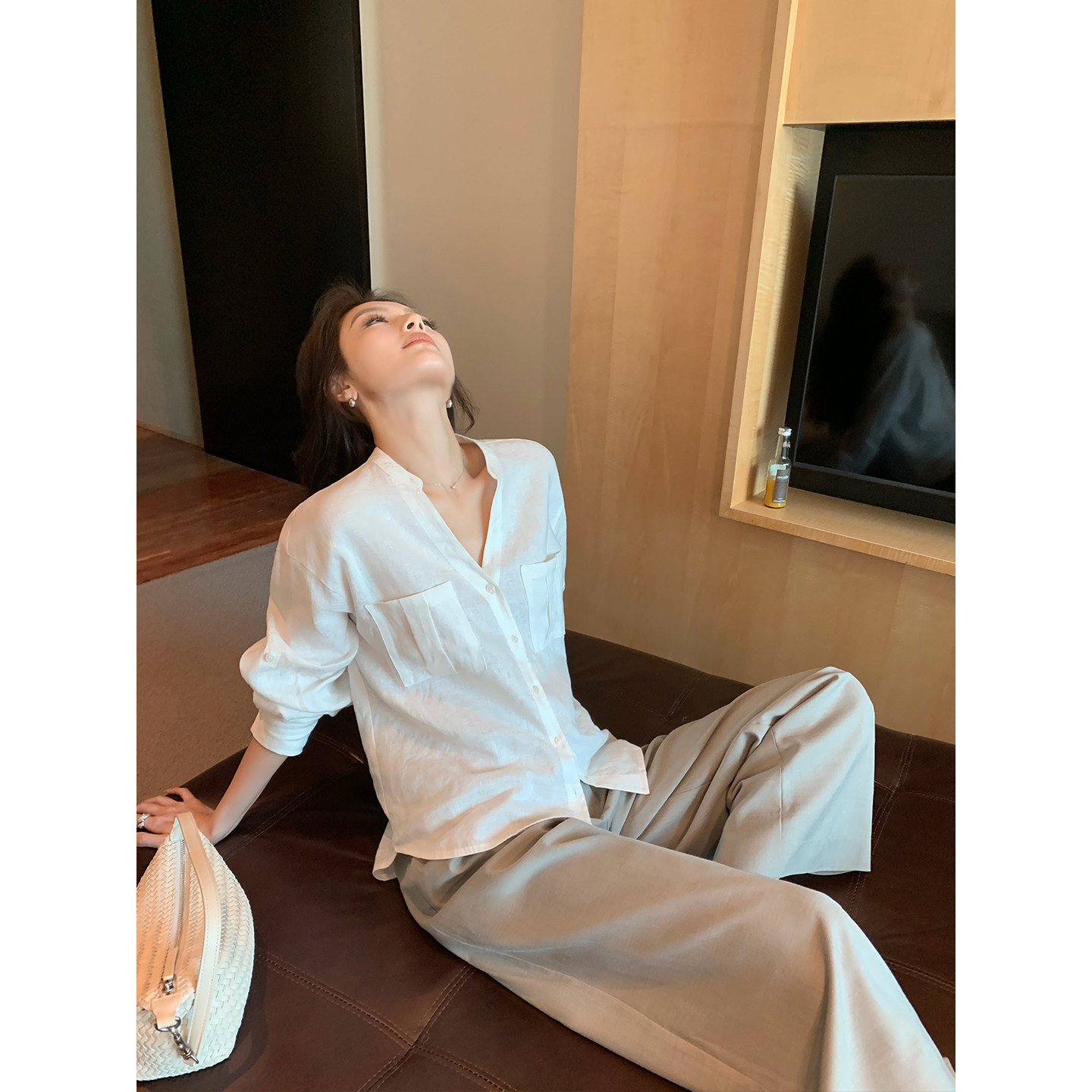 女宽松慵懒感防晒长袖 Maven 1OO亚麻v领衬衫 雅致格调 衬衣 Lin