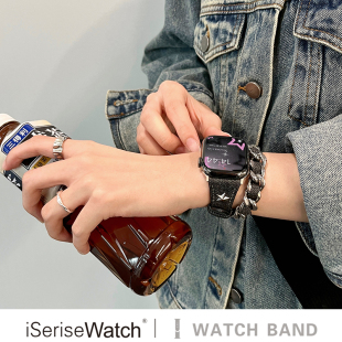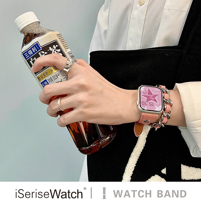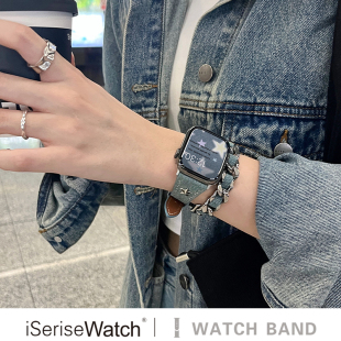 iserisewatch适用于applewatch11表带iwatchs10皮质金属苹果手表s8 7se高级双圈新41mm45小众女夏天牛仔星星